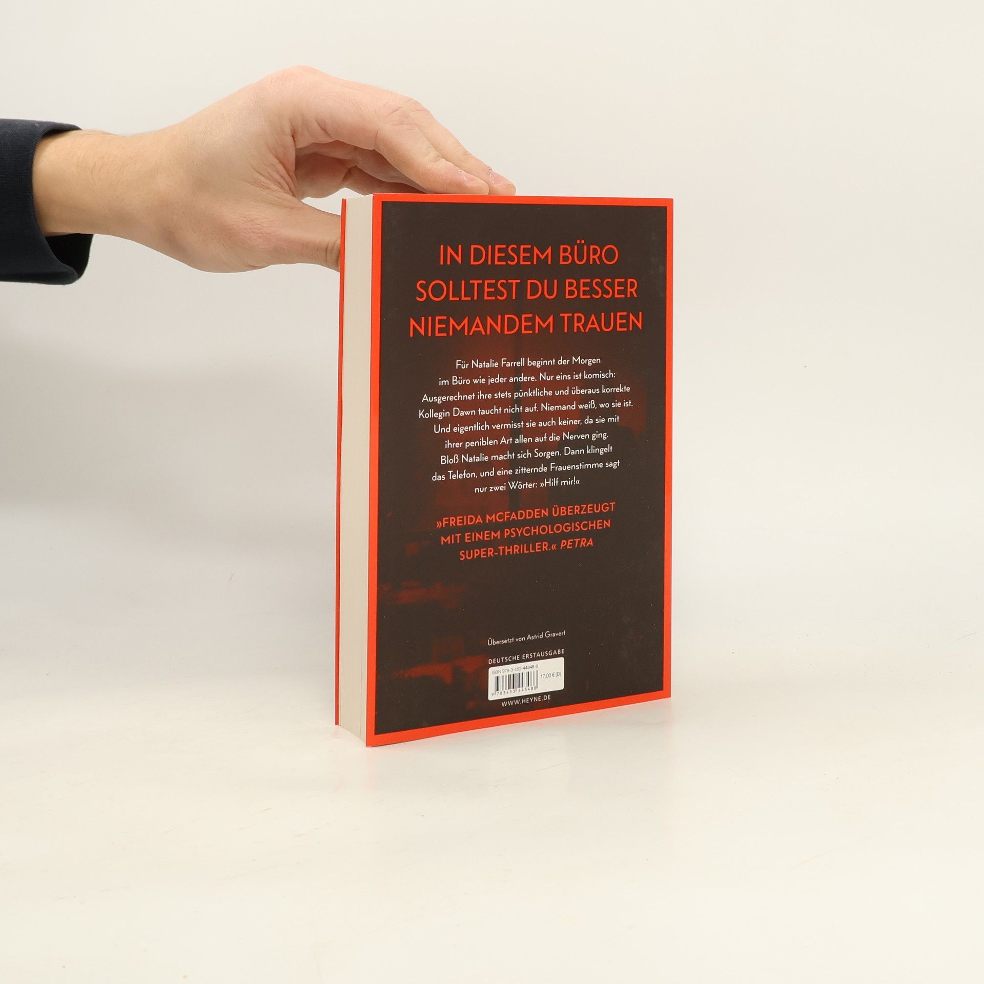 Zwei Frauen. Ein Büro. Ein schreckliches Verbrechen. Mit farbig gestaltetem Buchschnitt in limitierter Erstauflage Dawn Schiff ist seltsam. Darin sind sich ihre Kollegen einig. Sie sagt nie das Richtige. Sie hat keine Freunde. Aber sie ist jeden Morgen um Punkt 8:45 Uhr an ihrem Platz in der Firma, in der sie als Buchhalterin arbeitet. Bis sie eines Morgens nicht auftaucht. Dawns Kollegin Natalie Farrell wundert sich. Dann erhält sie einen anonymen Anruf und fährt zu Dawns Wohnung. Keine Spur von ihrer Kollegin. Doch Natalie bietet sich ein Bild des Grauens. Eins scheint bald klar: Jemand muss Dawn so sehr gehasst haben, dass er sie getötet hat. War es jemand aus ihrem Büro? Je mehr Natalie herausfindet, desto tiefer verstrickt sie sich selbst in ein Netz aus Lügen und Gewalt, aus dem es kein Entkommen gibt. Mit farbig gestaltetem Buchschnitt