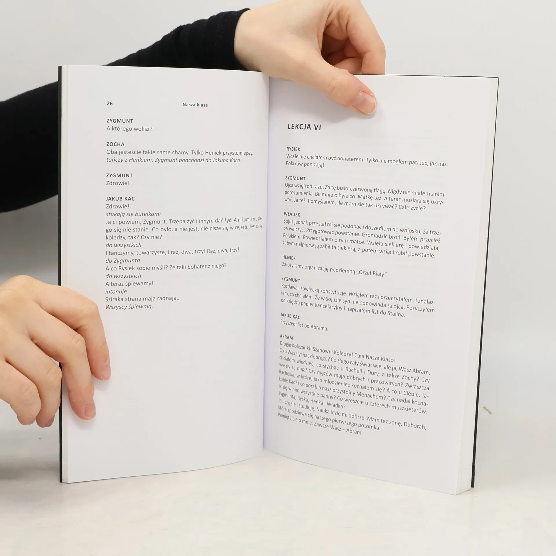 Historia dziesięciu uczniów z jednej klasy – Polaków i Żydów – opowiedziana od roku 1925 aż po współczesność. Koleżanki i koledzy wspólnie bawią się i śpiewają. Wraz z nadejściem dorosłości zgodne zabawy się kończą. Wybucha wojna, do miasteczka wkracza najpierw radzieckie, a potem niemieckie wojsko. Antysemityzm wybucha w serii gwałtów, morderstw, tortur i kulminuje w masowym pogromie. Niemal wszyscy miejscowi Żydzi giną spaleni w stodole albo zamordowani na rynku. Nielicznym udaje się cudem przeżyć. Przemoc nie ustępuje wraz z zakończeniem wojny. Zaczyna się rozliczanie przeszłości, której tak naprawdę rozliczyć się nie da. Nasza klasa to wstrząsająca opowieść o skomplikowanych relacjach polsko-żydowskich w XX wieku, o zbiorowej winie, o prawdzie, która okazuje się nikomu niepotrzebna, oraz o historii, której nie da się osądzić, odtworzyć ani nawet wytłumaczyć.
