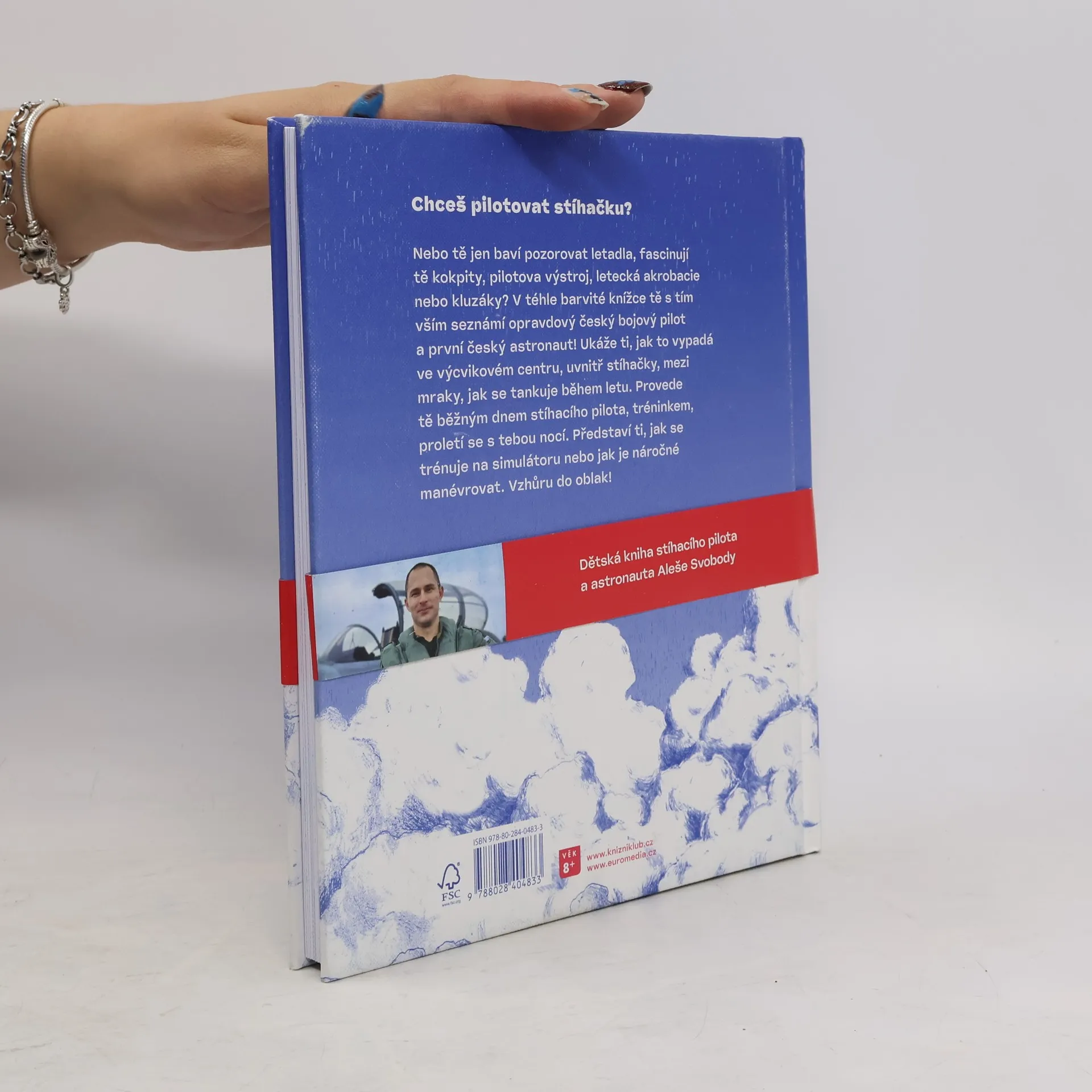 Chceš pilotovat stíhačku? Nebo tě jen baví pozorovat letadla, fascinují tě kokpity, pilotova výstroj, letecká akrobacie nebo kluzáky? V téhle barvité knížce tě s tím vším seznámí opravdový český bojový pilot a první český astronaut! Ukáže ti, jak to vypadá ve výcvikovém centru, uvnitř stíhačky, mezi mraky, jak se tankuje během letu. Provede tě běžným dnem stíhacího pilota, tréninkem, proletí se s tebou nocí. Představí ti to, jak se trénuje na simulátoru nebo jak je náročné manévrovat. Vzhůru do oblak!