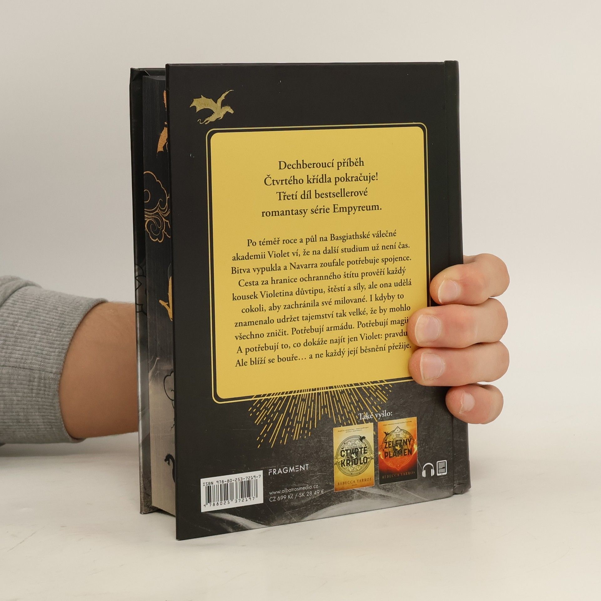 Dechberoucí příběh Čtvrtého křídla pokračuje! Třetí díl bestsellerové romantasy série Empyreum. Po téměř roce a půl na Basgiathské válečné akademii Violet ví, že na další studium už není čas. Bitva vypukla a Navarra zoufale potřebuje spojence. Cesta za hranice ochranného štítu prověří každý kousek Violetina důvtipu, štěstí a síly, ale ona udělá cokoli, aby zachránila své milované. I kdyby to znamenalo udržet tajemství tak velké, že by mohlo všechno zničit. Potřebují armádu. Potřebují magii. A potřebují to, co dokáže najít jen Violet: pravdu. Ale blíží se bouře… a ne každý její běsnění přežije.