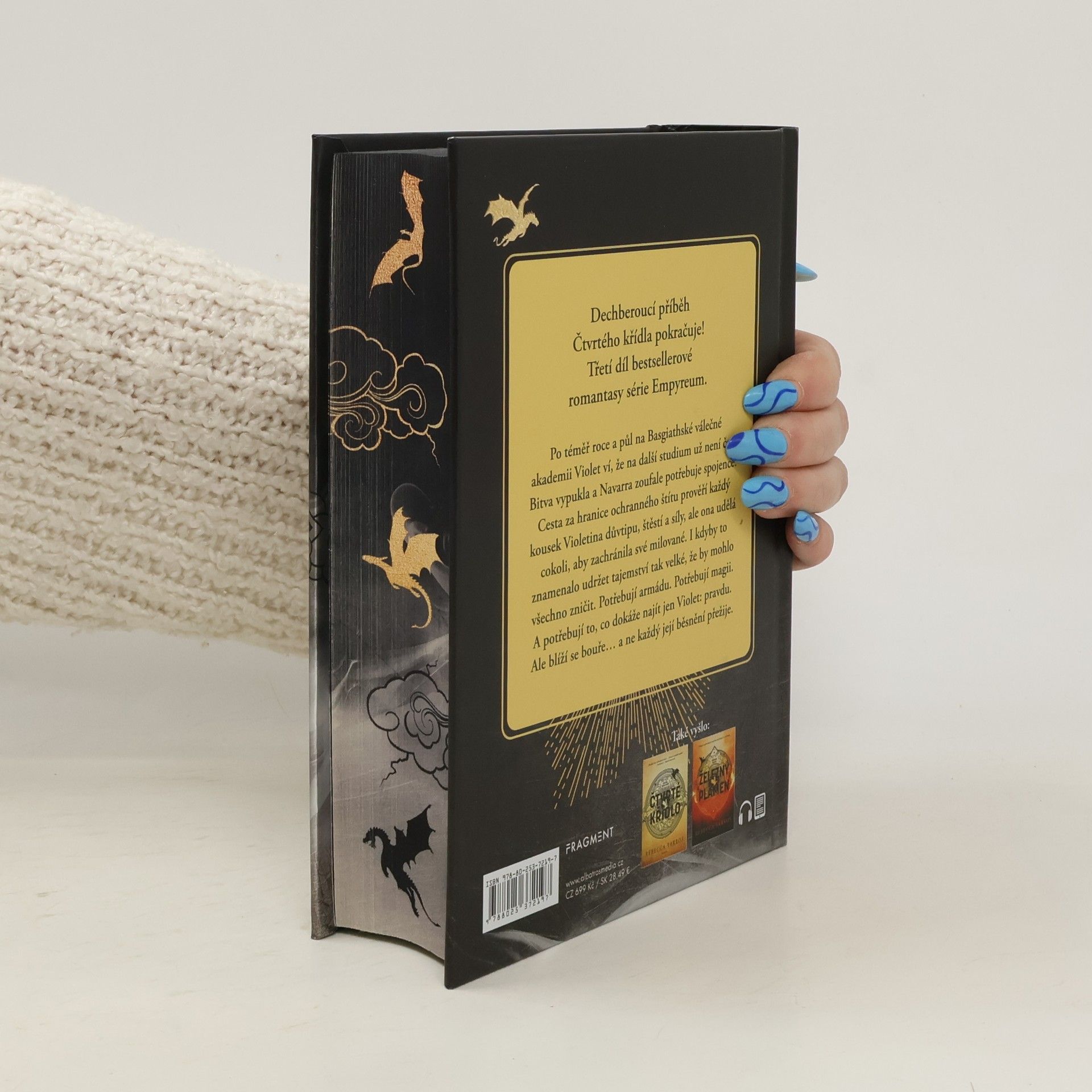 Dechberoucí příběh Čtvrtého křídla pokračuje! Třetí díl bestsellerové romantasy série Empyreum. Po téměř roce a půl na Basgiathské válečné akademii Violet ví, že na další studium už není čas. Bitva vypukla a Navarra zoufale potřebuje spojence. Cesta za hranice ochranného štítu prověří každý kousek Violetina důvtipu, štěstí a síly, ale ona udělá cokoli, aby zachránila své milované. I kdyby to znamenalo udržet tajemství tak velké, že by mohlo všechno zničit. Potřebují armádu. Potřebují magii. A potřebují to, co dokáže najít jen Violet: pravdu. Ale blíží se bouře… a ne každý její běsnění přežije.