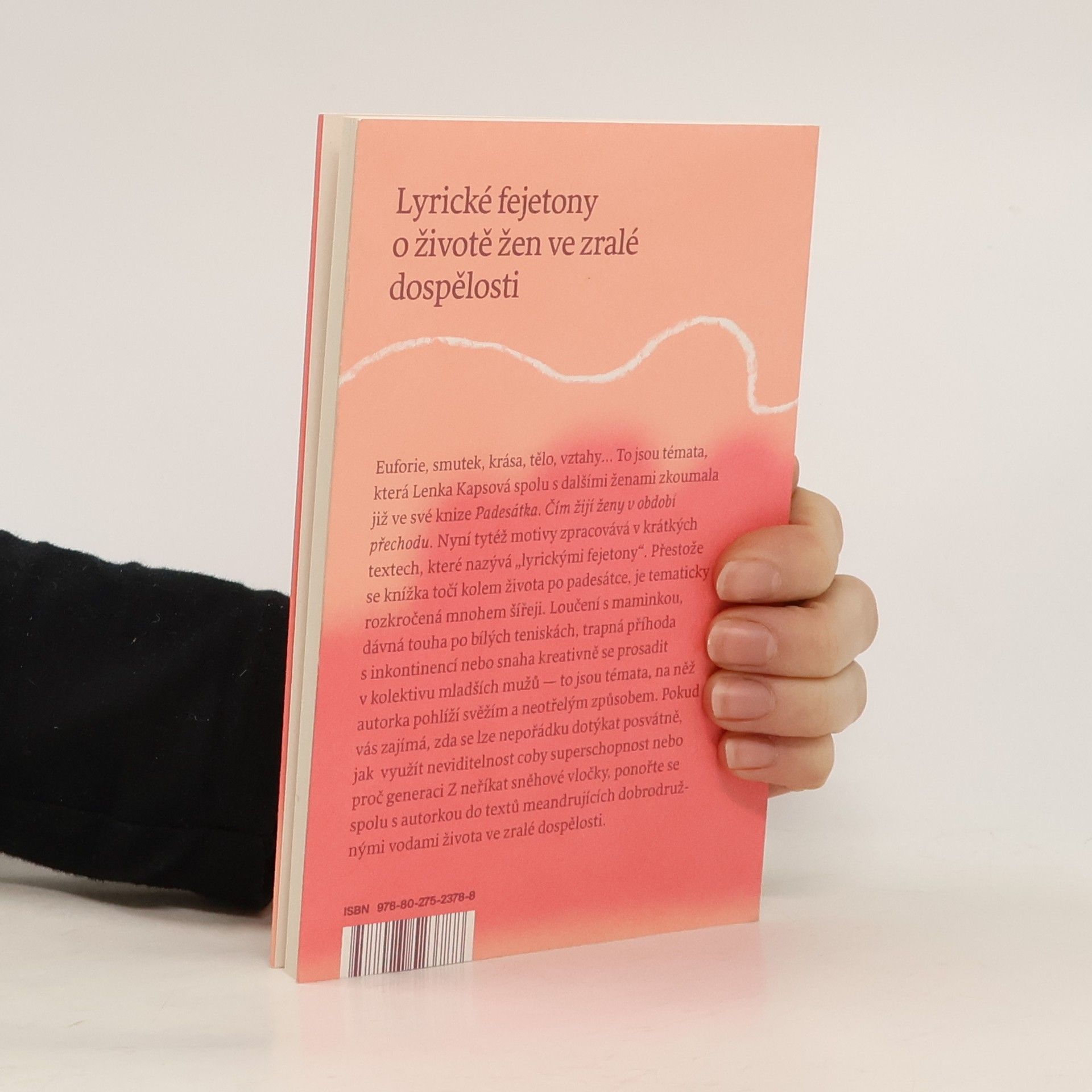 Lyrické fejetony o životě žen ve zralé dospělosti Euforie, smutek, krása, tělo, vztahy… To jsou témata, která Lenka Kapsová spolu s dalšími ženami zkoumala již ve své knize Padesátka. Čím žijí ženy v období přechodu. Nyní se vydává na samostatnou plavbu a zpracovává tytéž motivyv krátkých textech, které nazývá „lyrickými fejetony“. Přestože se knížka točí kolem života po padesátce, je tematicky rozkročená mnohem šířeji. Loučení s maminkou, dávná touha po bílých teniskách, trapná příhoda s inkontinencí nebo snaha kreativně se prosadit v kolektivu mladších mužů — to jsou témata, na něž autorka pohlíží svěžím a neotřelým způsobem. Pokud vás zajímá, zda se lze nepořádku dotýkat posvátně, jak využít neviditelnost coby superschopnost nebo proč generaci Z neříkat sněhové vločky, ponořte se spolu s autorkou do textů meandrujících dobrodružnými vodami života ve zralé dospělosti.