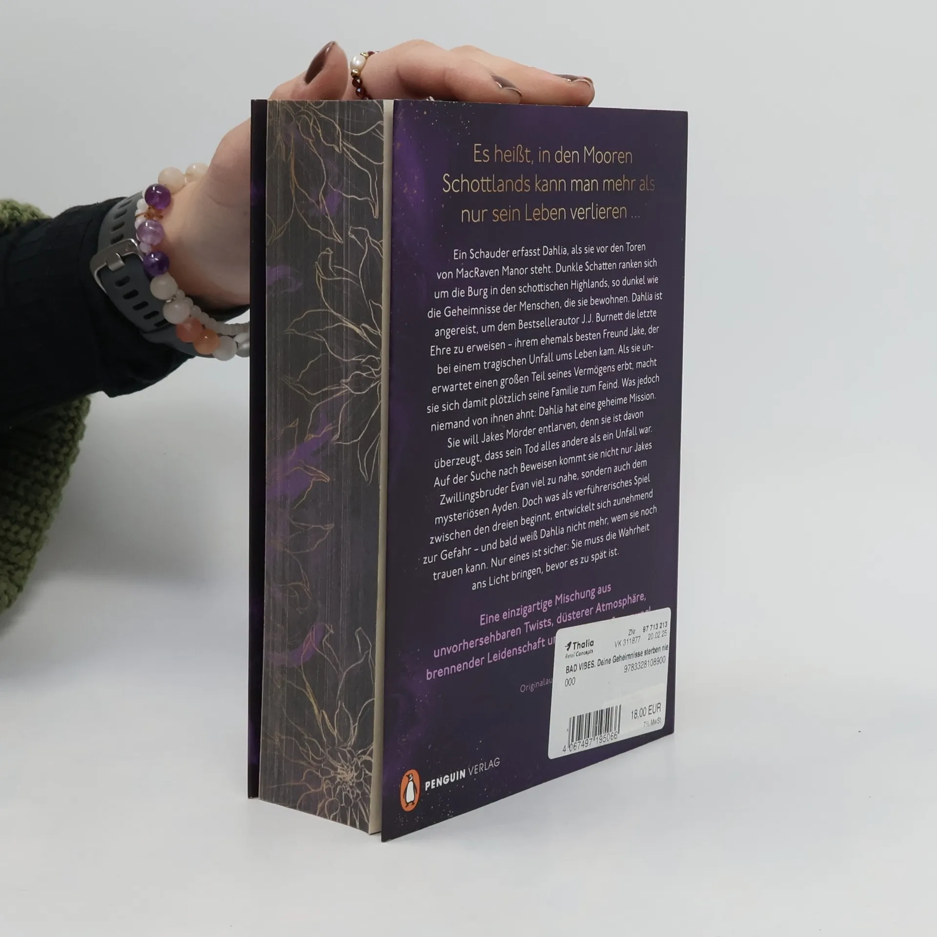 Es heißt, in den Mooren Schottlands kann man mehr als nur sein Leben verlieren ...Ein Schauder erfasst Dahlia, als sie vor den Toren von MacRaven Manor steht. Dunkle Schatten ranken sich um die Burg in den schottischen Highlands, so dunkel wie die Geheimnisse der Menschen, die sie bewohnen. Dahlia ist angereist, um dem Bestsellerautor J.J. Burnett die letzte Ehre zu erweisen – ihrem ehemals besten Freund Jake, der bei einem tragischen Unfall ums Leben kam. Als sie unerwartet einen großen Teil seines Vermögens erbt, macht sie sich damit plötzlich seine Familie zum Feind. Was jedoch niemand von ihnen ahnt: Dahlia hat eine geheime Mission. Sie will Jakes Mörder entlarven, denn sie ist davon überzeugt, dass sein Tod alles andere als ein Unfall war. Auf der Suche nach Beweisen kommt sie nicht nur Jakes Zwillingsbruder Evan viel zu nahe, sondern auch dem mysteriösen Ayden. Doch was als verführerisches Spiel zwischen den dreien beginnt, entwickelt sich zunehmend zur Gefahr – und bald weiß Dahlia nicht mehr, wem sie noch trauen kann. Nur eines ist sicher: Sie muss die Wahrheit ans Licht bringen, bevor es zu spät ist.Ein vertuschter Mord, ein Erbe in Millionenhöhe und eine Liebe, die gefährlicher kaum sein könnte … Düster, atmosphärisch, spannend und voller Leidenschaft.»BAD VIBES« ist perfekt für dich, wenn du auf diese Tropes stehst:• Spice & Thrill• Secrets & Lies• Enemies to Lovers• Dark Past• Forced Proximity