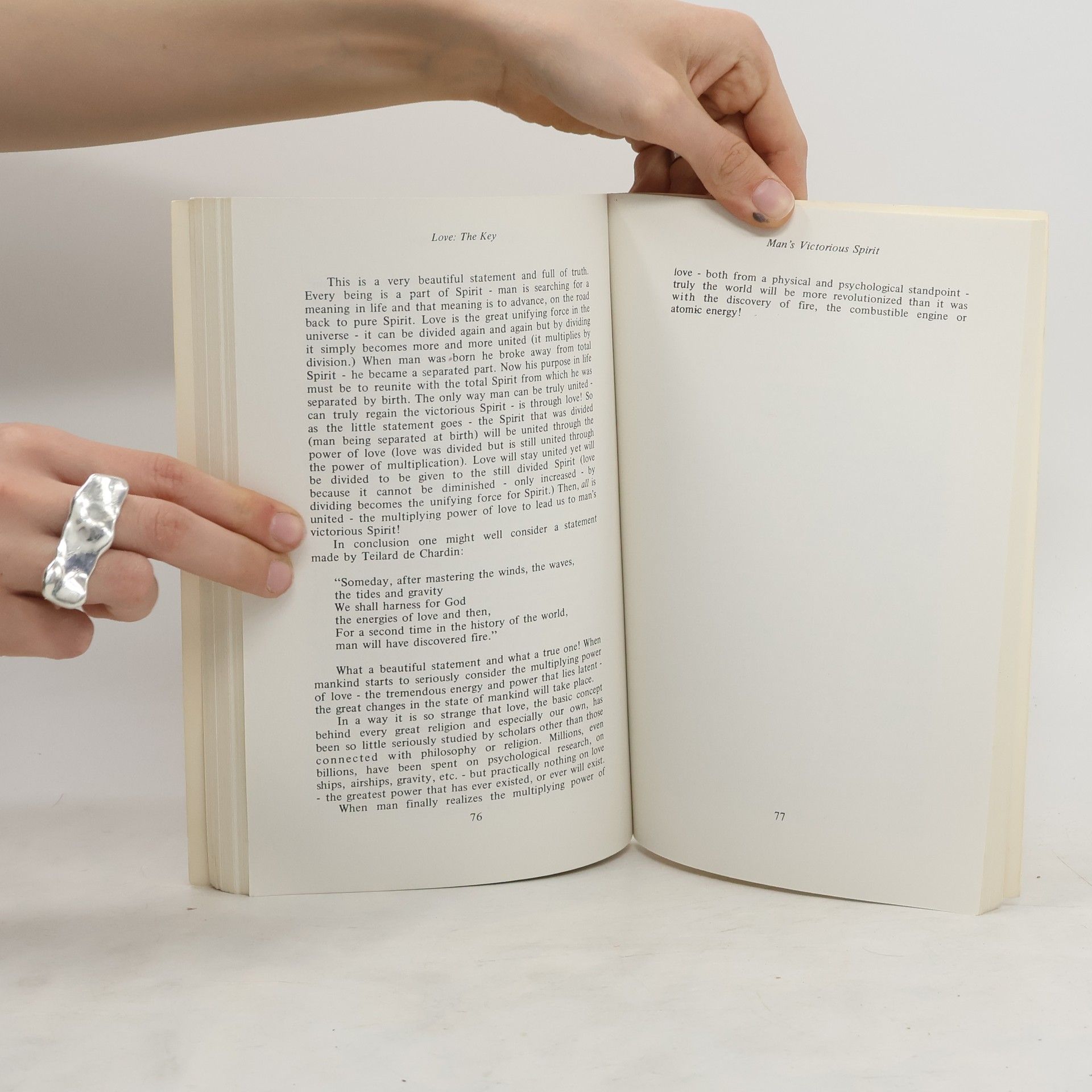 The problems of society seem to be unsolvable. Everywhere one seems to find despair and negatives concerning finding a solution or solutions to problems Yet, among this great despair, this great negativity, one sees sparks of harmony. sparks of human understanding, sparks of real joy and happiness. In virtually every case one finds this joy is an awareness that there is a Spirit within all men that is truly victorious. This Spirit can be tapped by all men. When one studies the histories of truly happy men, one immediately becomes aware that these men have learned to tap the victorious and triumphant Spirit that lies dormant in the more common man. Only when man has learned to develop his three sides - mind, body, and spirit - will he find peace, harmony, joy and the answers to the problems that face him on the material level. It is Spirit which man must learn to release Once one recognizes that the Spirit will be victorious and triumphant then all three elements of the trinity take their proper place and truly life becomes one of meaning and purpose.