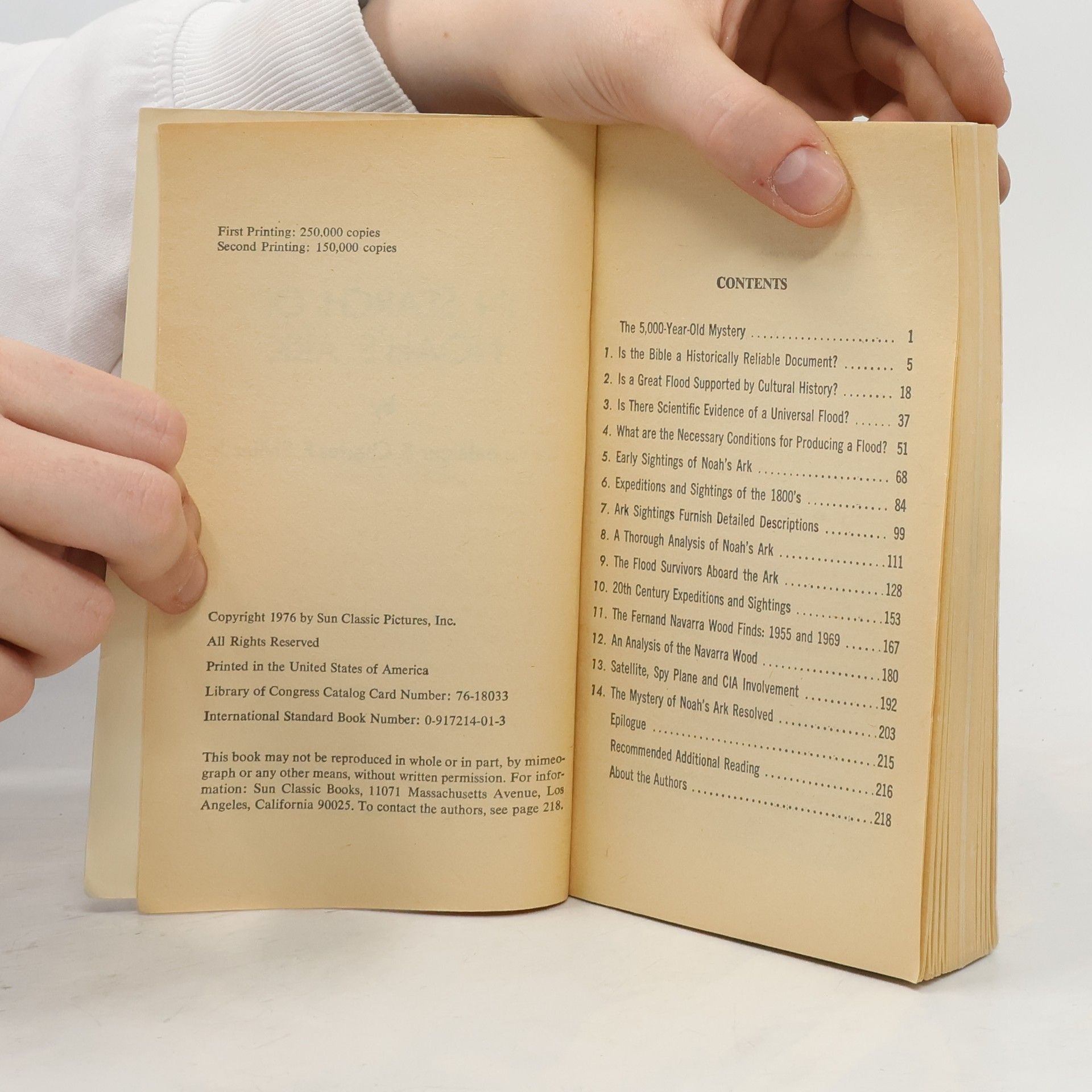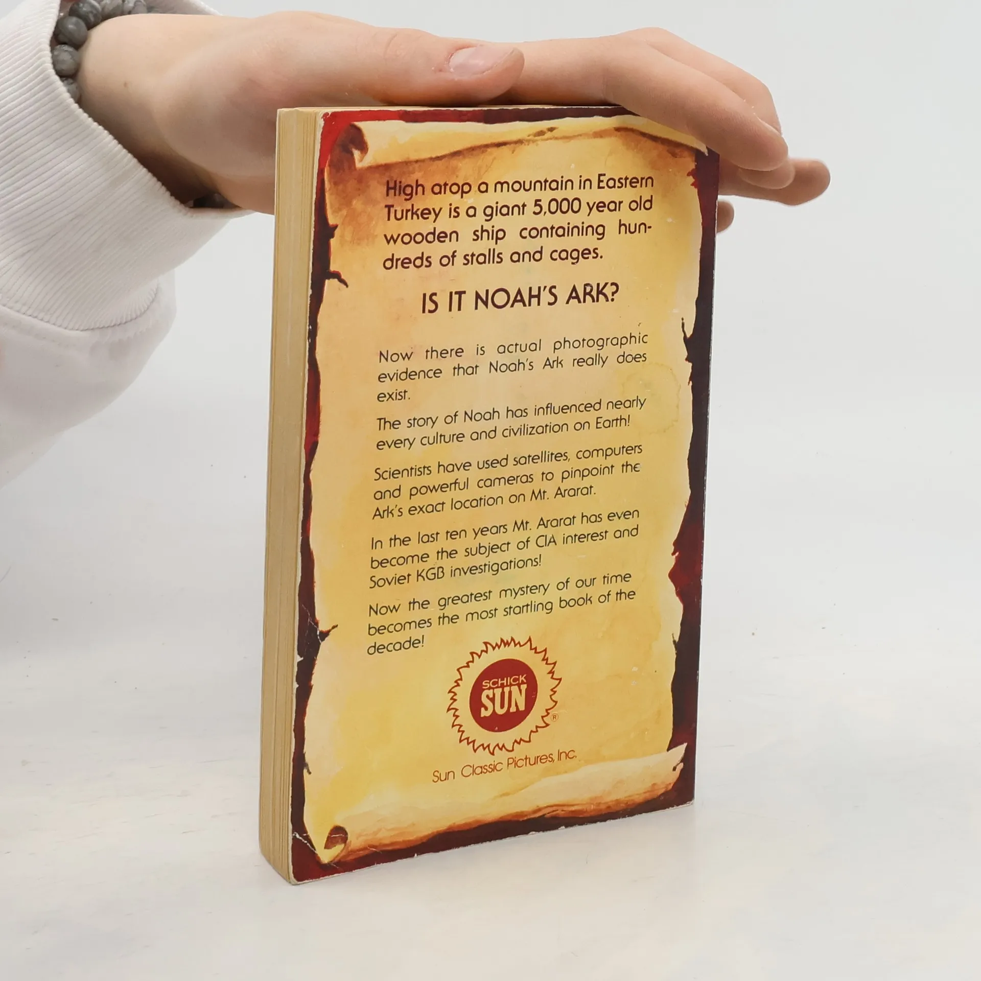 High atop a mountain in Eastern Turkey is a giant 5,000 year old wooden ship containing hundreds of stalls and cages. Is it Noah's Ark? Now there is actual photographic evidence that Noah's Ark really does exist. The story of Noah has influenced nearly every culture and civilization on Earth! Scientist have used satellites, computers and powerful cameras to pinpoint the Ark's exact location on Mt. Ararat. In the last ten years Mt. Ararat has even become the subject of CIA interest and KGB investigations! Now the greatest mystery of our time becomes the most startling book of the decade.