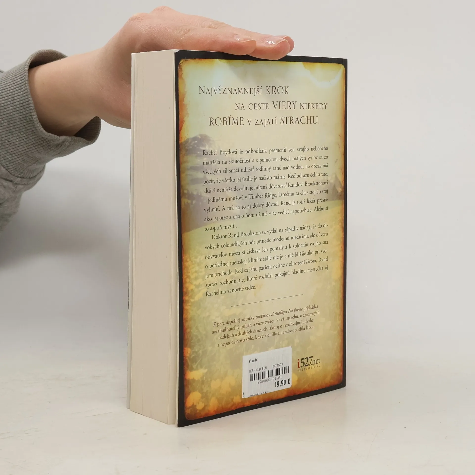 Najvýznamnejší krok na ceste viery niekedy robíme v zajatí strachu.Z pera úspešnej autorky románov Z diaľky a Na úsvite prichádza nezabudnuteľný príbeh o viere tvárou v tvár strachu, o zmarených nádejách a druhých šanciach, ako aj o neochvejnej odvahe a nepoddajnosti sŕdc, ktoré zlomila a napokon scelila láska.Rachel Boydová je odhodlaná premeniť sen svojho nebohého manžela na skutočnosť a s pomocou dvoch malých synov sa zo všetkých síl snaží udržať rodinný ranč nad vodou, no občas má pocit, že všetko jej úsilie je načisto márne. Keď odrazu čelí strate, akú si nemôže dovoliť, je nútená dôverovať Randovi Brookstonovi – jedinému mužovi v Timber Ridge, ktorému sa chce stoj čo stoj vyhnúť. A má na to aj dobrý dôvod. Rand je totiž lekár presne ako jej otec a ona o ňom už nič viac vedieť nepotrebuje. Alebo si to aspoň myslí…Doktor Rand Brookston sa vydal na západ v nádeji, že do divokých coloradských hôr prinesie modernú medicínu, ale dôveru obyvateľov mesta si získava len pomaly a k splneniu svojho sna o poriadnej mestskej klinike stále nie je o nič bližšie ako pri svojom príchode.Keď sa jeho pacient ocitne v ohrození života, Rand spraví rozhodnutie, ktoré rozbúri pokojnú hladinu mestečka aj Rachelino zanovité srdce.