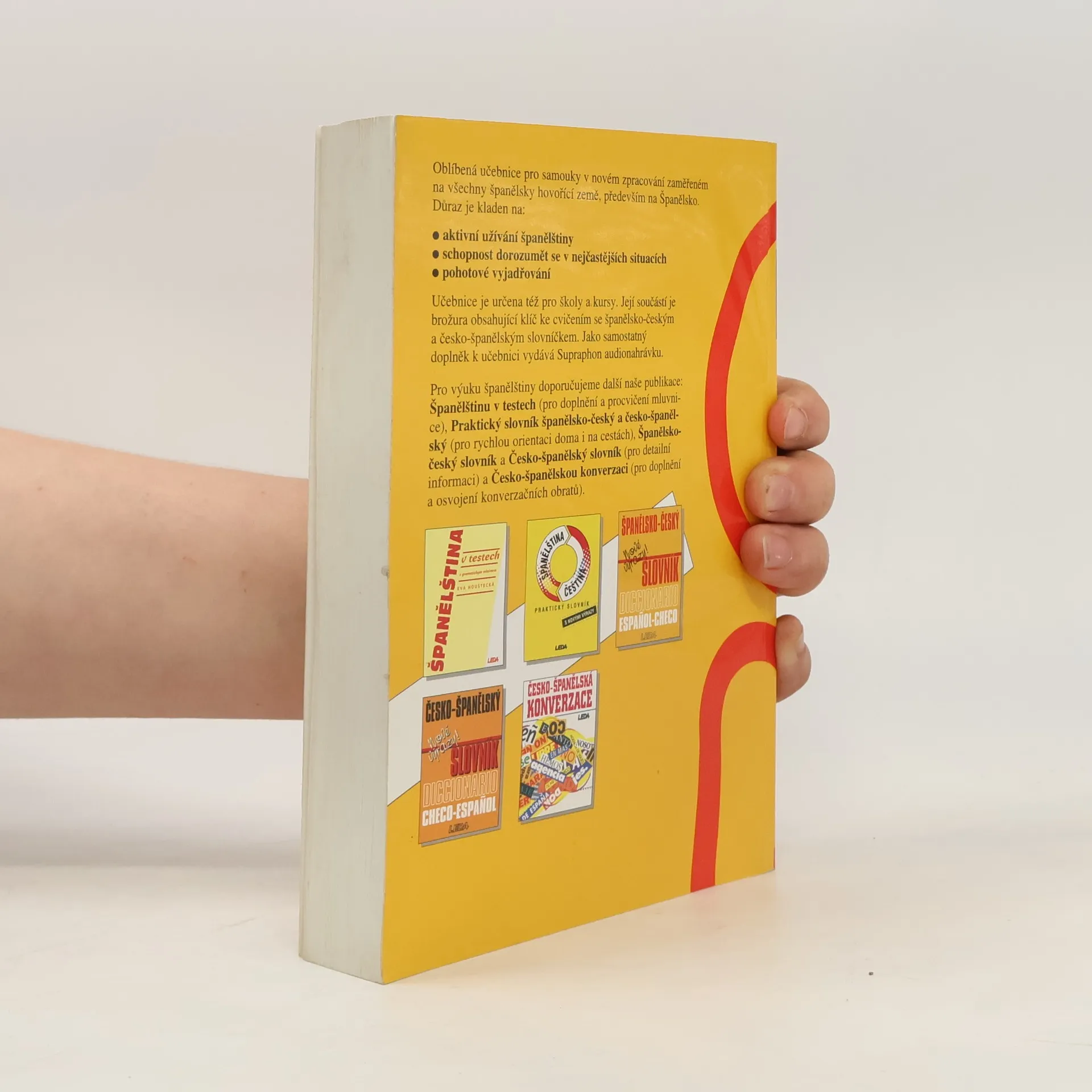 Oblíbená učebnice pro samouky v novém zpracování zaměřené na všechny španělsky hovořící země, především na Španělsko. Důraz je kladen na: . aktivní užívání španělštiny . schopnost dorozumět se v nejčastějších situacích . pohotové vyjadřování Učebnice je určena též pro školy a kursy. Její součástí je brožura obsahující klíč ke cvičením (119 s.) se španělsko-českým a česko-španělským slovníčkem. Jako samostatný doplněk k učebnici vydává Supraphon audionahrávku.