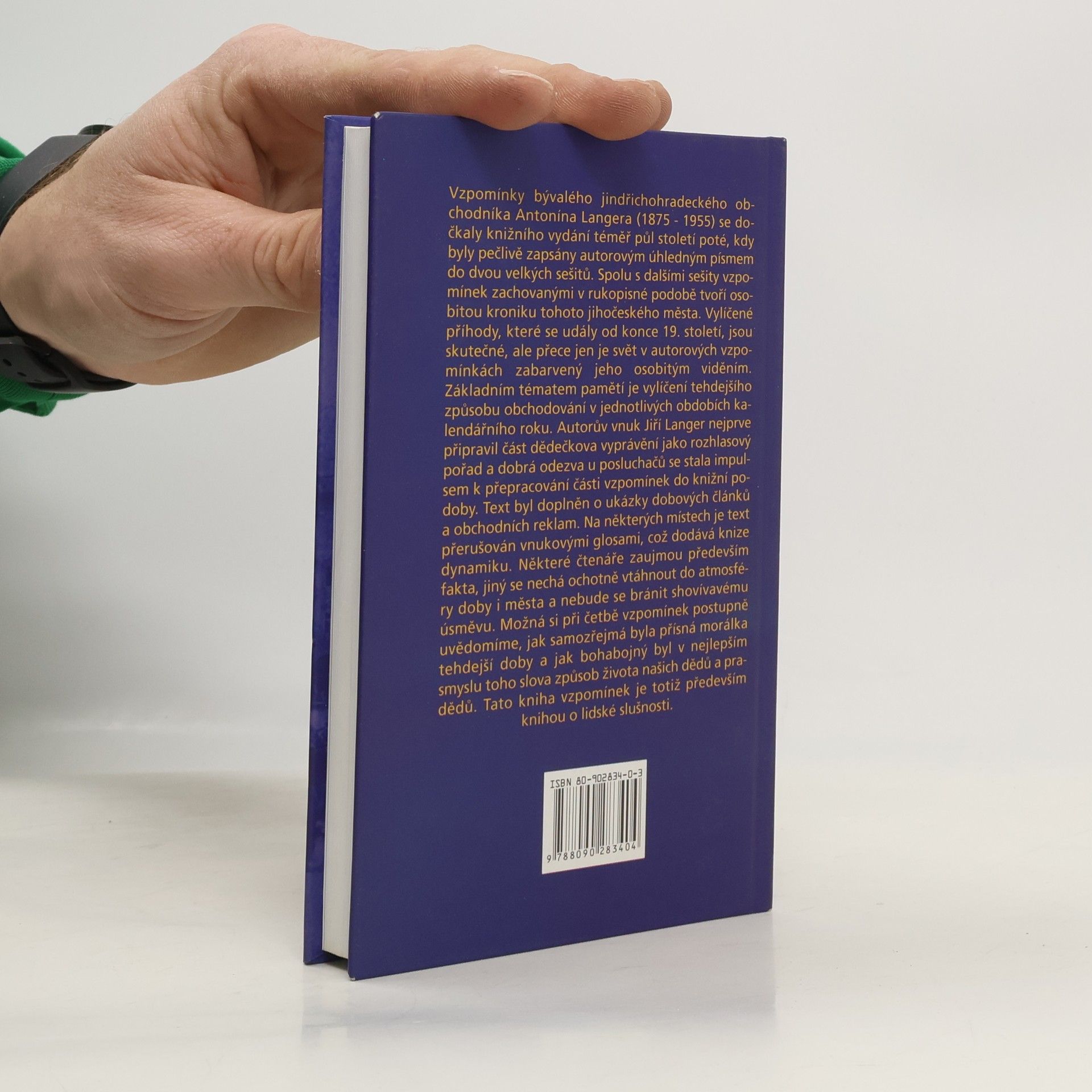 Vzpomínky jindřicho-hradeckého obchodníka První z pěti knih vzpomínek Antonína Langera. Vzpomínky bývalého jindřichohradeckého obchodníka Antonína Langera (1875 až 1955) se dočkaly knižního vydání téměř půl století poté, kdy byly autorem pečlivě zapsány do dvou velkých sešitů. Spolu s dalšími sešity vzpomínek zachovanými v rukopisné podobě tvoří osobitou kroniku tohoto jihočeského města. Vylíčené příhody, které se udály od konce 19. století jsou skutečné, ale přece jen je svět v autorových vzpomínkách zabarvený jeho osobitým viděním. Základním tématem této knihy je vylíčení tehdejšího způsobu obchodování v jednotlivých obdobích kalendářního roku. Autorův vnuk Jiří Langer nejprve připravil část dědečkova vyprávění jako rozhlasový pořad a dobrá odezva u posluchačů se stala impulsem k přepracování vzpomínek do knižní podoby. Text doplňují ukázky dobových článků a obchodních reklam.