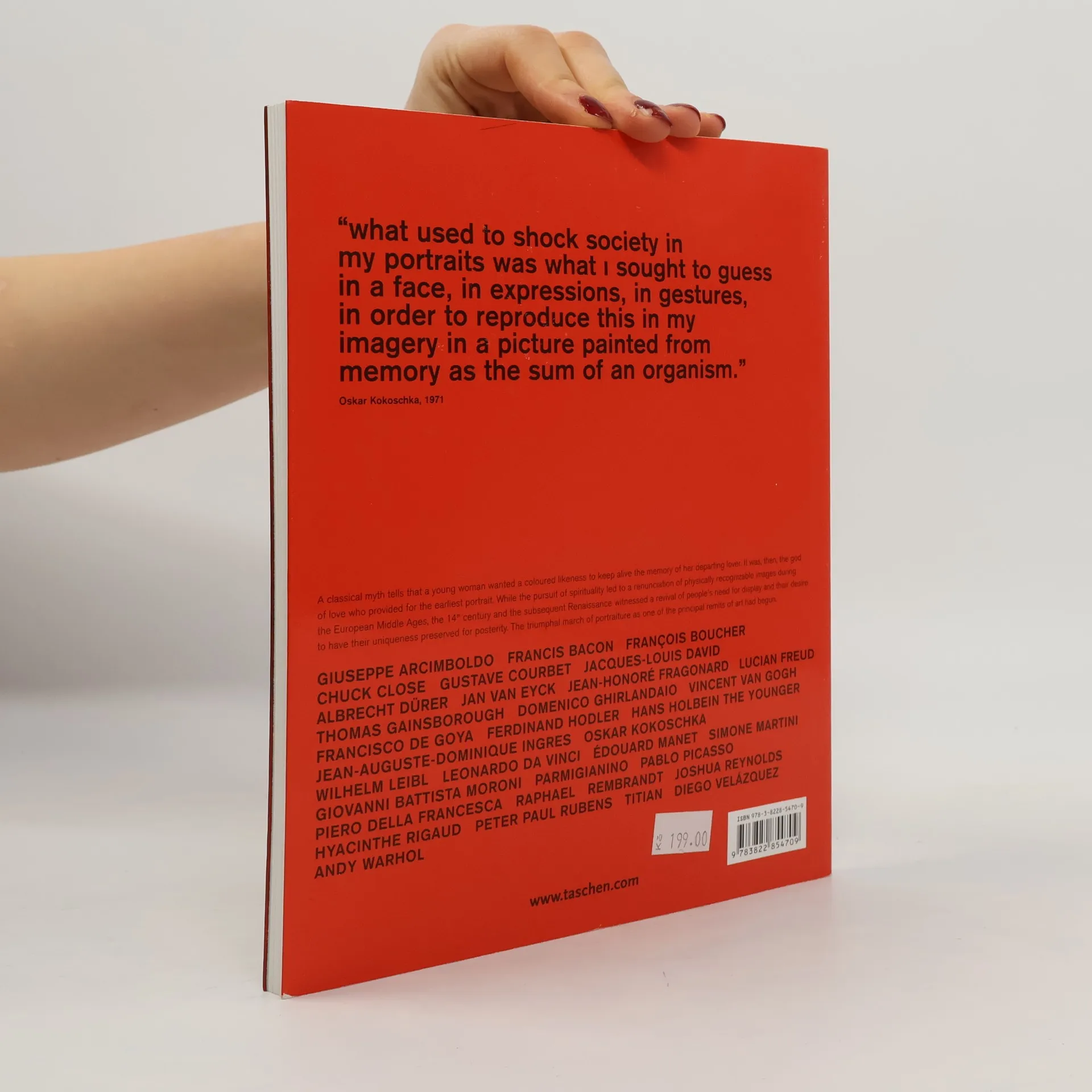 Beginning in the 14th century and working its way through the ages up to the current day, this book examines the portrait via the most beloved and important examples in history.The featured artists include Simone Martini, Jan van Eyck, Albrecht Durer, Hans Holbein the Younger, Leonardo da Vinci, Raphael, Titian, Parmigianino, Giuseppe Arcimboldo, Rembrandt, Peter Paul Rubens, Diego Velazquez, Jean-Honore Fragonard, Joshua Reynolds, Thomas Gainsborough, Francisco de Goya, Jaques-Louis David, Jean-Auguste-Dominique Ingres, Gustave Courbet, Edouard Manet, Vincent van Gogh, Oskar Kokoschka, Ferdinand Hodler, Pablo Picasso, Andy Warhol, Francis Bacon, Lucian Freud, and Chuck Close.Each book in TASCHEN's "Basic Genre Series" features: a detailed introduction with approximately 35 photographs, plus a timeline of the most important events (political, cultural, scientific, etc.) that took place during the time period; a selection of the most important works of the epoch; each is presented on a 2-page spread with a full-page image and, on the facing page, a description/interpretation of the work and brief biography of the artist as well as additional information such as a reference work, portrait of the artist, and/or citations.