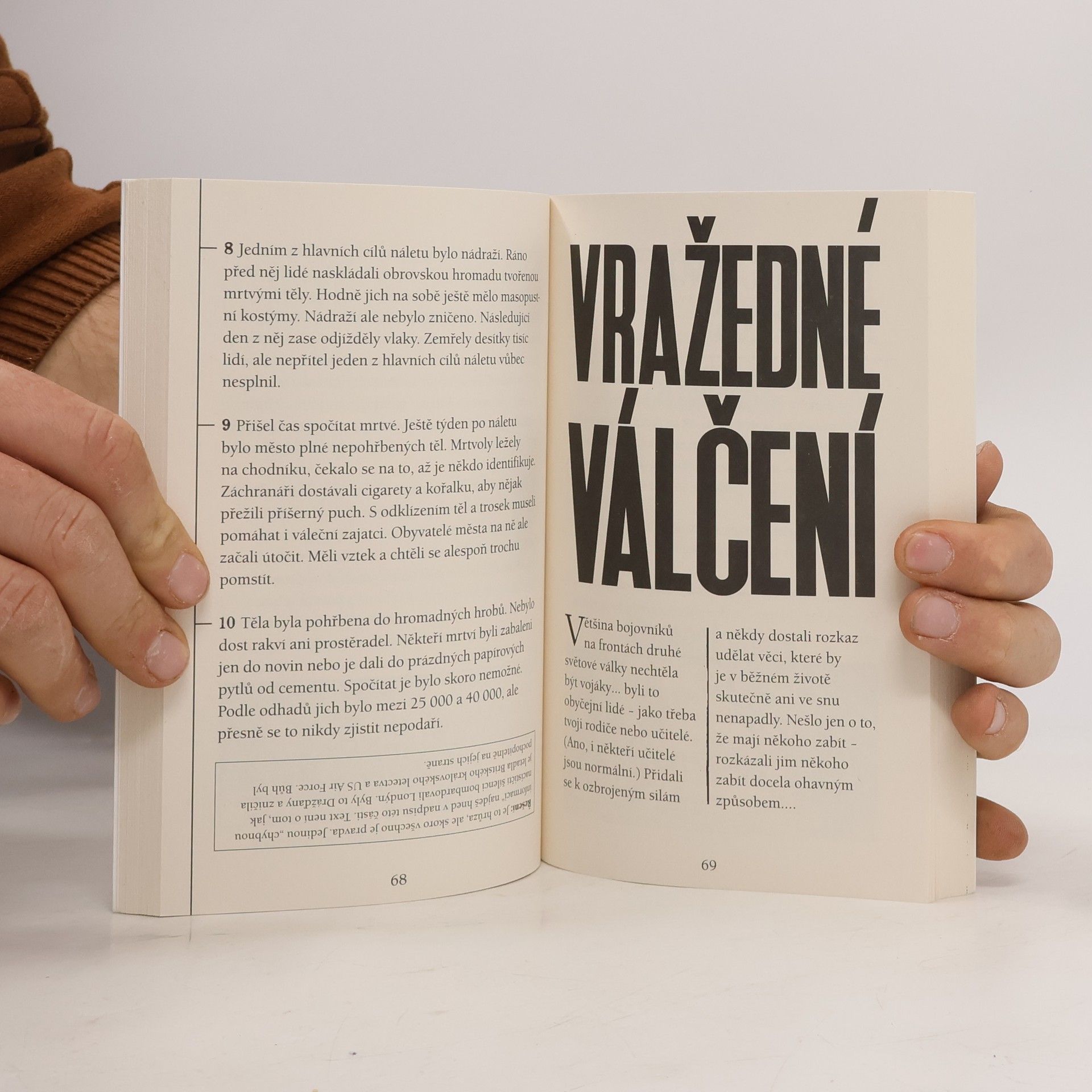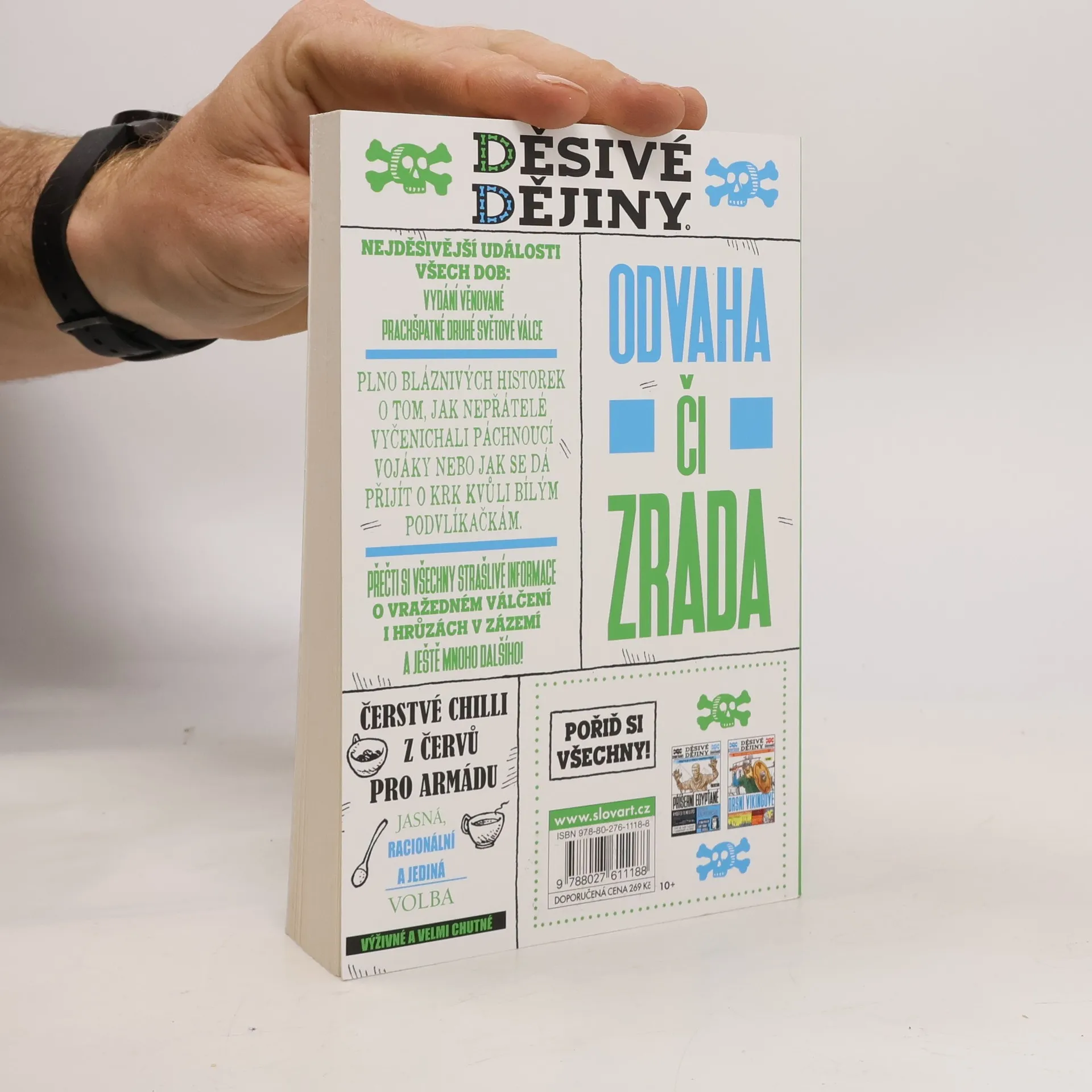 První svazek aktualizovaného vydání legendární knižní řady Děsivé dějiny se věnuje jednomu z nejtěžších a nejsmutnějších témat: druhé světové válce, která za sebou zanechala mnohem více obětí a utrpení než jakýkoliv jiný konflikt v dějinách lidstva. Můžeme na něčem takovém vůbec najít něco ne snad přímo veselého nebo zábavného, ale alespoň absurdního a potrhlého? Překvapivě ano: poznáte chrabrou domobranu britských staříků a holobrádků, posoudíte ty nejbláznivější nápady na tajné zbraně, dozvíte se, proč můžete při velkém hladu jíst červy, ale ne housenky, nebo si zapamatujete, že je lepší nebrat si do války bílé spodky. Kromě toho se ale seznámíte s mnoha skutečnými příběhy, ze kterých do slova a do písmene mrazí: o statečných špionkách, o strašných osudech vězňů v koncentračních táborech, o vypálených vesnicích a o nejhorším zločinu všech dob, nacistických táborech smrti. Označovat druhou světovou válku jen jako „prachšpatnou" je možná slabé slovo, ale přesně o tomhle Děsivé dějiny jsou: dělat si z něčeho legraci neznamená, že se tímto způsobem nemůžeme opravdu důkladně poučit i o těch kapitolách naší minulosti, které se nikdy nesmějí opakovat.