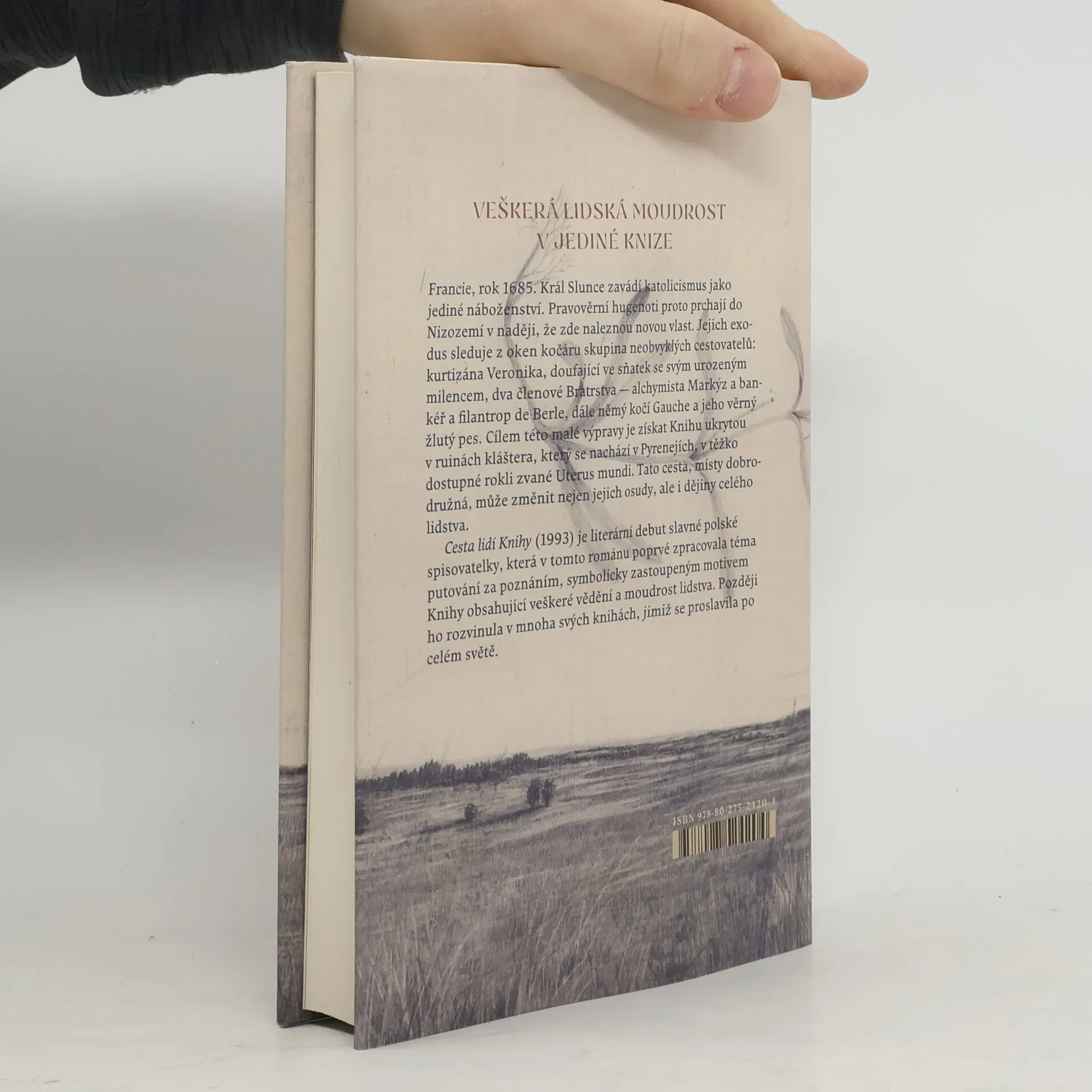 Francie, rok 1685: Král Slunce zavádí katolicismus jako jediné legální náboženství. Zemí procházejí skupiny hugenotů, které směřují na sever a doufají, že zde naleznou novou vlast. Z oken kočáru psance sleduje skupinka neobvyklých cestovatelů, mířících naopak do Pyrenejí: Veronika, kurtizána opuštěná svým snoubencem; Markýz, muž zabývající se alchymií; de Berle, bohatý obchodník; a Gauche, němý kočí s věrným žlutým psem. Každý z nich opustil Paříž z jiného důvodu. Tato cesta, místy dobrodružná, může změnit nejen jejich osudy, ale i dějiny celého lidstva. Cesta lidí Knihy (1993) je literárním debutem slavné polské spisovatelky, která v tomto románu poprvé zpracovala téma cesty a putování za poznáním, symbolicky zastoupeným motivem Knihy, jež obsahuje veškeré vědění a moudrost lidstva. Toto téma později rozvinula v mnoha dalších knihách, jimiž se proslavila po celém světě.