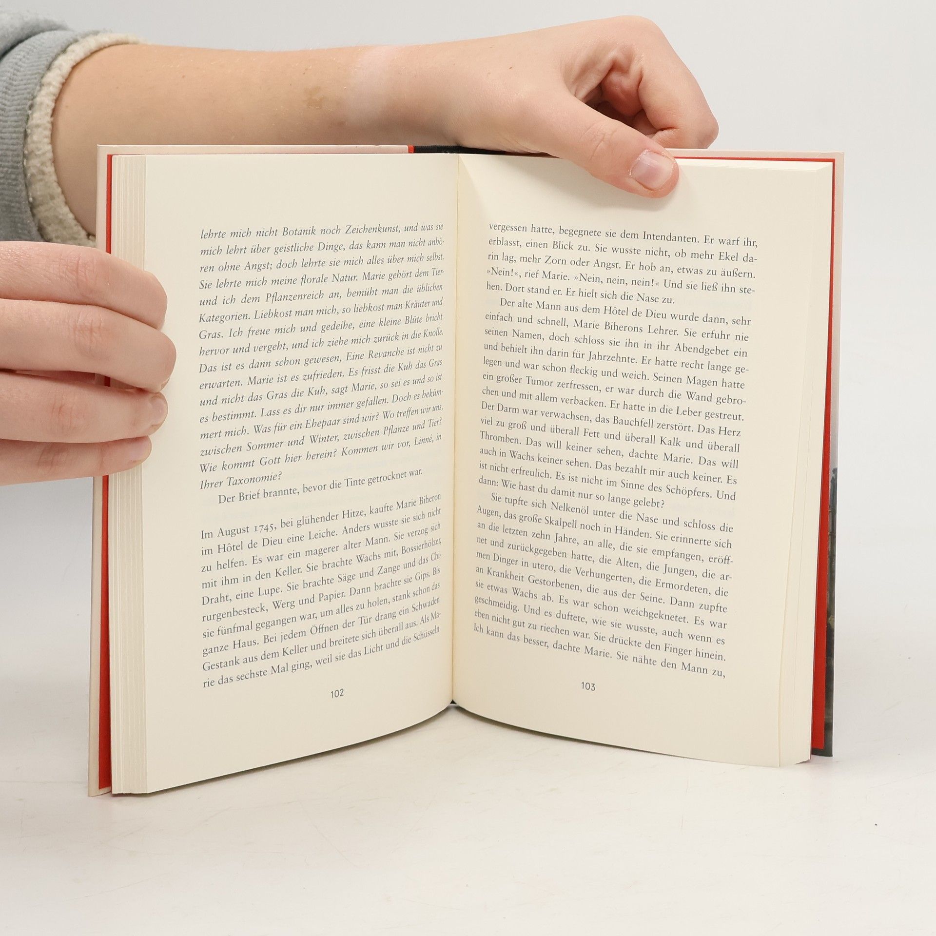 Eine Liebesgeschichte, so schön, so verwegen, wie nur Christine Wunnicke sie schreibt. Schauplatz ist Frankreich im 18. Jahrhundert, das vorrevolutionäre und das überaus revolutionäre. Und es lieben sich zwei Frauen, die verschiedener nicht sein könnten: Marie Biheron, die schon im zarten Alter Leichen seziert, um deren Innenleben aus Wachs zu modellieren; und Madeleine Basseporte, die zeichnend die Anatomie von Blumen aufs Papier zaubert, weil Menschen einen ja doch nur von der Arbeit abhalten und meist keine Ahnung haben. Männer kommen auch vor, in schönen Nebenrollen – ein nervöser Bestseller-Autor, ein junger Nichtsnutz und Diderot, der Kaffee trinkt und viel redet. Ein hinreißender Liebesroman, der hin und her schwingt zwischen der Zeit, als Küchenschellen friedlich am Wegesrand wachsen, und jenen Schreckenstagen, als nicht allein der Königin wie einer schönen Blume der Kopf abgeschlagen wurde.