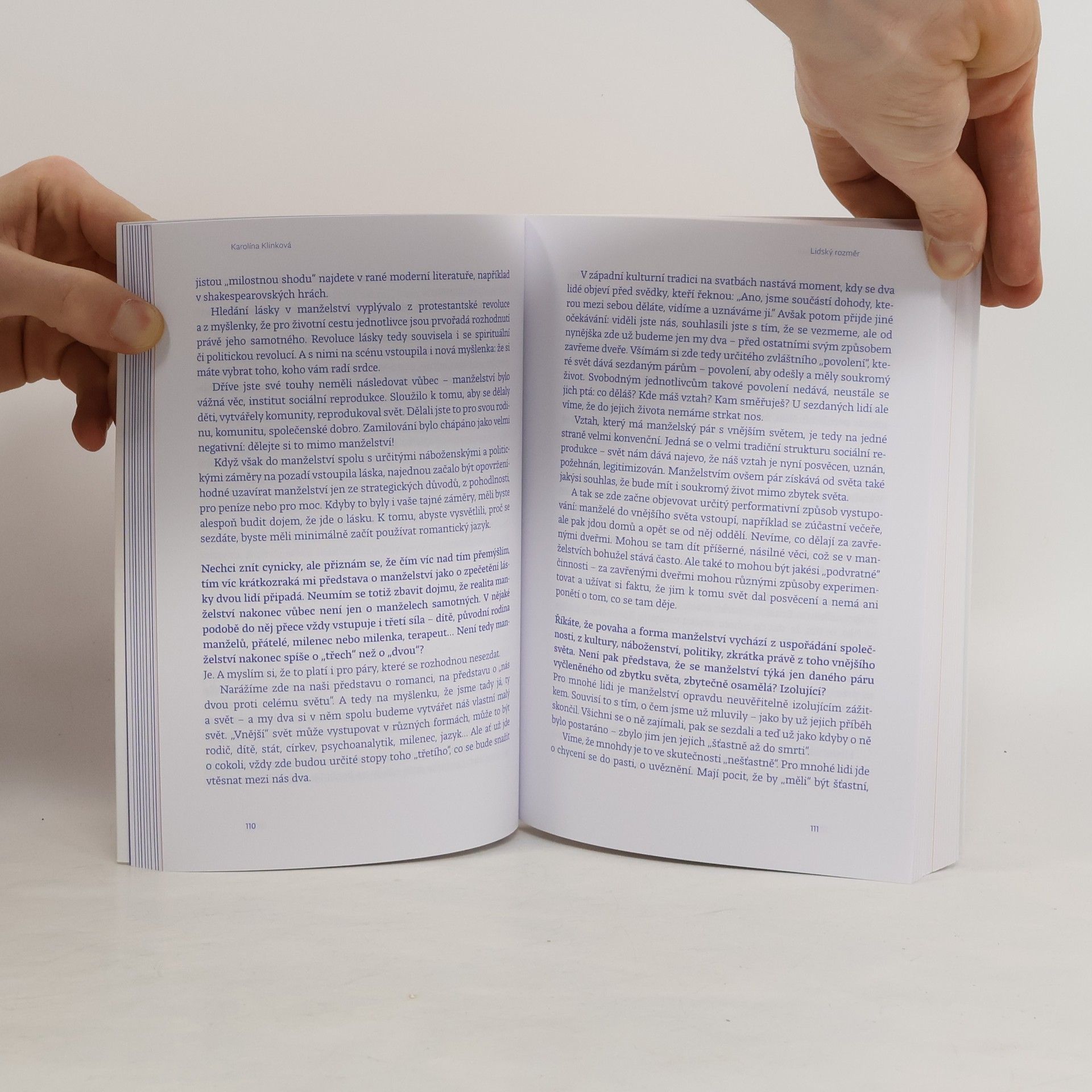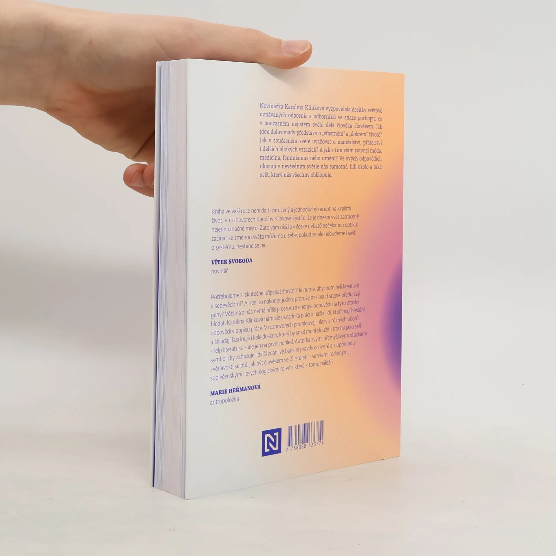 Pronikavé rozhovory o tom, jak být ve 21. století člověkemNovinářka Karolína Klinková vyzpovídala desítky světově uznávaných odbornic a odborníků ve snaze pochopit, co v současném nejistém světě dělá člověka člověkem. Jak jdou dohromady představy o „šťastném“ a „dobrém“ životě? Jak ve 21. století uvažovat o manželství, přátelství i dalších blízkých vztazích? A jak s tím vším souvisí móda, medicína, feminismus nebo umění? Ve svých odpovědích ukazují v nevšedním světle nás samotné, lidi okolo a také svět, který nás všechny obklopuje.