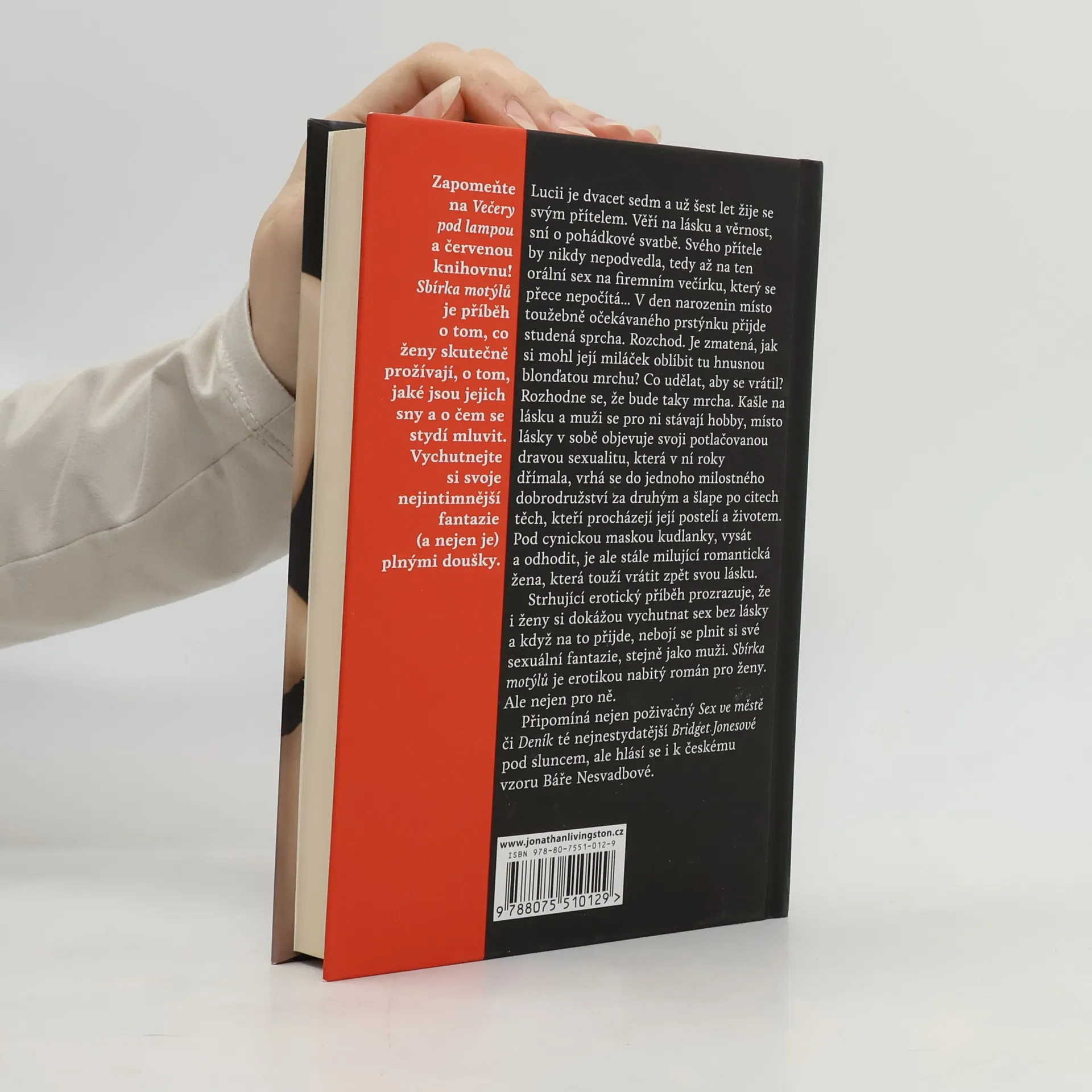 Lucii je dvacet sedm a už šest let žije se svým přítelem. Věří na lásku a věrnost, sní o pohádkové svatbě. Svého přítele by nikdy nepodvedla, tedy až na ten orální sex na firemním večírku, který se přece nepočítá.... V den narozenin místo toužebně očekávaného prstýnku přijde studená sprcha. Rozchod. Je zmatená,jak si mohl její miláček oblíbit tu hnusnou blonďatou mrchu? Co udělat, aby se vrátil? Rozhodne se, že bude taky mrcha. Kašle na lásku a muži se pro ni stávají hobby, místo lásky v sobě objevuje svoji potlačovanou dravou sexualitu, která v ní roky dřímala, vrhá se do jednoho milostného dobrodružství za druhým a šlape po citech těch, kteří procházejí její postelí a životem. Pod cynickou maskou kudlanky, vysát a odhodit, je ale stále milující romantická žena, která touží vrátit zpět svou lásku. Sbírka motýlů je erotikou nabitý román pro ženy. Ale nejen pro ně. Připomíná nejen poživačný sex ve městě či deník té nejnestydatější Bridget Jonesové pod sluncem, ale hlásí se i k českému vzoru Báře Nesvadbové.