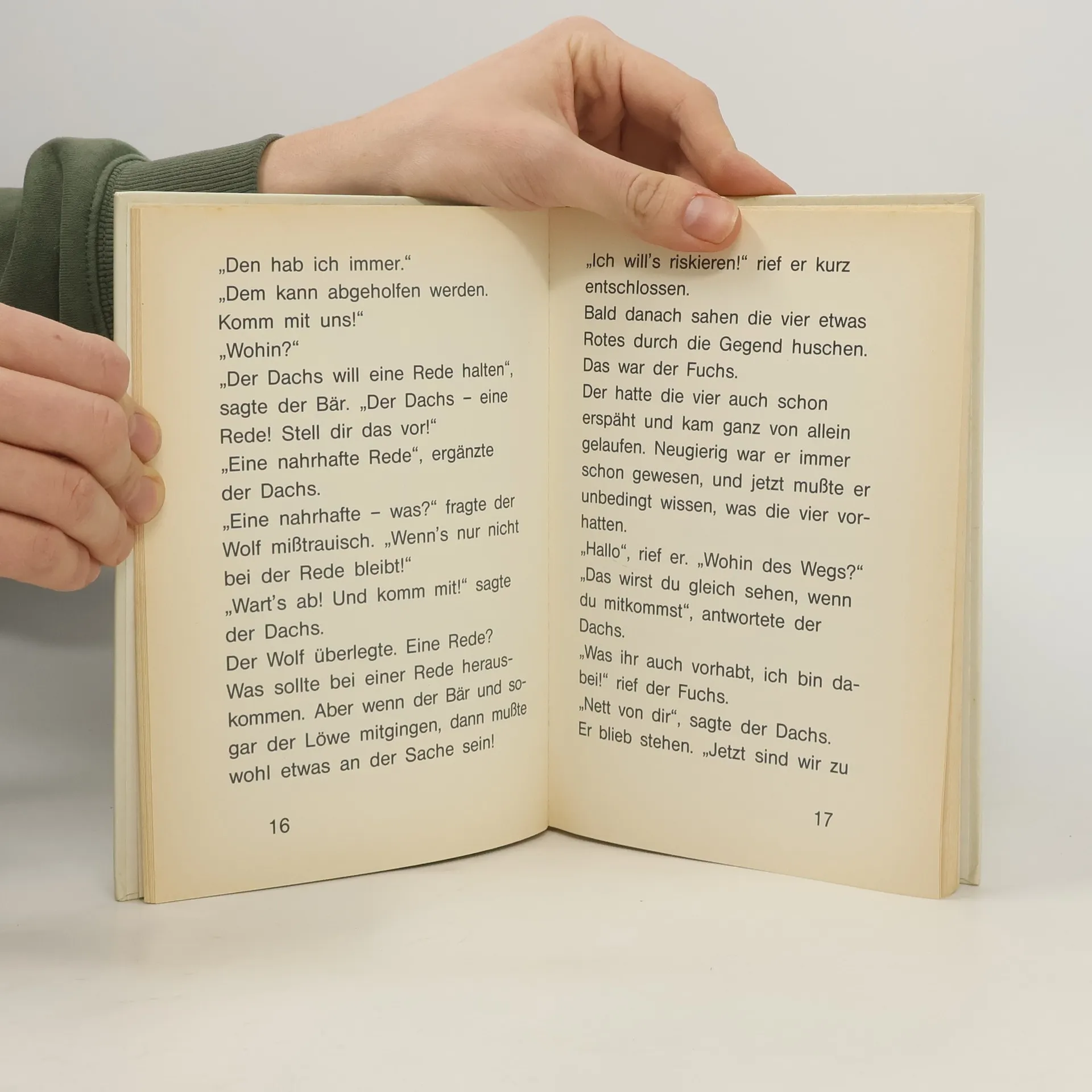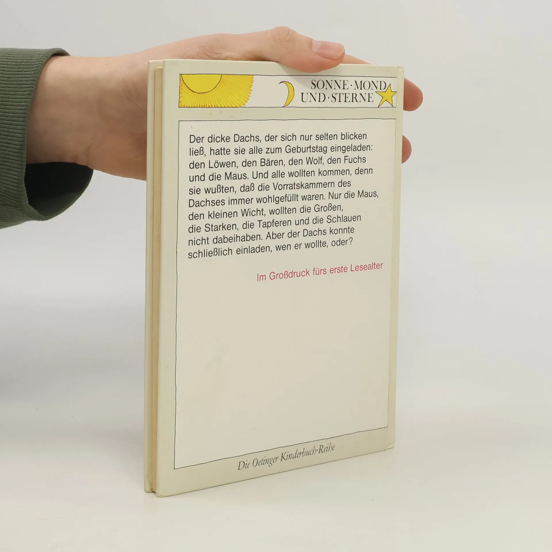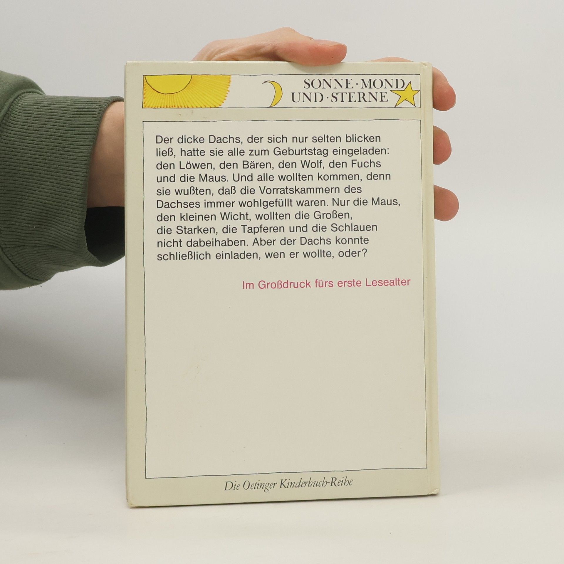 Klappentext: Der dicke Dachs, der sich nur selten blicken ließ, hatte sie alle zum Geburtstag eingeladen: den Löwen, den Bären, den Wolf, den Fuchs und die Maus. Und alle wollten kommen, denn sie wußten, daß die Vorratskammern des Dachses immer wohlgefüllt waren. Nur die Maus, den kleinen Wicht, wollten die Großen, die Starken, die Tapferen und die Schlauen nicht dabeihaben. Aber der Dachs konnte schließlich einladen, wen er wollte, oder? Oetinger Kinderbuch-Reihe (Großdruck) illustriert