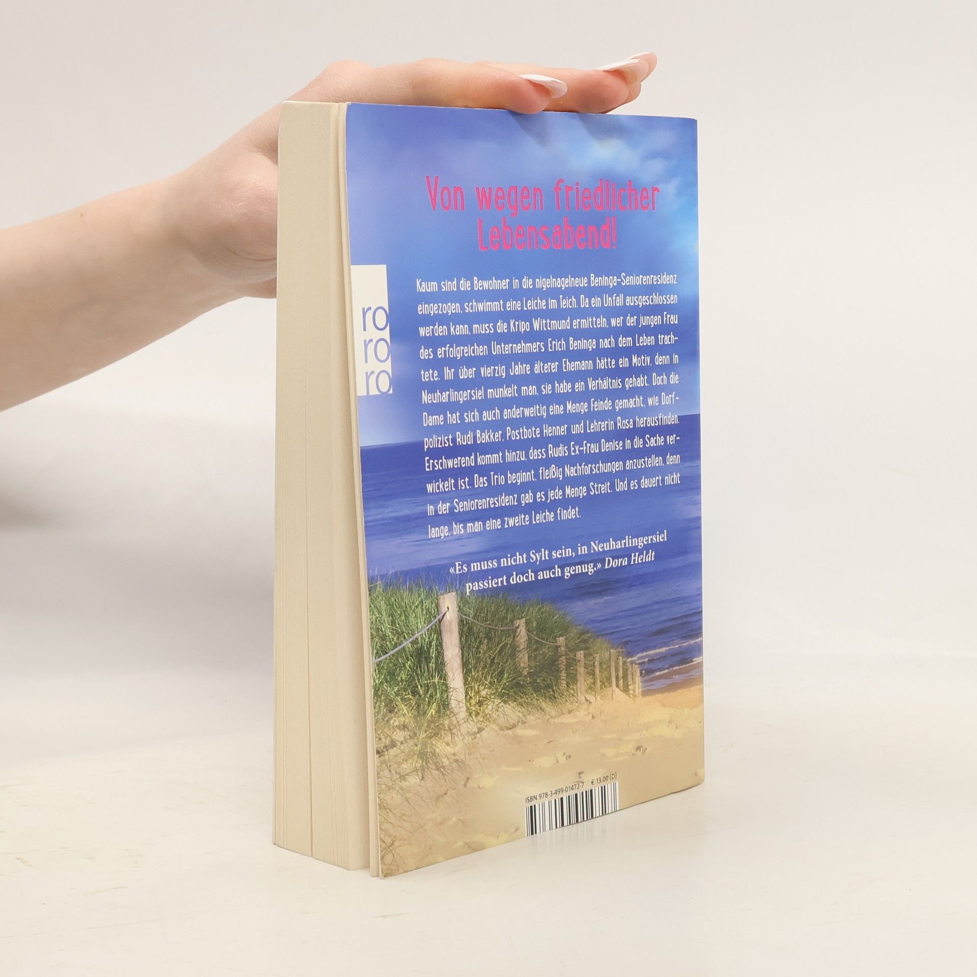 Von wegen friedlicher Lebensabend! Kaum sind die Bewohner in die nigelnagelneue Beninga-Seniorenresidenz eingezogen, schwimmt eine Leiche im Teich. Da ein Unfall ausgeschlossen werden kann, muss die Kripo Wittmund ermitteln, wer der jungen Frau des erfolgreichen Unternehmers Erich Beninga nach dem Leben trachtete. Ihr über vierzig Jahre älterer Ehemann hätte ein Motiv, denn in Neuharlingersiel munkelt man, sie habe ein Verhältnis gehabt. Doch die Dame hat sich auch anderweitig eine Menge Feinde gemacht, wie Dorfpolizist Rudi Bakker, Postbote Henner und Lehrerin Rosa herausfinden. Erschwerend kommt hinzu, dass Rudis Ex-Frau Denise in die Sache verwickelt ist. Das Trio beginnt, fleißig Nachforschungen anzustellen, denn in der Seniorenresidenz gab es jede Menge Streit. Und es dauert nicht lange, bis man eine zweite Leiche findet. «Es muss nicht Sylt sein, in Neuharlingersiel passiert doch auch genug.» Dora Heldt