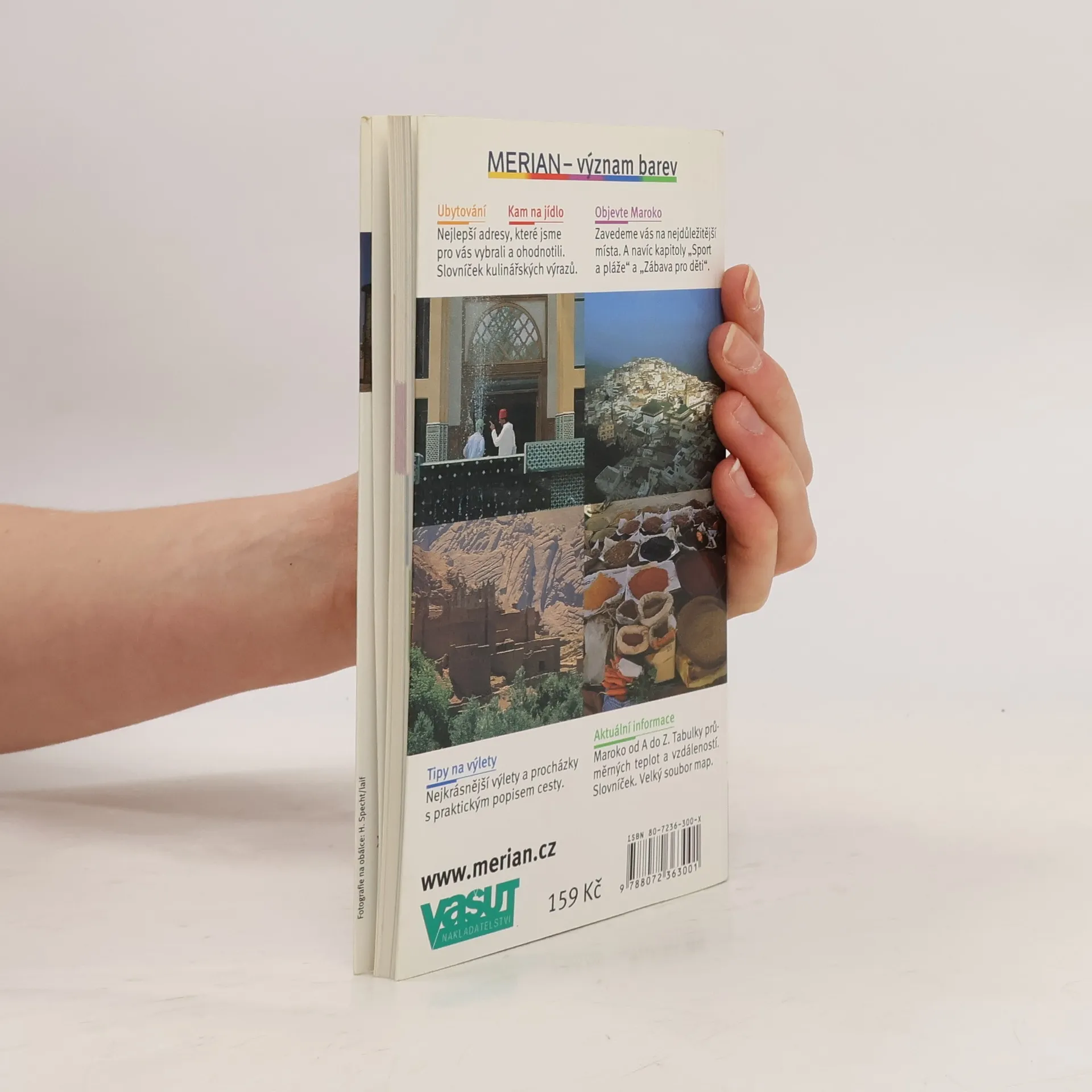 Cestovní příručka v úvodu představuje nejdůležitější místa země. Přináší obecné informace o vstupu do země, radí jak cestovat, jak se ubytovat a kde jíst. Doporučuje vhodné turistické trasy pro cesty autem, pěšky, autobusem a vlakem. Významné pamětihodnosti kraje a měst jsou popisovány abecedně včetně cílů v jejich okolí. Navíc doporučuje několik turistických tras a okruh Marokem. Průvodce obsahuje i přehled důležitých informací pro turisty, mapky, plánky, fotografie, stručné dějiny regionu, rejstřík, slovníček i aktualizované ceny a otevírací doby. Česká mutace německé ediční řady průvodců "Merian" seznamuje s nejvýznamnějšími kulturími, uměleckými a přírodními pamětihodnostmi severoafrické země - Maroka.