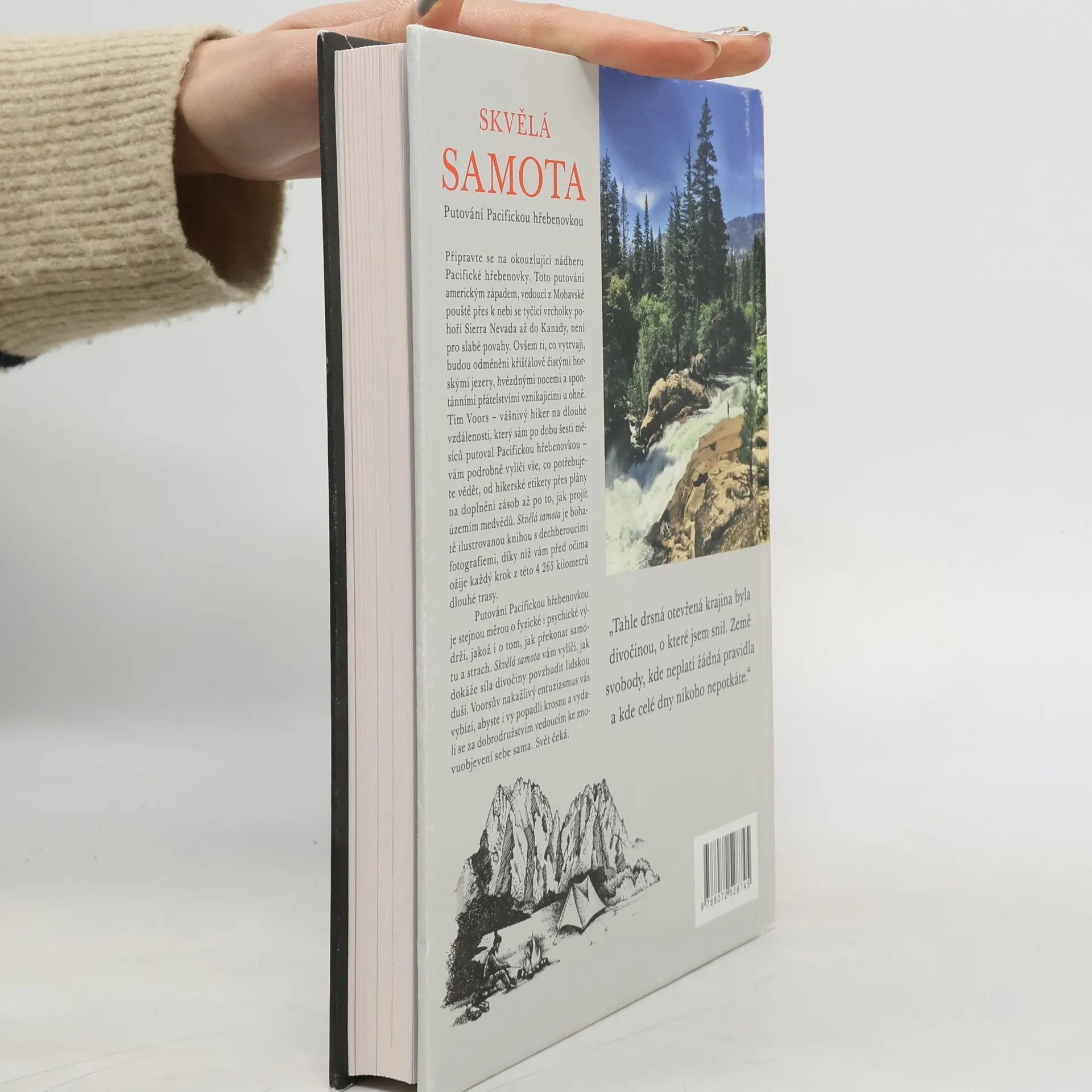 „Tahle drsná otevřená krajina byla divočinou, o které jsem snil. Země svobody, kde neplatí žádná pravidla a kde celé dny nikoho nepotkáte.“ Připravte se na okouzlující nádheru Pacifické hřebenovky. Toto putování americkým západem vedoucí z Mohavské pouště přes k nebi se tyčící vrcholky pohoří Sierra Nevada až do Kanady není pro slabé povahy. Ovšem ti, co vytrvají, budou odměněni křišťálově čistými horskými jezery, nocemi pod hvězdami a spontánními přátelstvími vznikajícími u ohně. Tim Voors – vášnivý hiker na dlouhé vzdálenosti, který sám po dobu šesti měsíců putoval Pacifickou hřebenovkou – vám podrobně vylíčí vše, co potřebujete vědět. Od hikerské etikety přes plány na doplnění zásob až po to, jak projít územím medvědů. Skvělá samota je bohatě ilustrovanou knihou s dechberoucími fotografiemi, díky které vám před očima ožije každý krok z této 4 265 kilometrů dlouhé trasy. Putování Pacifickou hřebenovkou je stejnou měrou o fyzické i psychické výdrži, jakož i o tom, jak překonat samotu a strach. Skvělá samota vám vylíčí, jak dokáže síla divočiny povzbudit lidskou duši. Voorsův nakažlivý entuziasmus vás vybízí, abyste i vy popadli krosnu a vydali se za dobrodružstvím vedoucím ke znovuobjevení sama sebe. Svět čeká.