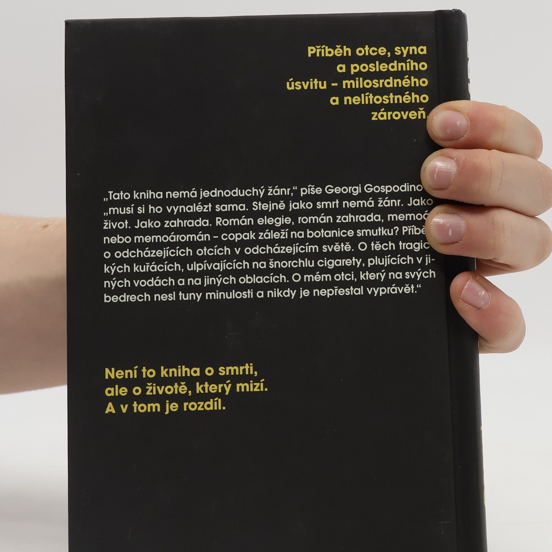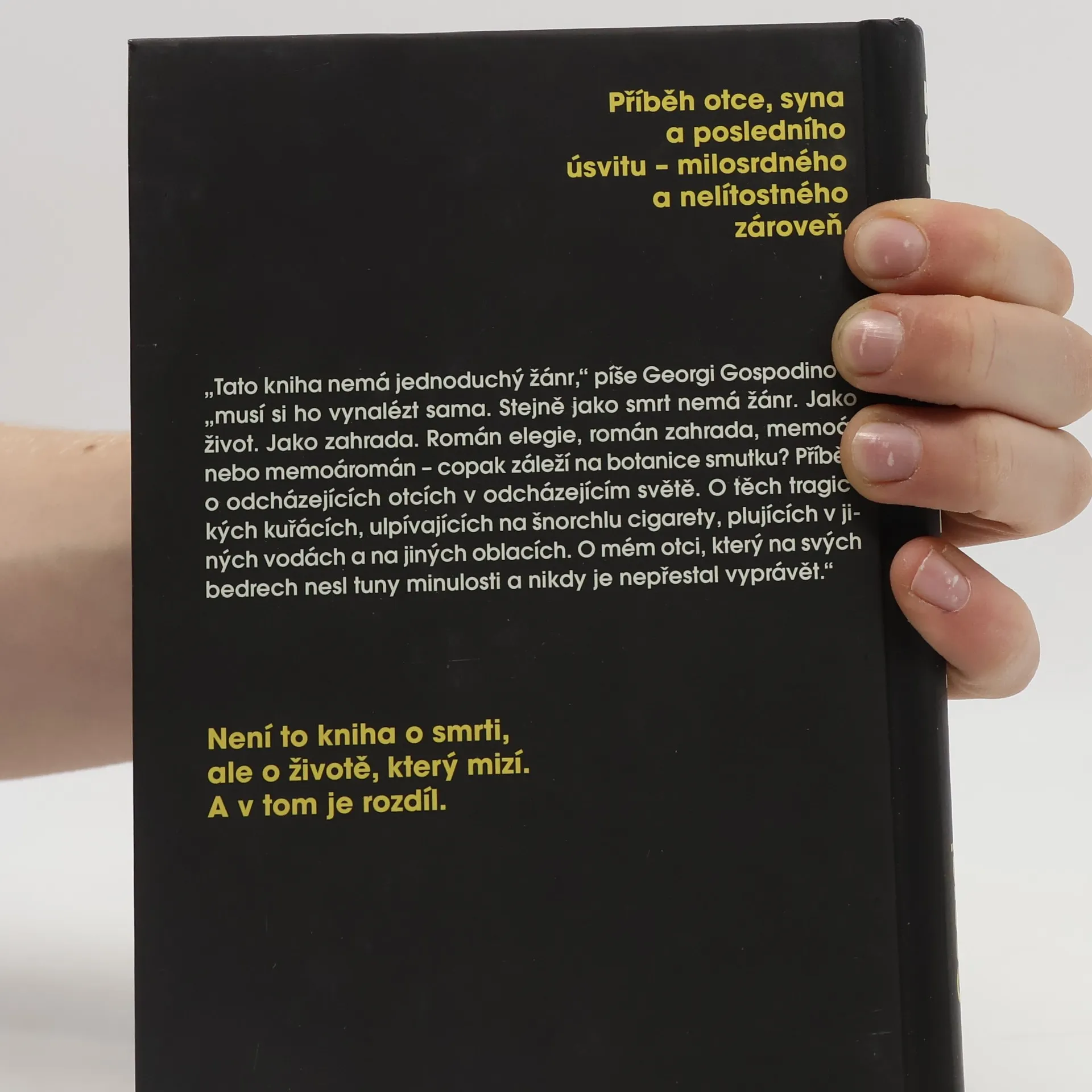 Můj otec byl zahradníkem. Nyní je zahradou.Příběh otce, syna a posledního úsvitu – milosrdného a nelítostného zároveň. „Tato kniha nemá jednoduchý žánr,“ píše Georgi Gospodinov, „musí si ho vynalézt sama. Stejně jako smrt nemá žánr. Jako život. Jako zahrada. Román elegie, román zahrada, memoár nebo memoromán – copak záleží na botanice smutku? Příběh o odcházejících otcích v odcházejícím světě.O těch tragických kuřácích, ulpívajících na šnorchlu cigarety, plujících v jiných vodách a na jiných oblacích. O mém otci, který na svých bedrech nesl tuny minulosti a nikdy je nepřestal vyprávět.“ Není to kniha o smrti, ale o životě, který mizí. A v tom je rozdíl.