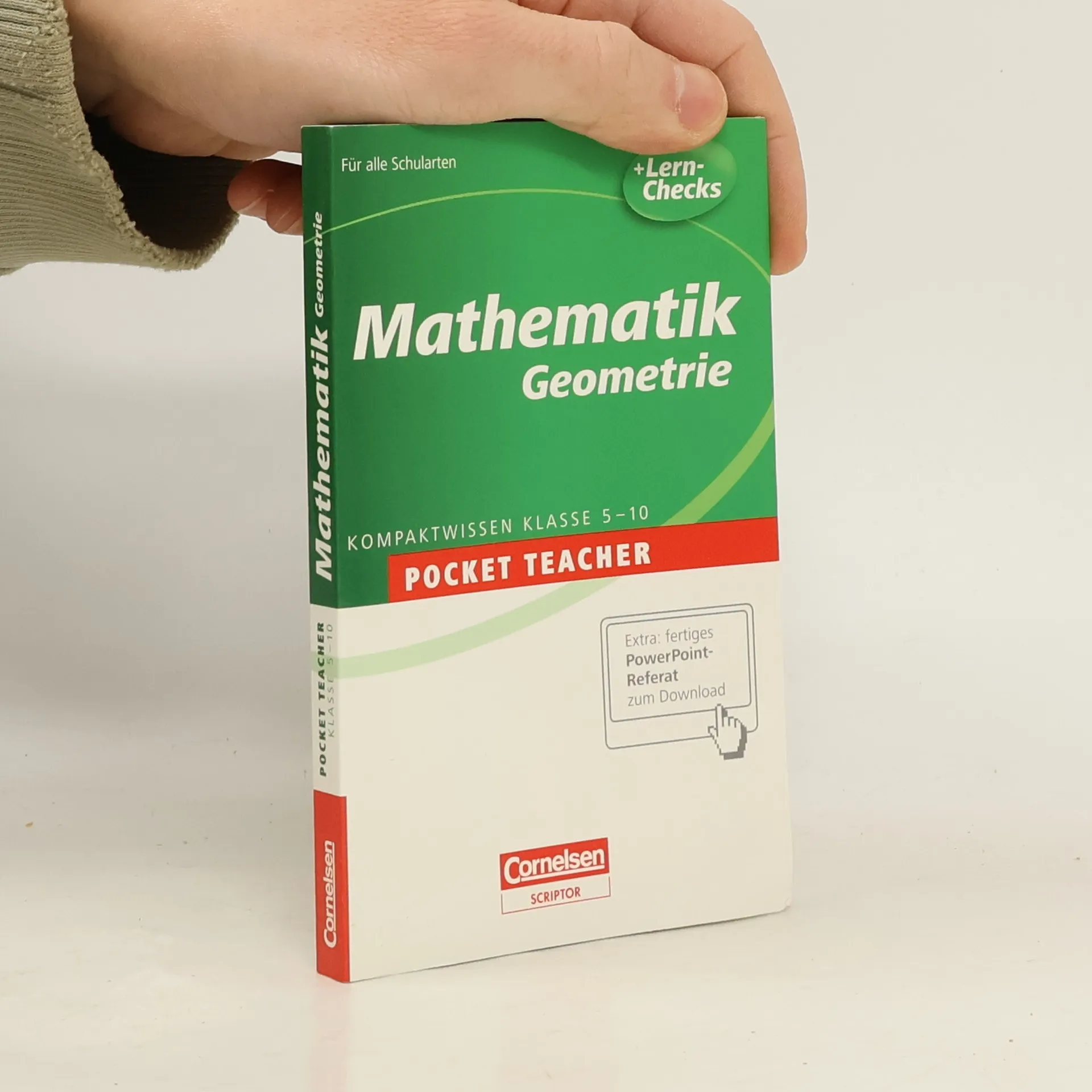 Überarbeitete Neuausgabe in der handlichen, gut eingeführten Reihe "Pocket teacher" (zuletzt BA 5/05). Der grundlegende Geometriestoff der Klassen 5-10 (ohne trigonometrische Funktionen) wird mit Musteraufgaben und -lösungen rekapituliert. Jedes der 13 Kapitel schließt jetzt mit einem "Lern-Check" zur Selbsteinschätzung. Das Layout hat sich etwas geändert und der Umfang ist um ca. 40 Seiten gewachsen. Übersicht der wichtigsten geometrischen Figuren in den aufklappbaren Umschlagseiten. - Empfohlen für das schnelle Nachschlagen und Wiederholen neben "Geometrie" aus der vergleichbaren Stark-Reihe "Kompakt-Wissen" von A. Müller (BA 5/09) . Zur Erst- oder Nachbeschaffung. (1 S)