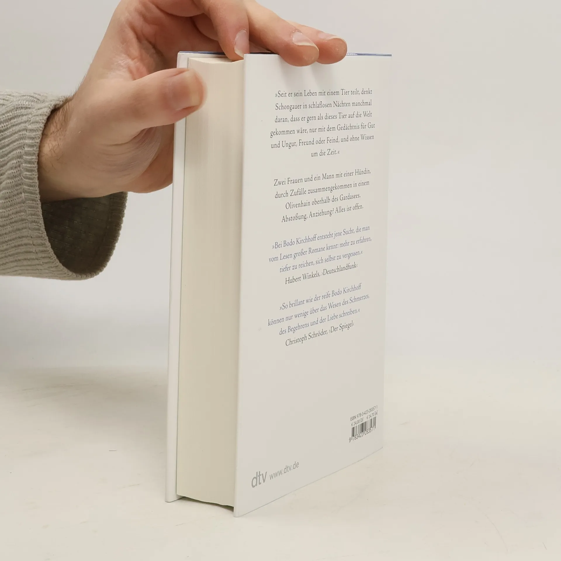 »Ein Meistererzähler.« Richard Kämmerlings Vier Tage vor dem Höhepunkt des Sommers, dort, wo sich Louis Arthur Schongauer, einst düsterer Deutscher in Hollywood-Filmen, nach dem Tod seiner Frau zurückgezogen hat. Jetzt will er nur noch mit seiner Hündin leben, inmitten alter Oliven oberhalb des Gardasees. Doch dann strandet eine Reisebloggerin beim Wenden in seiner Zufahrt, und am nächsten Tag erwartet er eine Autorin, die ihn mit einem Porträt aus der Vergessenheit holen will: zwei Frauen mit Gespür für die Wunden in seinem Leben. Umso wichtiger wird ihm nun sein Tier, für das es nur ein Hier und Jetzt gibt … In Bodo Kirchhoffs neuem Roman geht es um die Sehnsucht nach dem Menschen, der uns erkennt, und die Abgründe, die sich auftun, wenn wir dieser Sehnsucht folgen.