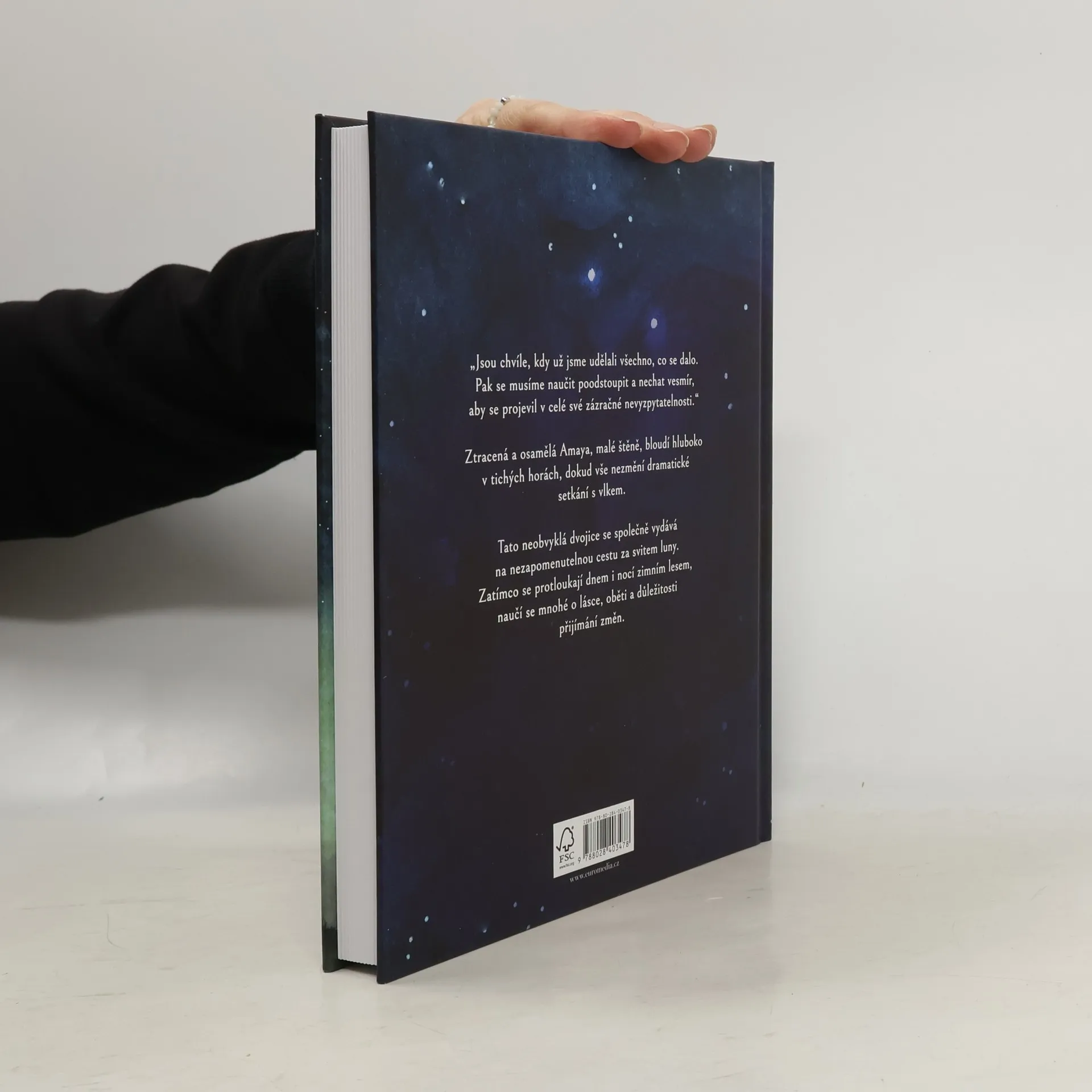 Štěně Amaya se ztratí ve strašlivé sněhové bouři. Samotinká bloudí uprostřed tichých hor a hledá své rodiče. Pak ale potká moudrého starého vlka, který se jí ujme a stane se jejím průvodcem na nezapomenutelné dobrodružné cestě za svitem luny. Zatímco spolu putují dnem i nocí zimní krajinou, oba se učí důležitým lekcím o lásce, oběti, životě, ztrátě a nakonec i o změně. Vydejte se spolu s nimi na výpravu, která už ve vás zůstane navždy.