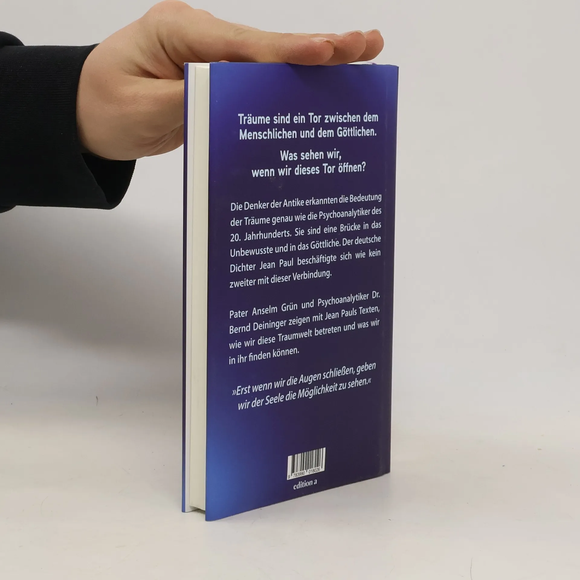 Träume sind ein Tor zwischen dem Menschlichen und dem Göttlichen. Was sehen wir, wenn wir dieses Tor öffnen? Die Denker der Antike erkannten die Bedeutung der Träume genau wie die Psychoanalytiker des 19. Jahrhunderts. Sie sind eine Brücke in das Unbewusste und in das Göttliche. Der deutsche Dichter Jean Paul beschäftigte sich wie kein zweiter mit dieser Verbindung. Pater Anselm Grün und Psychoanalytiker Dr. Bernd Deininger zeigen mit Jean Pauls Texten, wie wir diese Traumwelt betreten können und was wir in ihr finden können. »Erst wenn wir die Augen schließen, geben wir der Seele die Möglichkeit zu sehen.«