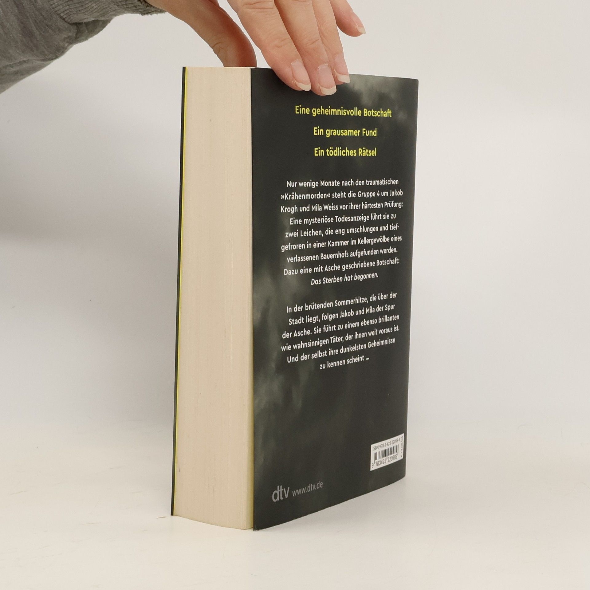 Das Sterben hat erst begonnen Nur wenige Monate nach den traumatischen Krähenmorden steht die Sonderermittlungsgruppe 4 um Jakob Krogh und Mila Weiss vor ihrer härtesten Prüfung: Eine mysteriöse Todesanzeige führt sie zu zwei Leichen, die eng umschlungen und tiefgefroren im Keller eines verlassenen Bauernhofs aufgefunden werden. Dazu eine mit Asche geschriebene Botschaft: Das Sterben hat begonnen. In der brütenden Sommerhitze, die über der Stadt liegt, folgen Jakob und Mila der Spur der Asche bis zu einem ebenso brillanten wie wahnsinnigen Täter, der ihnen weit voraus ist. Und der selbst ihre dunkelsten Geheimnisse zu kennen scheint …