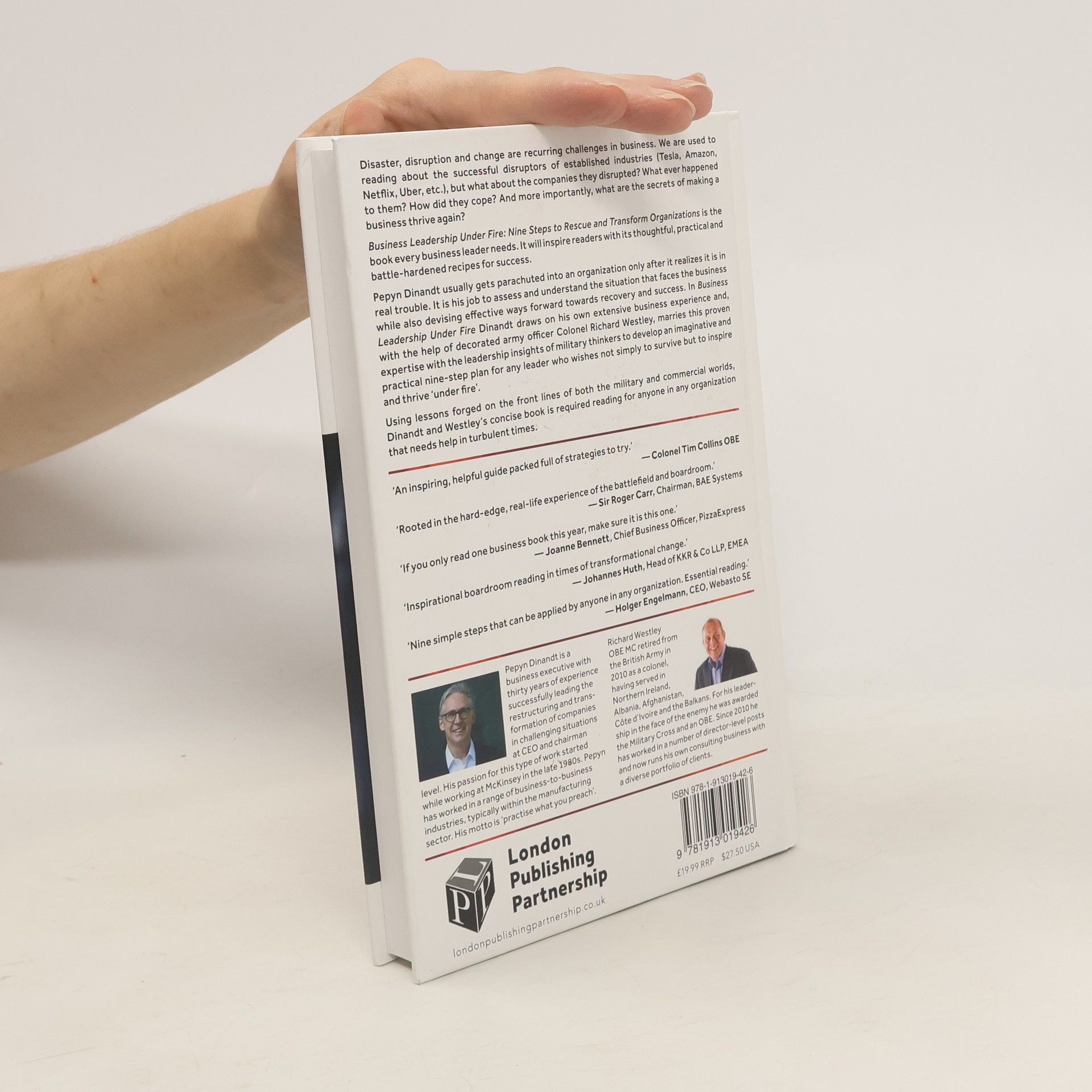 Disaster, disruption and change are recurring challenges in business. We are used to reading about the successful disruptors of established industries (Tesla, Amazon, Netflix, Uber, etc.), but what about the companies they disrupted? What ever happened to them? How did they cope? And more importantly, what are the secrets of making a business thrive again?Business Leadership Under Nine Steps to Rescue and Transform Organizations is the book every business leader needs. It will inspire readers with its thoughtful, practical and battle-hardened recipes for success.Pepyn Dinandt usually gets parachuted into an organization only after it realizes it is in real trouble. It is his job to assess and understand the situation that faces the business while also devising effective ways forward towards recovery and success. In Business Leadership Under Fire Dinandt draws on his own extensive business experience and, with the help of decorated army officer Colonel Richard Westley, marries this proven expertise with the leadership insights of military thinkers to develop an imaginative and practical nine-step plan for any leader who wishes not simply to survive but to inspire and thrive “under fire”.Using lessons forged on the front lines of both the military and commercial worlds, Dinandt and Westley’s concise book is required reading for anyone in any organization that needs help in turbulent times.