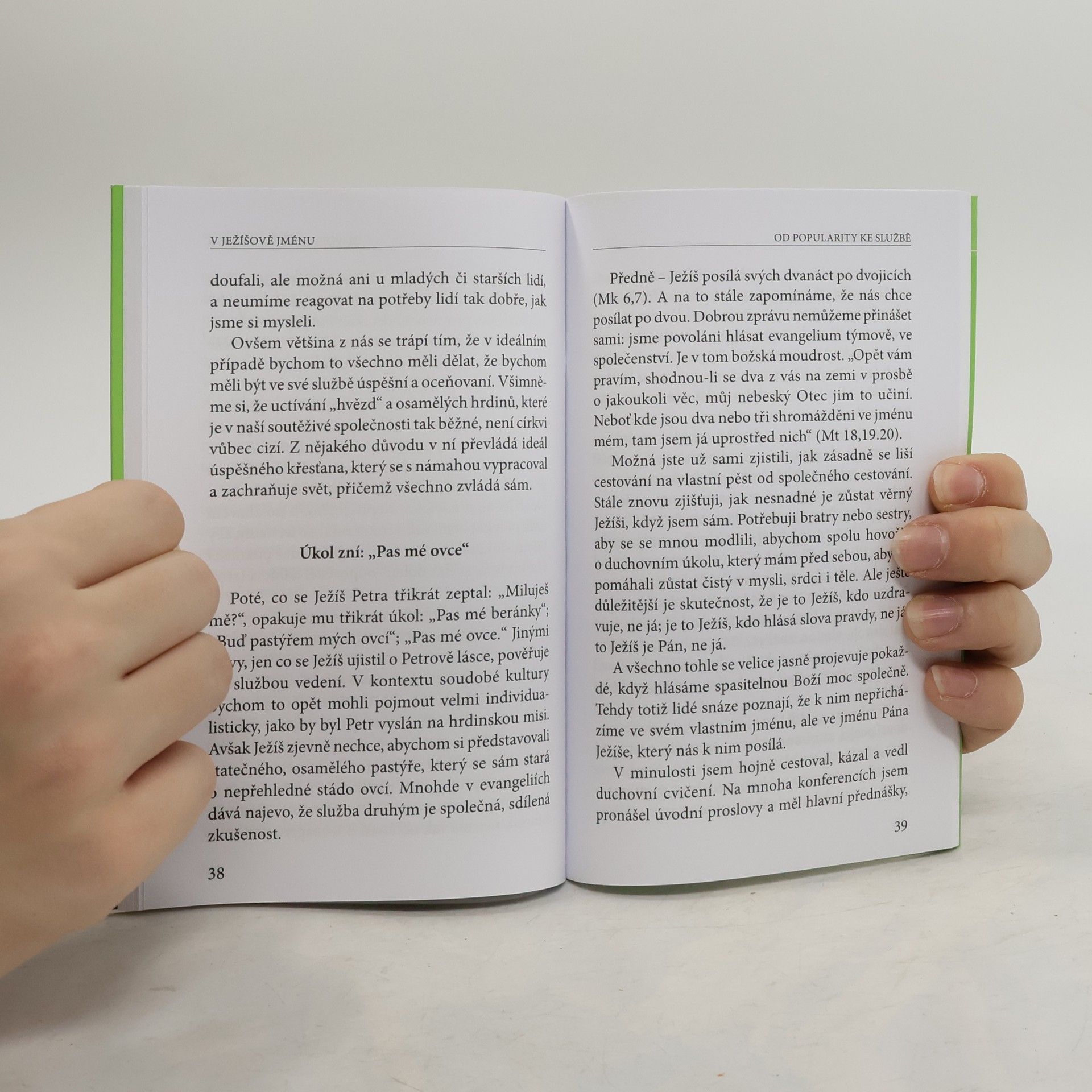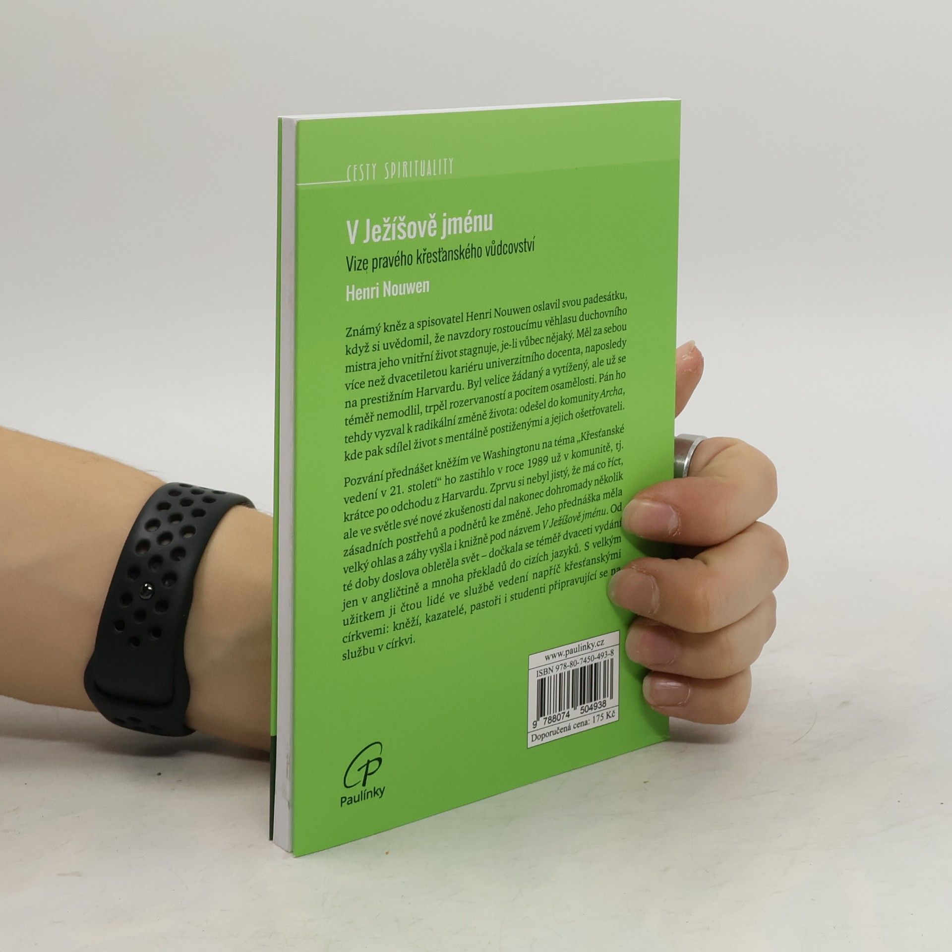 Známý kněz a spisovatel Henri Nouwen oslavil svou padesátku, když si uvědomil, že navzdory rostoucímu věhlasu duchovního mistra jeho vnitřní život stagnuje, je-li vůbec nějaký. Měl za sebou více než dvacetiletou kariéru univerzitního docenta, naposledy na prestižním Harvardu. Byl velice žádaný a vytížený, ale už se téměř nemodlil, trpěl rozervaností a pocitem osamělosti. Pán ho tehdy vyzval k radikální změně života: odešel do komunity Archa, kde pak sdílel život s mentálně postiženými a jejich ošetřovateli. Pozvání přednášet kněžím ve Washingtonu na téma „Křesťanské vedení v 21. století“ ho zastihlo v roce 1989 už v komunitě, tj. krátce po odchodu z Harvardu. Zprvu si nebyl jistý, že má co říct, ale ve světle své nové zkušenosti dal nakonec dohromady několik zásadních postřehů a podnětů ke změně. Jeho přednáška měla velký ohlas a záhy vyšla i knižně pod názvem V Ježíšově jménu. Od té doby doslova obletěla svět – dočkala se téměř dvaceti vydání jen v angličtině a mnoha překladů do cizích jazyků. S velkým užitkem ji čtou lidé ve službě vedení napříč křesťanskými církvemi: kněží, kazatelé, pastoři i studenti připravující se na službu v církvi.