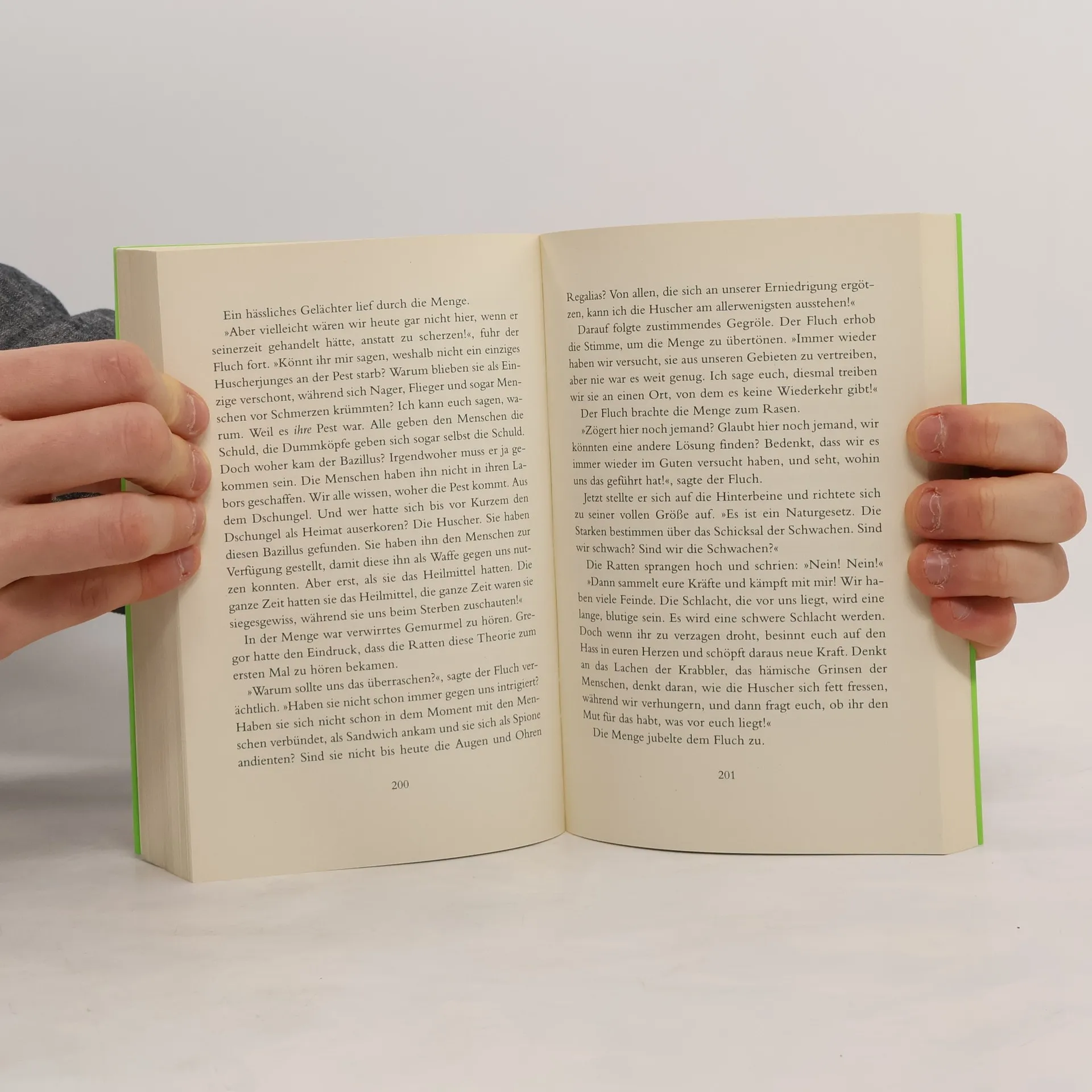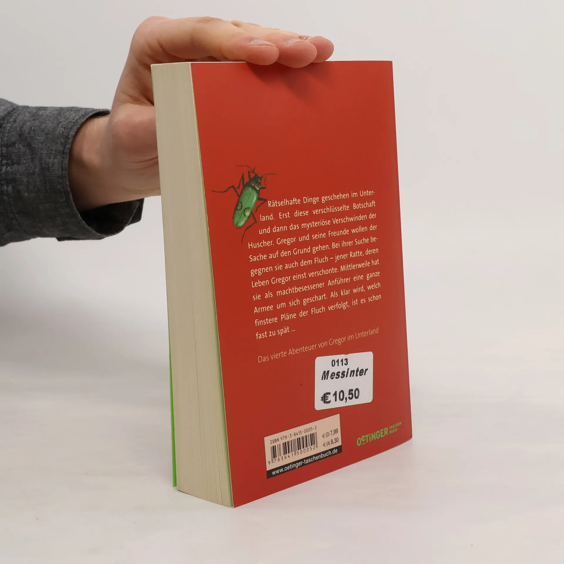 Die dunkle Seite greift an . Rätselhafte Dinge geschehen im Unterland. Gregor und Luxa erreicht eine verschlüsselte Botschaft der Huscher, ein verzweifelter Hilferuf. Die beiden machen sich große Sorgen und machen sich auf die gefährliche Suche nach den Mäusen, um sie zu retten. Auf ihrem Weg werden sie von angriffslustigen Riesenskorpionen bedroht und begegnen dem Fluch, jener weißen Ratte, die Gregor einst aus Mitleid verschont hat. Sie ist zu einem machtbesessenen Anführer herangewachsen und verfolgt mit einer ganzen Armee wütender Ratten einen tödlichen Plan. Band vier der fünfbändigen Gregor-Saga - zum Mitfühlen und Mitfiebern! Von der Autorin der „Tribute von Panem“.