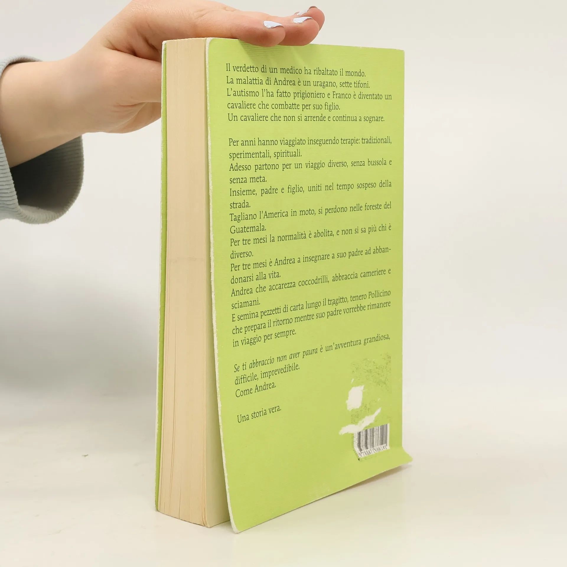 Il verdetto di un medico ha ribaltato il mondo. La malattia di Andrea è un uragano, sette tifoni. L'autismo l'ha fatto prigioniero e Franco è diventato un cavaliere che combatte per suo figlio. Un cavaliere che non si arrende e continua a sognare. Per anni hanno viaggiato inseguendo terapie: tradizionali, sperimentali, spirituali. Adesso partono per un viaggio diverso, senza bussola e senza meta. Insieme, padre e figlio, uniti nel tempo sospeso della strada. Tagliano l'America in moto, si perdono nelle foreste del Guatemala. Per tre mesi la normalità è abolita, e non si sa più chi è diverso. Per tre mesi è Andrea a insegnare a suo padre ad abbandonarsi alla vita. Andrea che accarezza coccodrilli, abbraccia cameriere e sciamani. E semina pezzetti di carta lungo il tragitto, tenero Pollicino che prepara il ritorno mentre suo padre vorrebbe rimanere in viaggio per sempre.