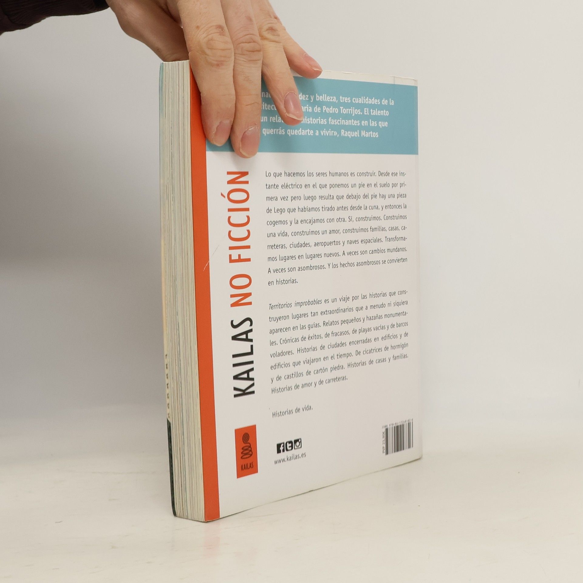"Lo que hacemos los seres humanos es construir. Desde ese instante eléctrico en el que ponemos un pie en el suelo por primera vez pero luego resulta que debajo del pie hay una pieza de Lego que habíamos tirado antes desde la cuna, y entonces la cogemos y la encajamos con otra. Sí, construimos. Construimos una vida, construimos un amor, construimos familias, casas, carreteras, ciudades, aeropuertos y naves espaciales. Transformamos lugares en lugares nuevos. A veces son cambios mundanos. A veces son asombrosos. Y los hechos asombrosos se convierten en historias.Territorios improbables es un viaje por las historias que construyeron lugares tan extraordinarios que a menudo ni siquiera aparecen en las guías. Relatos pequeños y hazañas monumentales. Crónicas de éxitos, de fracasos, de playas vacías y de barcos voladores. Historias de ciudades encerradas en edificios y de edificios que viajaron en el tiempo. De cicatrices de hormigón y de castillos de cartón piedra. Historias de casas y familias. Historias de amor y de carreteras" -- Publicaciones de Arquitectura y Arte