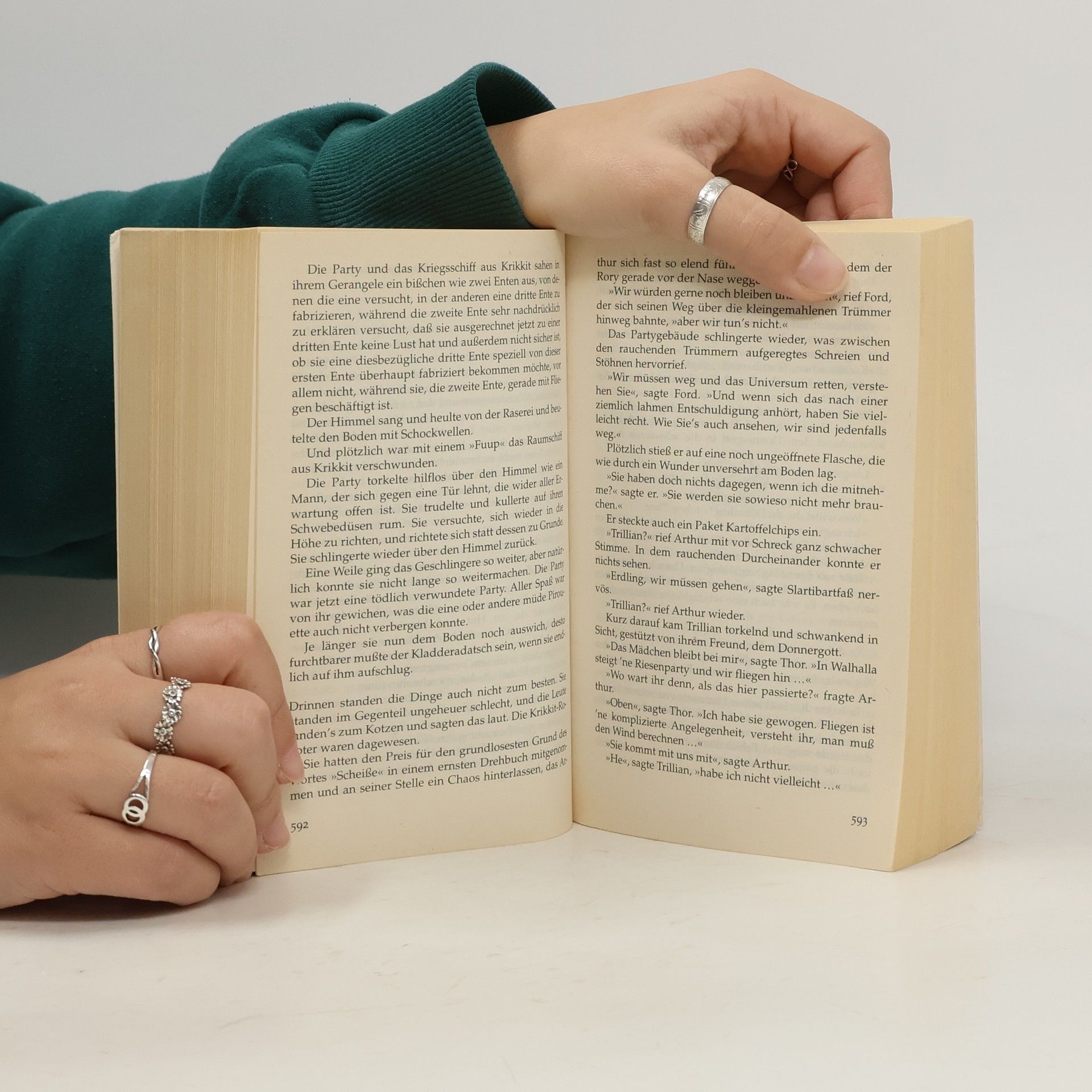 Vor 30 Jahren wurde von einem der größten Verlage Ursa Minors (und der Erde) das bemerkenswerteste Buch, das je veröffentlicht wurde, der Menschheit zugänglich gemacht: Per Anhalter durch die Galaxis. Für Arthur Dent ist es ein ganz normaler Donnerstag, bis sein Haus von Planierraupen niedergewalzt wird. Kurz darauf wird allerdings auch die gesamte Erde von einem vogonischen Bautrupp plattgemacht, weil sie einer Hyperraum-Umgehungsstraße weichen muss. Aber da hat sich Arthurs bester Freund schon längst als Alien entpuppt, und sie sausen durchs Weltall mit nichts als ihren Badetüchern und einem harmlos wirkenden Buch, auf dem in großen, freundlichen Buchstaben »KEINE PANIK« steht. Und dabei hat das Wochenende gerade erst angefangen…