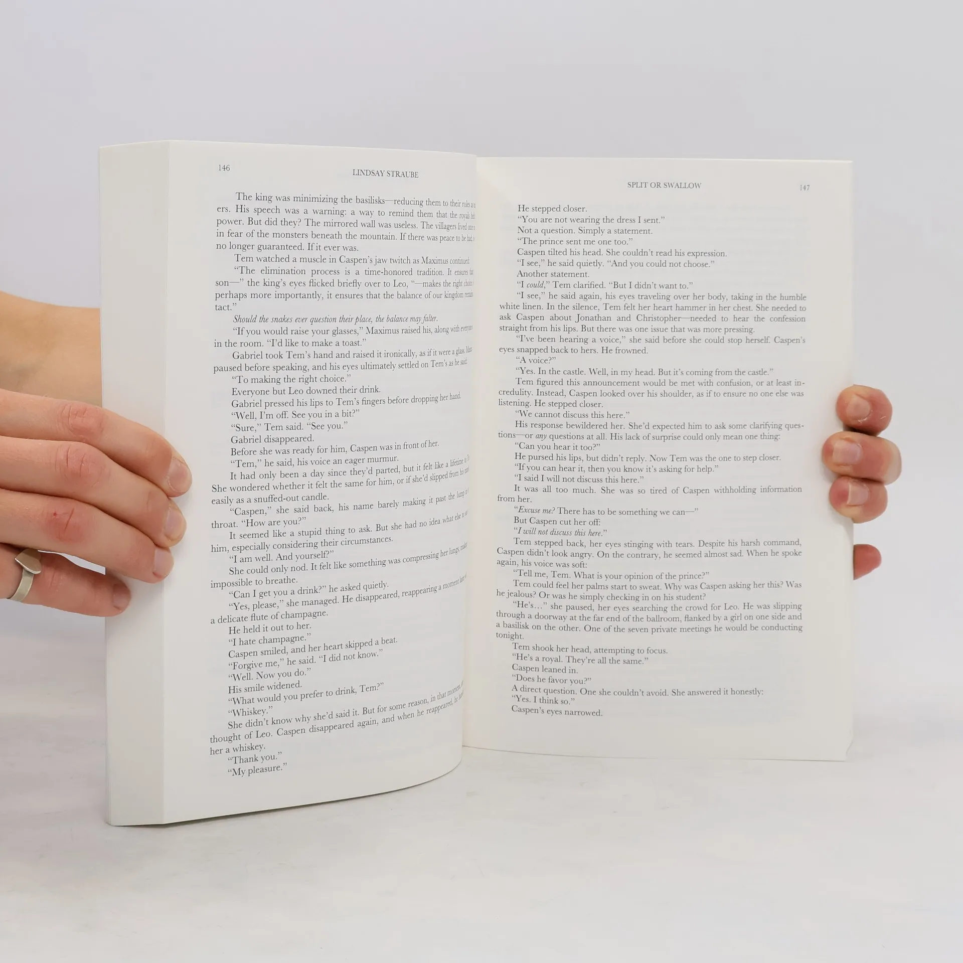 THIS BOOK IS NOT SAFE TO READ AT WORK. YOU'VE BEEN WARNED. Twenty year old Temperance Verus has never been kissed. But that's what the basilisk is for.Along with thirteen other contestants, Tem must train with a basilisk to learn the power of seduction and win the prince's hand in marriage. When Tem is matched with Caspen, the Serpent King, she realizes she might actually stand a chance. But with tensions rising between the basilisks and the humans, Tem is suddenly torn in two directions. As her bond with Caspen deepens, so does her connection with the prince. And when she uncovers a terrible secret about the royal family, Tem finds herself caught between two neither of which she can survive without.Guaranteed to make you blush (and then some), Split or Swallow is like if fanfic Draco Malfoy went on the Bachelor and had to compete with a snake. Sounds fun, doesn't it? That's because it is!!