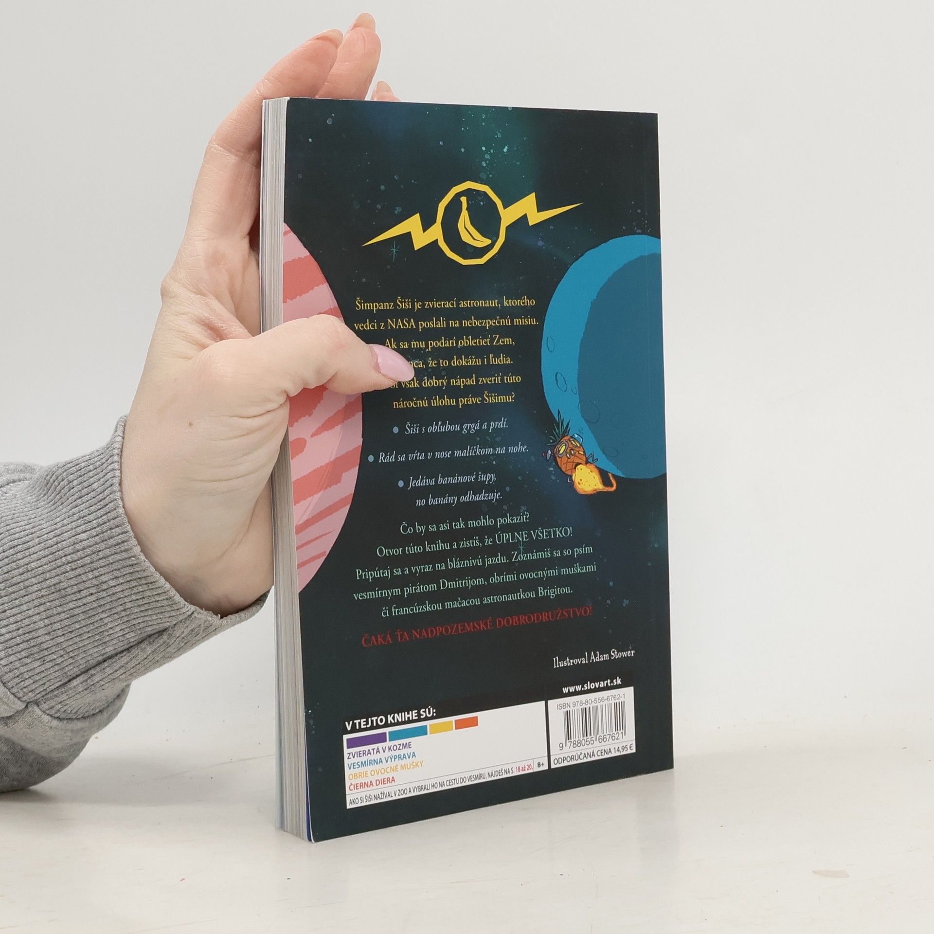 Z fantastického sveta najobľúbenejšieho detského spisovateľa Davida Walliamsa k vám letí prvý KOZMICKÝ KOMIKS! Šimpanz Šiši je zvierací astronaut, ktorého vedci z NASA poslali na nebezpečnú misiu. Ak sa mu podarí obletieť Zem, je šanca, že to dokážu i ľudia. Bol však dobrý nápad zveriťtúto náročnú úlohu práve Šišimu? Posúďte sami: Šiši s obľubou grgá a prdí. Rád sa vŕta v nose malíčkom na nohe. Jedáva banánové šupy, no banány odhadzuje. Čo by sa asi tak mohlo pokaziť? Keď otvoríte túto knihu, zistíte, že ÚPLNE VŠETKO! Pripútajte sa a vyrazte na bláznivú jazdu, počas ktorej sa zoznámite so psím vesmírnym pirátom Dmitrijom, s obrími ovocnými muškami či francúzskou mačacou astronautkou Brigitou. Čaká vás nadpozemské dobrodružstvo!