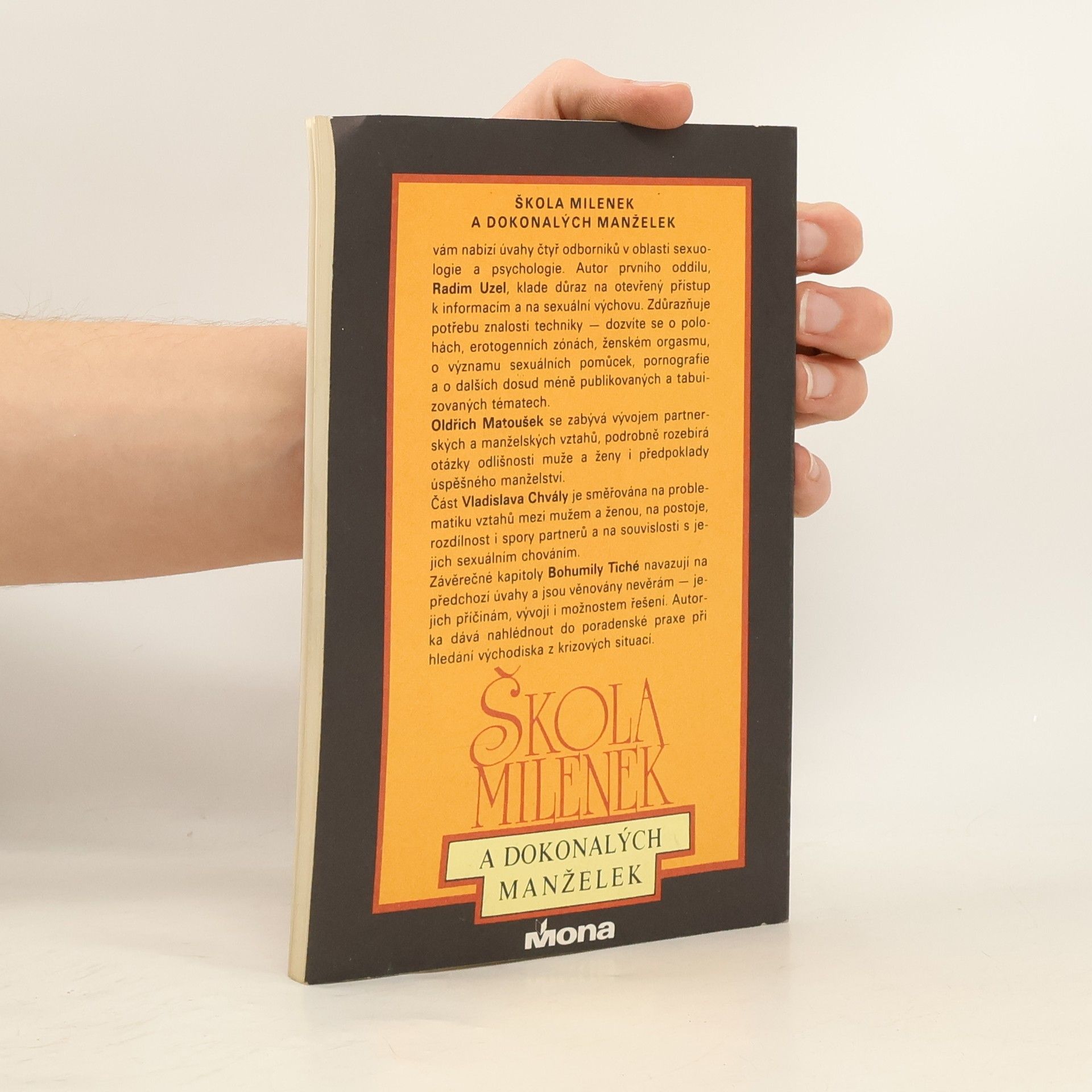 Škola milenek a dokonalých manželek vám nabízí úvahy čtyř odborníků v oblasti sexuologie a psychologie. Autor prvního oddílu Radim Uzel, klade důraz na otevřený přístupu k informacím a na sexuální výchovu. Zdůrazňuj potřebu znalosti techniky - dozvíte se o polohách, erotogenních zónách, ženském orgasmu, o významu sexuálních pomůcek, pornografie a o dalších dosud méně publikovaných a tabuizovaných tématech. Oldřich Matoušek se zabývá vývojem partnerských a manželských vztahů, podrobně rozebírá otázky odlišnosti muže a ženy i předpoklady úspěšného manželství. Část Vladislava Chvály je směřována na problematiku vztahů mezi mužem a ženou, na postoje, rozdílnost i spory partnerů a na souvislosti s jejich sexuálním chováním. Závěrečné kapitoly Bohumily Tiché navazují na předchozí úvahy a jsou věnovány nevěrám - jejich příčinám, vývoji i možnostem řešení. Autorka dává nahlédnout do poradenské praxe při hledání východiska z krizových situací.