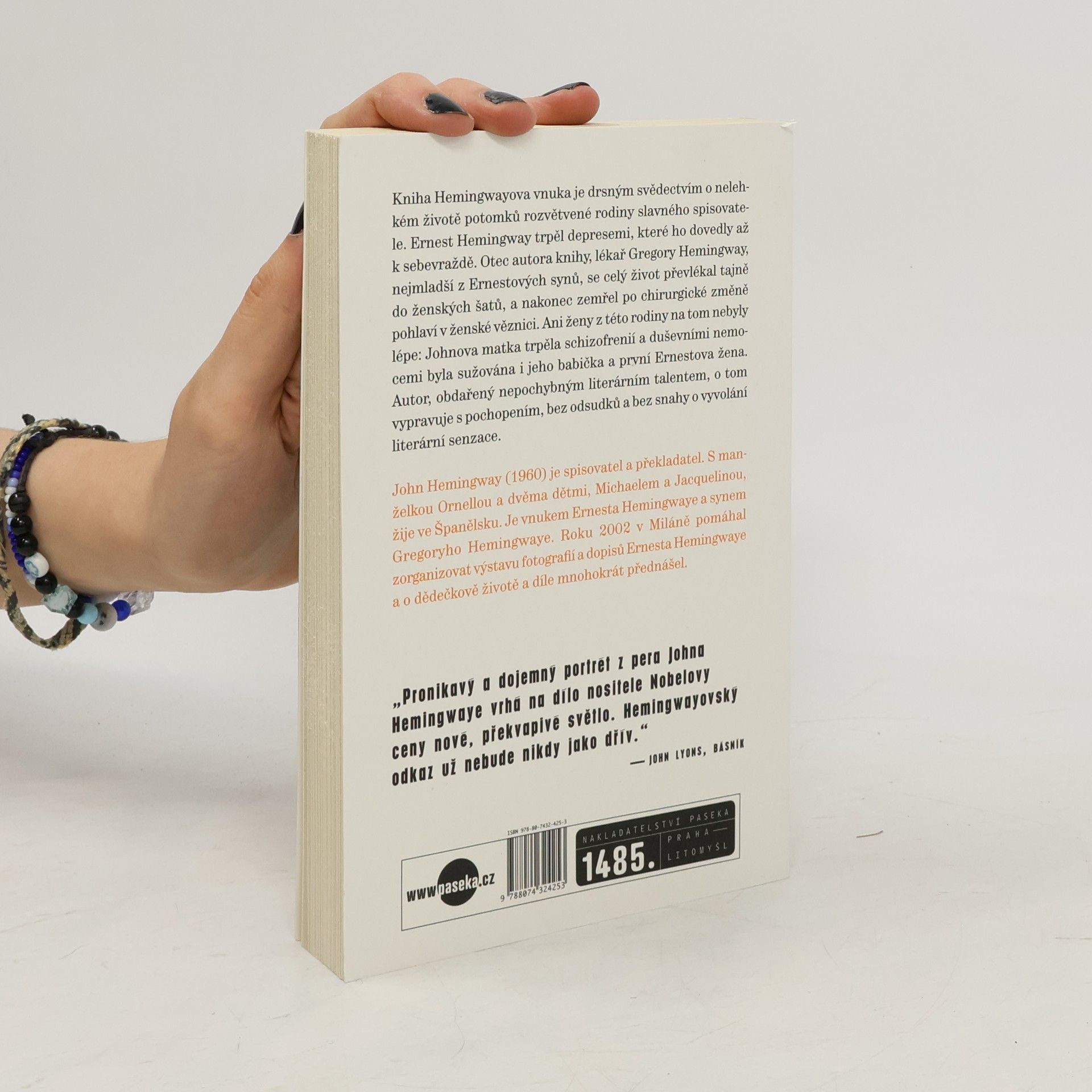 Kniha Hemingwayova vnuka je tvrdým svědectvím o nelehkém životě potomků rozvětvené rodiny slavného spisovatele. Ernest Hemingway trpěl depresemi, které ho dovedly až k sebevraždě. Otec autora knihy, lékař Gregory Hemingway, nejmladší z Ernestových synů, se celý život převlékal tajně do ženských šatů a nakonec zemřel po chirurgické změně pohlaví v ženské věznici. Ani ženy z této rodiny na tom nebyly lépe: Johnova matka trpěla schizofrenií a duševními nemocemi byla sužována i jeho babička a první Ernstova žena. Autor, obdařený nepochybným literárním talentem, o tom vypravuje s pochopením, bez odsudků a bez snahy o vyvolání literární senzace.