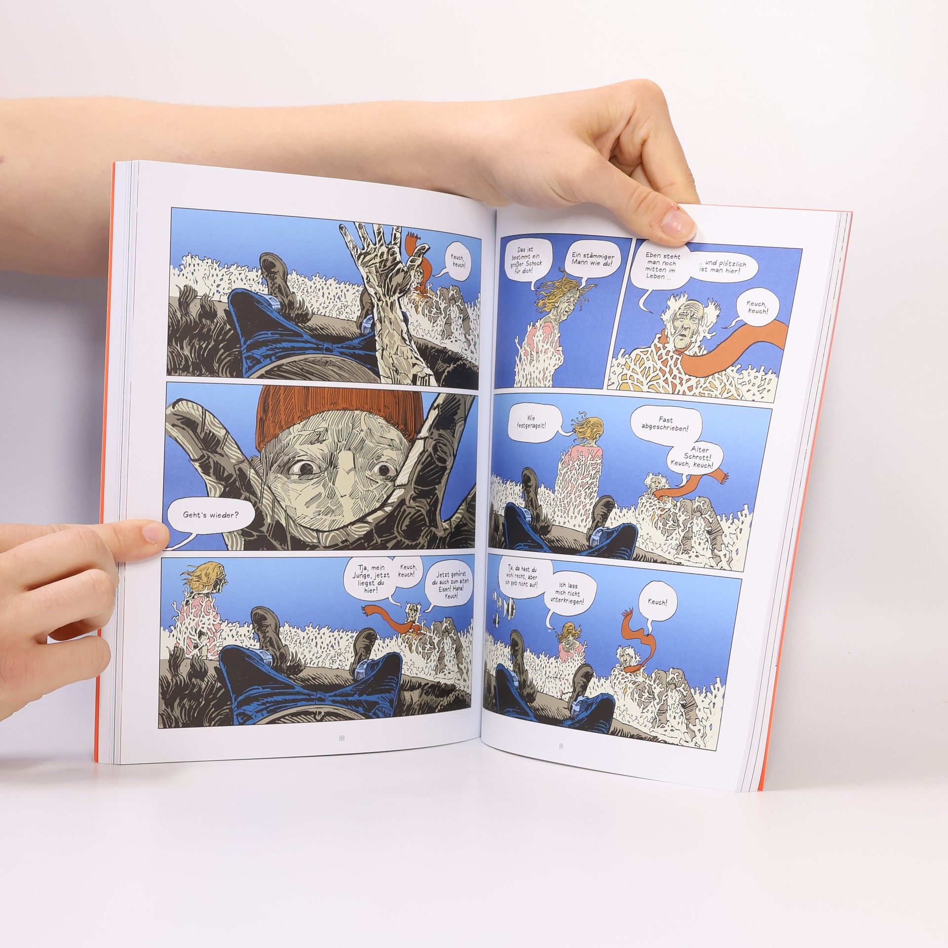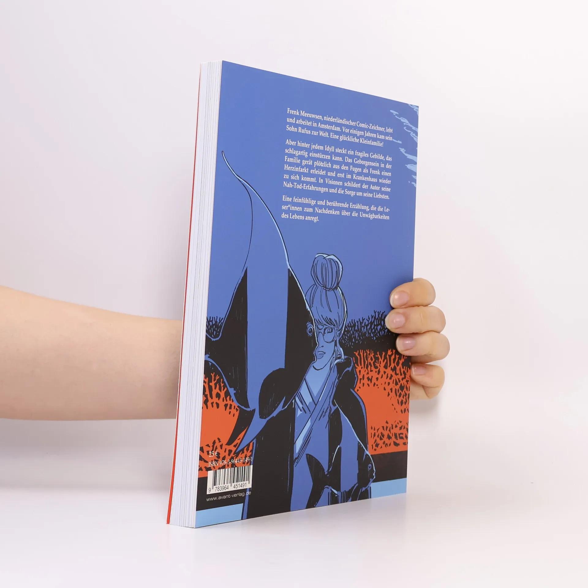 Frenk Meeuwsen, niederländischer Comiczeichner, lebt und arbeitet in Amsterdam. Vor einigen Jahren kam sein Sohn Rufus zur Welt. Die Diskrepanz zwischen dem Geborgensein in der Familie und der meist abstrakten Bedrohung, durch Unfall, Krankheit oder Tod ein Familienmitglied zu verlieren, ist das Thema dieser Erzählung. Was zum einen wie ein Idyll scheint, ist tatsächlich ein fragiles Gebilde, das schlagartig einstürzen kann. Seine Ängste werden plötzlich real, als Frenk einen Schlaganfall erleidet und erst im Krankenhaus wieder aufwacht. In Visionen schildert der Autor seine Nah-Tod-Erfahrungen und die Sorge um seine geliebte Familie. Eine feinfühlige und berührende Erzählung, die die Leser*innen in die Lebens- und Gedankenwelt des Autors einlädt und zum Nachdenken über die Unwägbarkeiten des Lebens anregt.