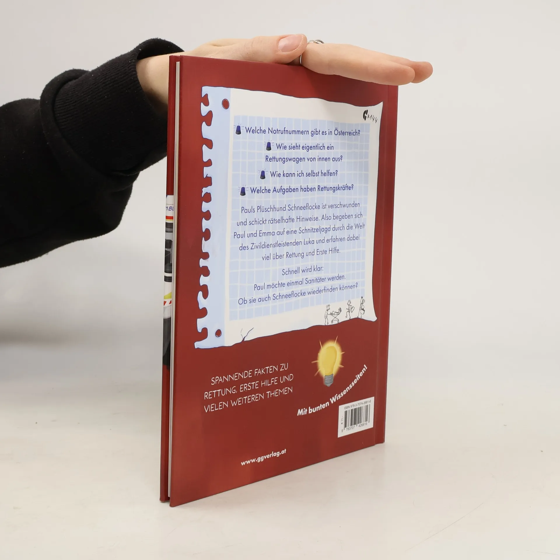 Welche Notrufnummern gibt es in Österreich? Wie sieht eigentlich ein Rettungswagen von innen aus? Wie kann ich selbst helfen? Pauls Plüschhund Schneeflocke ist verschwunden! Er hat den Hund bekommen, als er sich am Bein verletzt hat und von der Rettung ins Krankenhaus gebracht wurde. Doch jetzt ist er weg. Gemeinsam mit seiner Zwillingsschwester Emma begibt sich Paul auf eine Schnitzeljagd durch die Welt des Zivildienstleisters Luka. Schnell wird klar: Paul möchte einmal Sanitäter werden. Ob sie Schneeflocke wiederfinden können? Lesebuch kombiniert mit spannenden Infoseiten Mit interessanten Fakten rund um das Thema Rettung und Erste Hilfe – von Experten Einen coolen Fall lösen und die Lesekompetenz stärken!