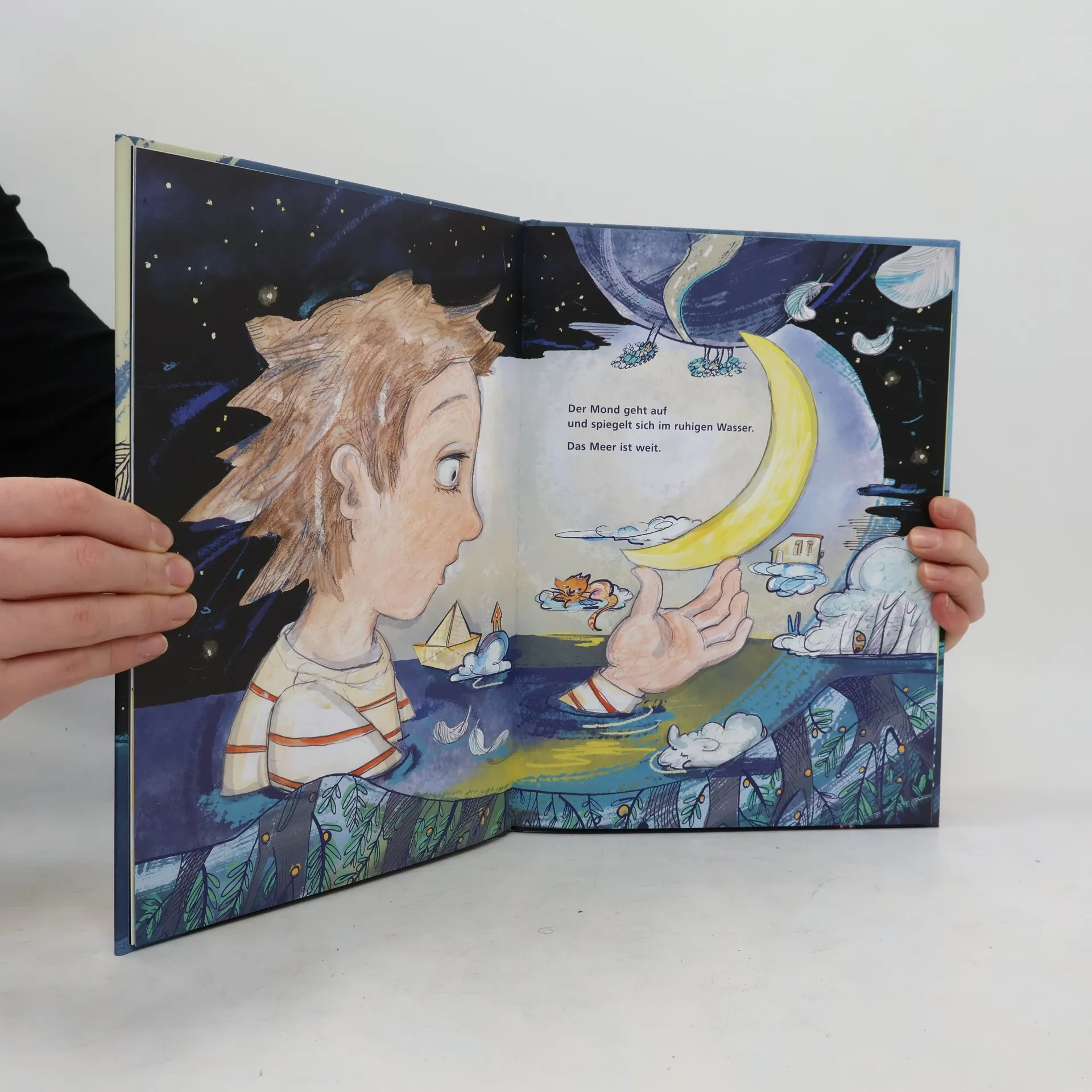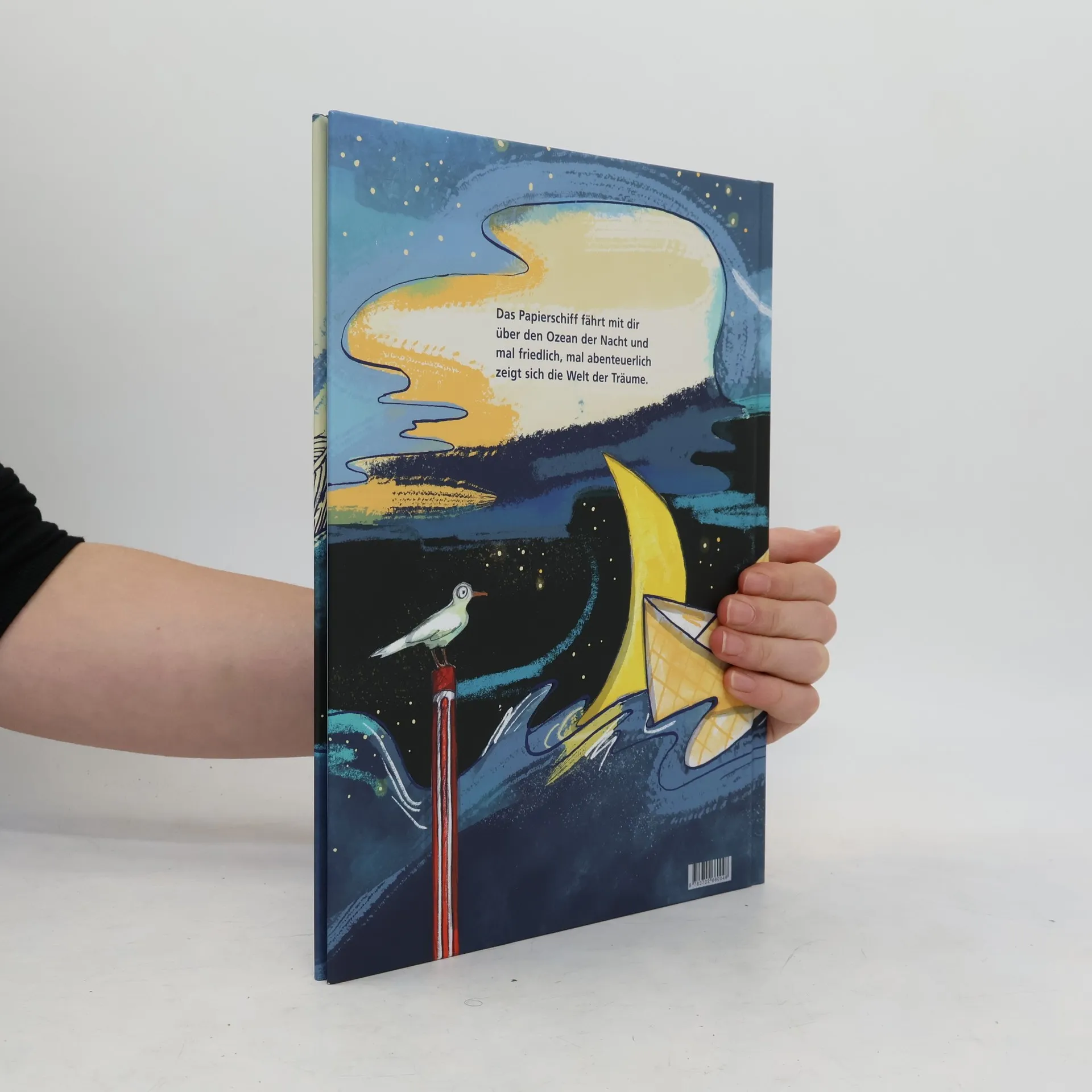 Wenn man einschläft, können die wundersamsten Dinge geschehen. Manchmal kommt es vorbei, das Papierschiff, und man segelt los auf der Suche nach Träumen. Der Ozean der Nacht zeigt sich prachtvoll schillernd, anfangs ist die Oberfläche spiegelglatt, später vom Sturm zersaust. Selbst ein Albtraum ist dabei – wie gut, dass einem nichts passieren kann. Mit viel Fingerspitzengefühl geht Sylvia Graupner dem Thema Traum auf den Grund, das Wasser trägt Kinder und ihre Gedanken durch eine vielfältige Kulisse, mal abenteuerlich, mal friedlich, immer nah an der jungen Zielgruppe. Stimmige Sätze werden von detailreichen, schwungvollen und farbintensiven Bildern begleitet.