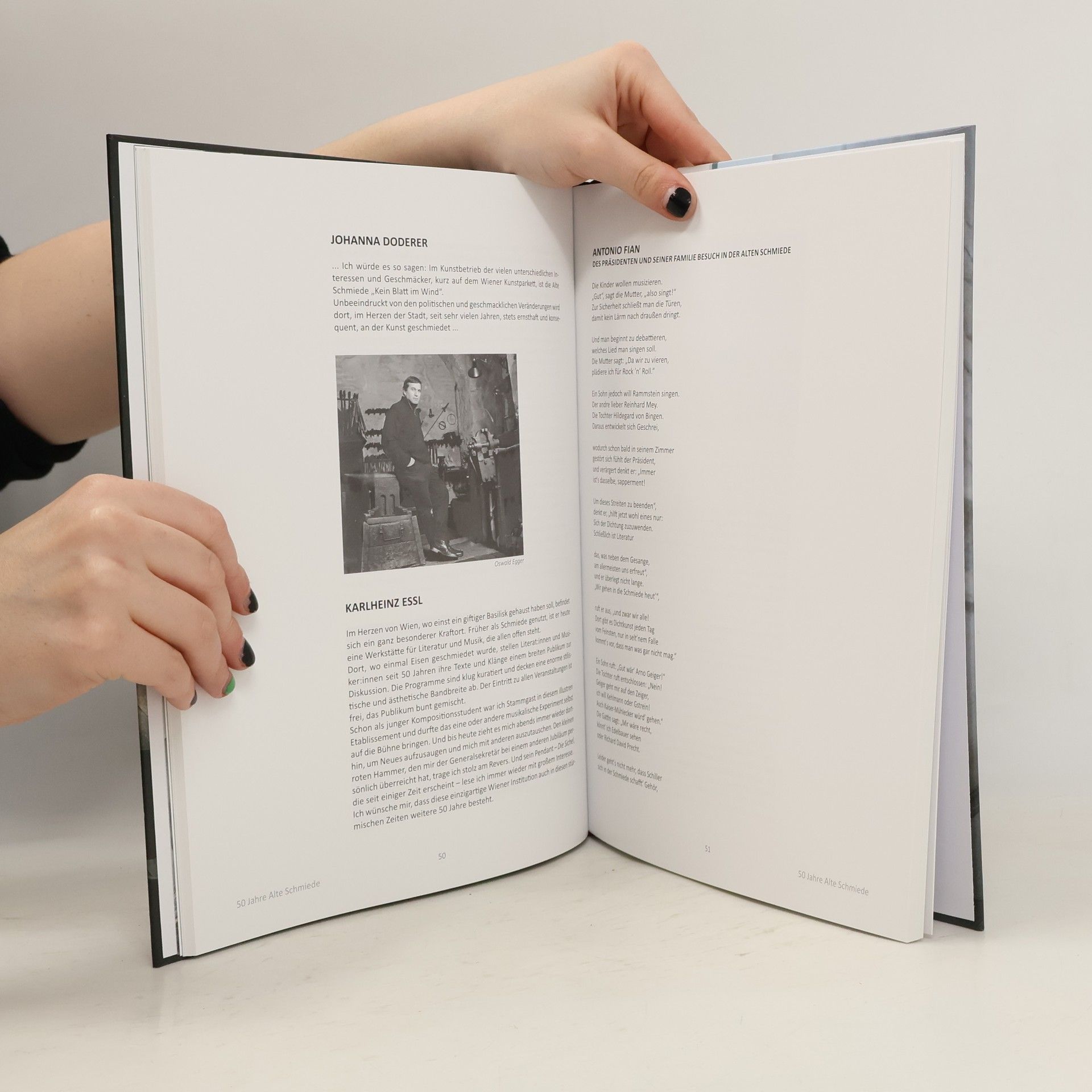 Die Festschrift Hammer & Amboss versucht kaleidoskopartig einen Ein- und Überblick über fünfzig Jahre Veranstaltungstätigkeit der Alten Schmiede zu geben.Mit Beiträgen von: Ilse Aichinger, Friedrich Cerha, Ann Cotten, Maša Dabic, Stefan Gmünder, Andrea Grill, Josef Haslinger, Elfriede Jelinek, Franz Koglmann, Konrad Paul Liessmann, Lydia Mischkulnig, Kathrin Röggla, Karlheinz Roschitz, Franz Schuh, Josef Schützenhöfer, Peter Strasser, Armin Thurnher, Andrea Winkler, u.a. Mit Würdigungen von Bürgermeister Michael Ludwig und Kulturstadträtin Veronica Kaup-Hasler. »Die Freiheit, in einem autonomen Raum intellektuelle Diskurse aufzuführen ohne dabei von einem Medium beherrscht zu werden – auch so ließen sich Statut und Programmangebot der Alten Schmiede definieren.« (Walter Famler)»Die erste Lesung war mit Friedrich Heer, die zweite mit Ilse Aichinger. Um das Literarische Quartier in der Stadt zu etablieren und die Wiener Gesellschaft darauf aufmerksam zu machen, wollte ich zu Beginn mit größeren Namen starten und danach Schritt für Schritt unbekannten Autoren und Autorinnen ein Forum bieten.« (Reinhard Urbach)»Grundprinzip war, dass wir kein Schauplatz der Repräsentation sind, sondern viel mehr ein Entwicklungslabor, ein Werkplatz für Autoren und Autorinnen, also gewissermaßen zuständig für Autorenförderung.« (Kurt Neumann)