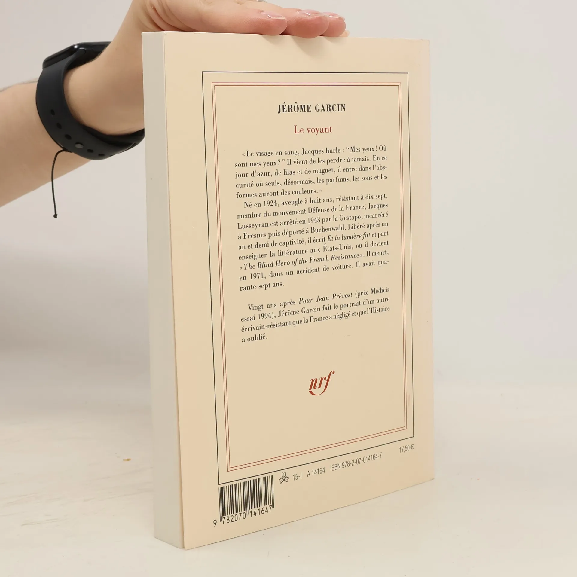 ""Le visage en sang, Jacques hurle : "Mes yeux Où sont mes yeux?" Il vient de les perdre à jamais. En ce jour d'azur, de lilas et de muguet, il entre dans l'obscurité où seuls, désormais, les parfums, les sons et les formes auront des couleurs." Né en 1924, aveugle à huit ans, résistant à dix-sept, membre du mouvement Défense de la France, Jacques Lusseyran est arrêté en 1943 par la Gestapo, incarcéré à Fresnes puis déporté à Buchenwald. Libéré après un an et demi de captivité, il écrit Et la lumière fut et part enseigner la littérature aux États-Unis, où il devient "The Blind Hero of the French Resistance". Il meurt, en 1971, dans un accident de voiture. Il avait quarante-sept ans. Vingt ans après Pour Jean Prévost (prix Médicis essai 1994), Jérôme Garcin fait le portrait d'un autre écrivain-résistant que la France a négligé et que l'Histoire a oublié."--P. [4] of cover