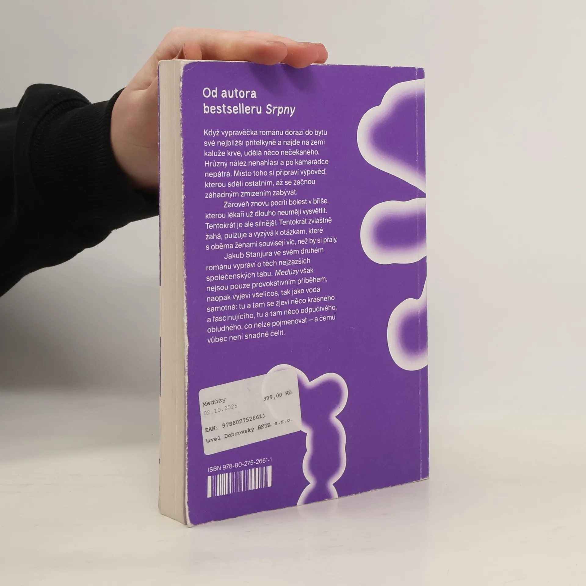 Pronikavý psychologický román o konci přátelství, vině a chronické bolesti Když vypravěčka románu dorazí do bytu své nejbližší přítelkyně a najde na zemi kaluže krve, udělá něco nečekaného. Hrůzný nález nenahlásí a po kamarádce nepátrá. Místo toho si připraví výpověď, kterou sdělí ostatním, až se začnou záhadným zmizením zabývat. Zároveň znovu pocítí bolest v břiše, kterou lékaři už dlouho neumějí vysvětlit. Tentokrát je ale silnější. Tentokrát zvláštně žahá, pulzuje a vyzývá k otázkám, které s oběma ženami souvisejí víc, než by si přály. Jakub Stanjura ve svém druhém románu vypráví o těch nejzazších společenských tabu. Medúzy však nejsou pouze provokativním příběhem, naopak vyjeví všelicos, tak jako voda samotná: tu a tam se zjeví něco krásného a fascinujícího, tu a tam něco odpudivého, obludného, co nelze pojmenovat — a čemu vůbec není snadné čelit.