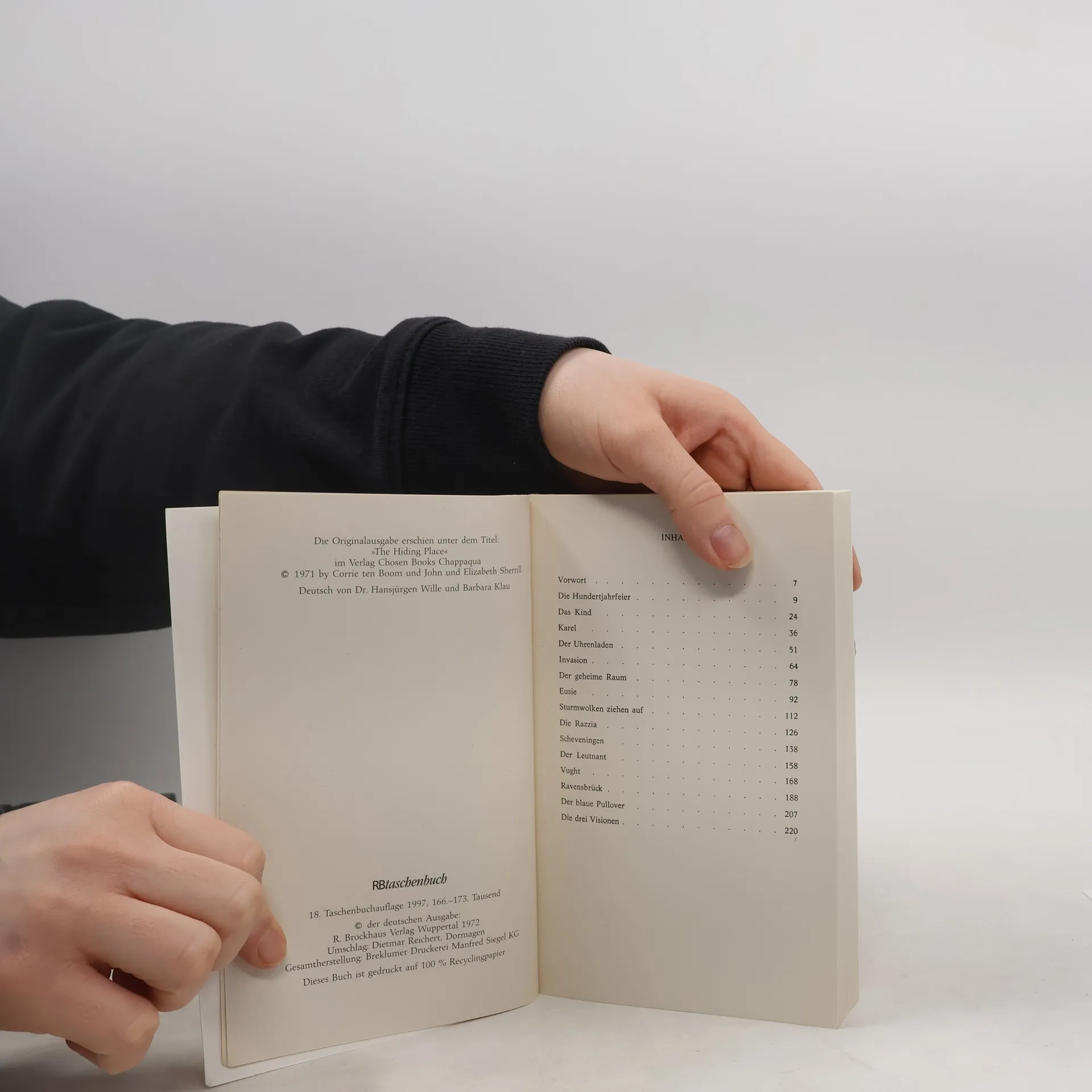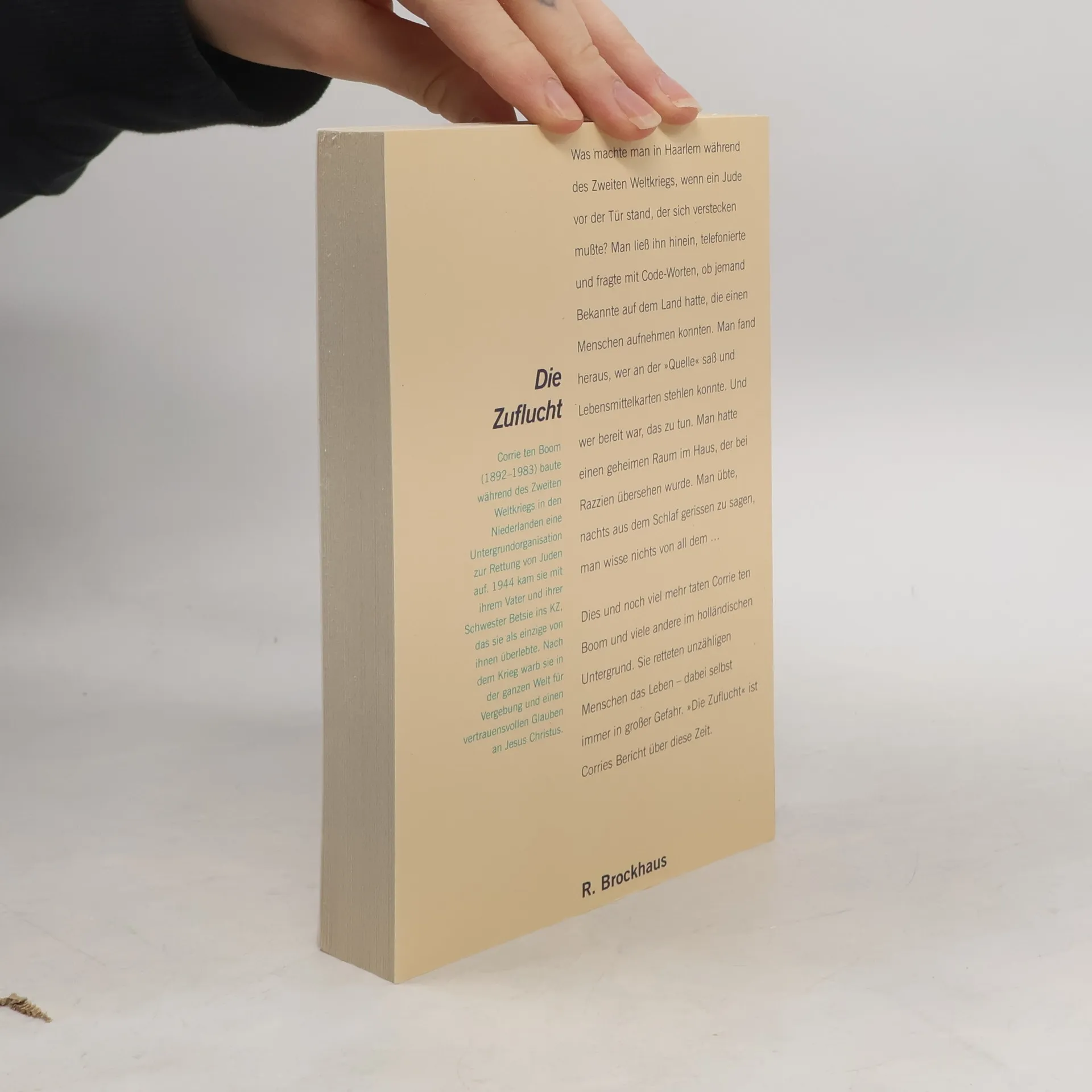 Was machte man in Amsterdam während des Zweiten Weltkriegs, wenn ein Jude vor der Tür stand, der§sich verstecken musste? Man ließ ihn herein, telefonierte und versuchte mit Code-Worten, ihn auf dem§Land unterzubringen. Man hatte einen geheimen Raum im Haus, der bei Razzien übersehen wurde. Man§übte, nachts aus dem Schlaf gerissen zu sagen: Man wisse von nichts.§Corrie ten Boom (1892 1983) erzählt, wie sie mit ihrer ganzen Familie Verfolgten Schutz bietet,§selbst zur Verfolgten wird und schließlich 1944 im KZ Ravensbrück inhaftiert wird. Anders als ihre§Schwester überlebt sie die Qualen und kommt 1945 frei. Trotz alledem ist sie nach dem Krieg weltweit§als Botschafterin der Versöhnung unterwegs. Für ihren Einsatz wurde sie mehrfach ausgezeichnet. Von§der Holocaustgedenkstätte Yad Vashem erhielt sie den Ehrentitel Gerechte unter den Völkern , und§die niederländische Königin verlieh ihr den Orden von Oranien-Nassau .§Der internationale Bestseller erscheint in der 31. deutschen Auflage erstmalig in einem größeren§Format.