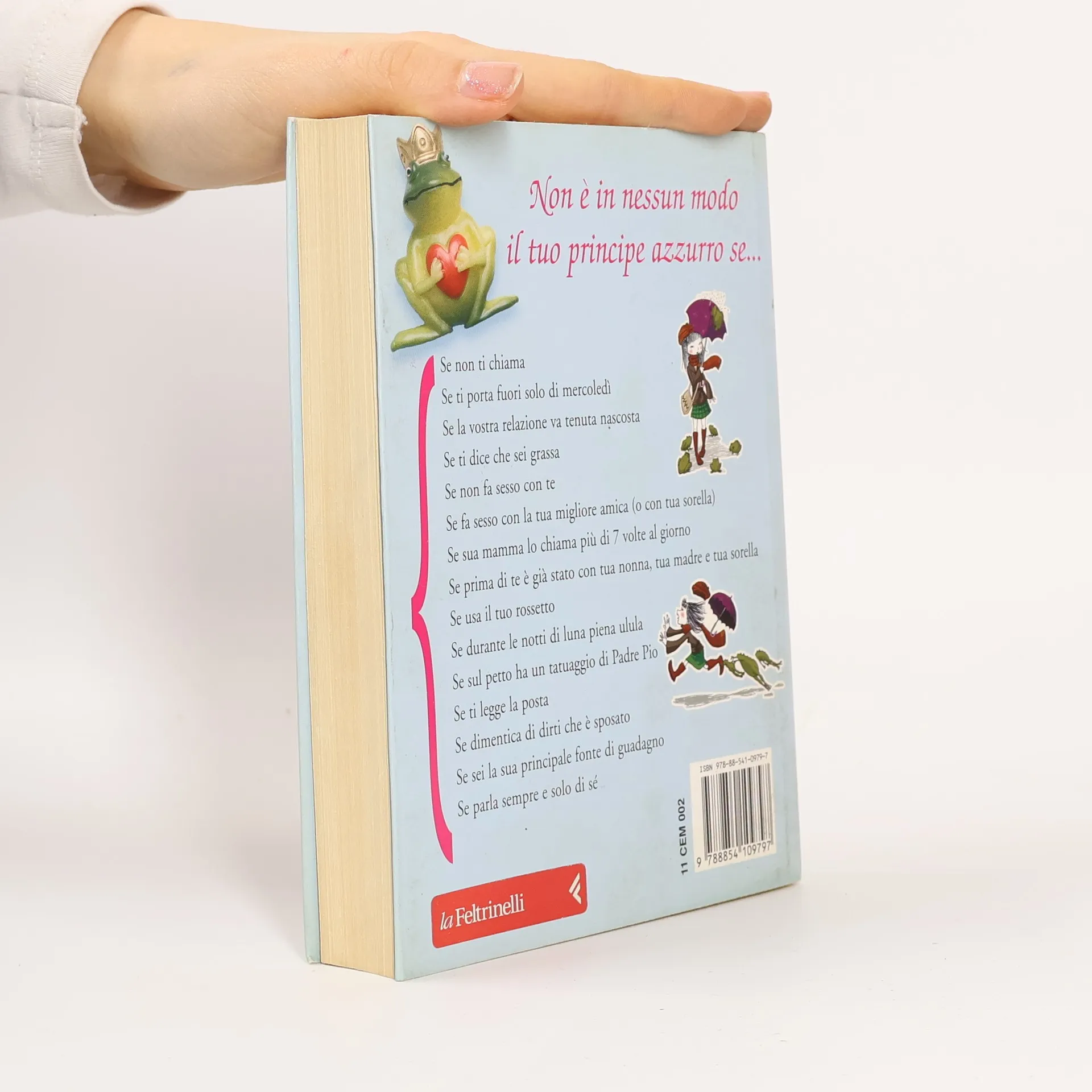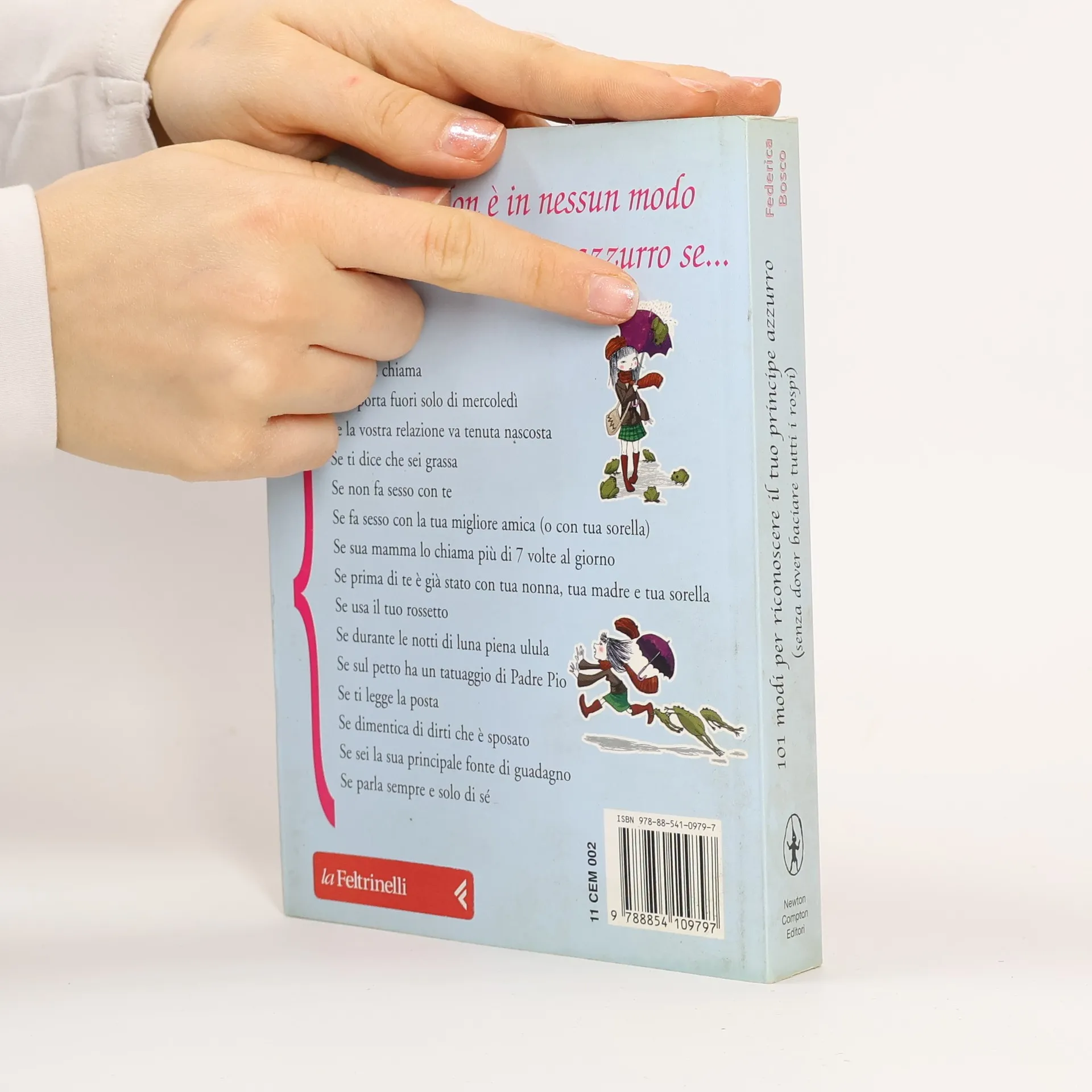 Il “principe azzurro” è decisamente fuori moda nel terzo millennio: un tizio su un cavallo bianco, con la calzamaglia e la piuma sul cappello davanti a una metropolitana non è il massimo dell’erotismo… Eppure tra le mille insidie di tutti i rospi del mondo si nascondono ancora degli uomini che possono fare di una semplice donna una principessa, ma per trovarli bisogna imparare a scartare tutti gli altri. Ecco allora i 101 preziosissimi consigli contenuti in questo libro per capire come riconoscere un principe azzurro e scappare a gambe levate davanti agli inaffi dabili, ai mammoni, agli sposati, agli egoisti, ai prepotenti e ai pazzi. Questo “manuale di sopravvivenza” nasce dalla volontà di Federica Bosco di condividere con le lettrici la sua esperienza, quella delle sue amiche e delle tante ragazze che le hanno scritto in questi anni per raccontare i fallimenti e le frustrazioni di chi si ostina a voler per forza cavare sangue da una rapa, affi nché nessuno vi dica più: «Ma li trovi tutti tu quelli strani?». Non è in nessun modo il tuo principe azzurro se... Se non ti chiama Se ti porta fuori solo di mercoledì Se la vostra relazione va tenuta nascosta Se ti dice he sei grassa Se non fa sesso con te Se fa sesso con la tua migliore amica (o con tua sorella) Se sua mamma lo chiama più di 7 volte al giorno Se prima di te è già stato con tua nonna, tua madre e tua sorella Se usa il tuo rossetto Se durante le notti di luna piena ulula Se sul petto ha un tatuaggio di Padre Pio Se ti legge la posta Se dimentica di dirti che è sposato Se sei la sua principale fonte di guadagno Se parla sempre e solo di sé
