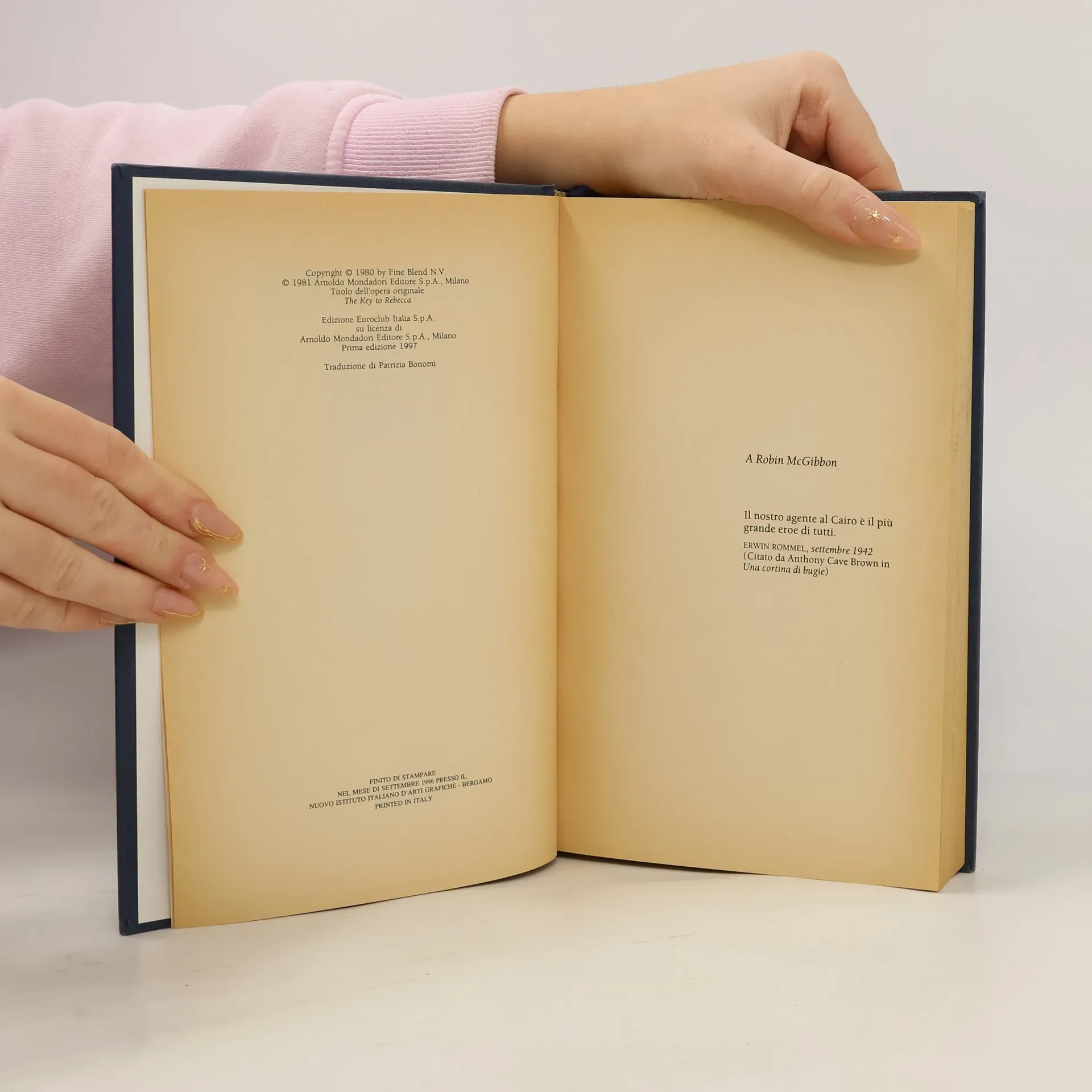 Estate 1942, Nord Africa. Rommel ha accerchiato le truppe britanniche con una campagna militare che per gli Alleati si è rivelata disastrosa. Il generale tedesco sembra imbattibile. La sua arma segreta è una spia assolutamente fuori dal comune, Alex Wolff, il cui compito è quello di impadronirsi dei piani strategici dell'esercito britannico e comunicarli direttamente a Rommel servendosi di un codice la cui chiave è nascosta tra le pagine di "Rebecca", il famoso romanzo di Daphne du Maurier. Le sorti della guerra stanno per cambiare e la Germania nazista presto avrà il sopravvento, a meno che un ufficiale inglese, il maggiore Vandam, non riesca ad impedirlo, fermando Wolff e carpendogli la chiave del codice segreto... Uno straordinario thriller ambientato negli anni più caldi della Seconda guerra mondiale, un altro grande successo di Ken Follet.