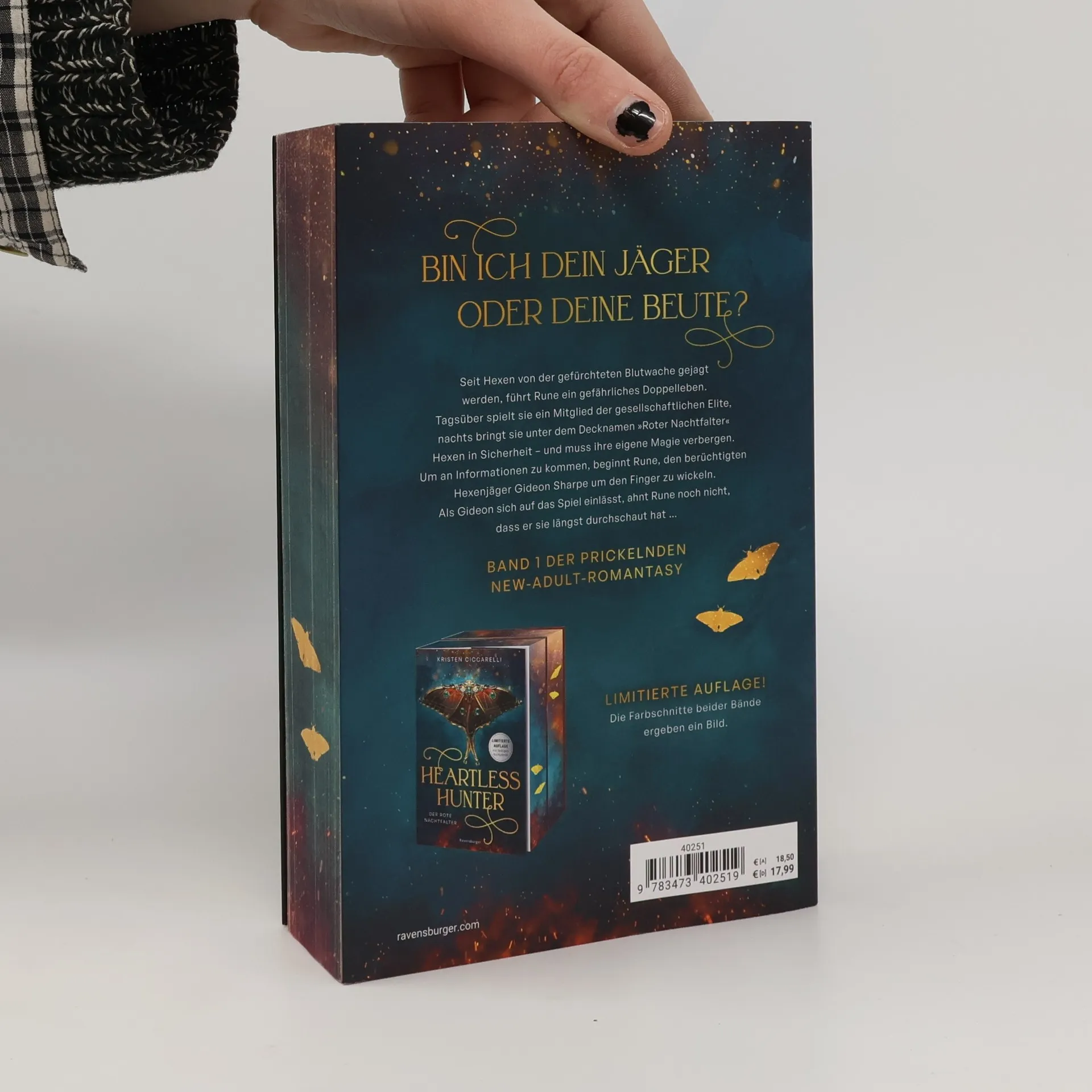 *** Limitierte Auflage mit farbigem Buchschnitt! Nur solange der Vorrat reicht! *** Bin ich dein Jäger oder deine Beute? Seit Hexen von der gefürchteten Blutwache gejagt werden, führt Rune ein gefährliches Doppelleben. Tagsüber spielt sie ein Mitglied der gesellschaftlichen Elite, nachts bringt sie unter dem Decknamen „Roter Nachtfalter“ Hexen in Sicherheit – und muss ihre eigene Magie verbergen. Um an Informationen zu kommen, beginnt Rune, den berüchtigten Hexenjäger Gideon Sharpe um den Finger zu wickeln. Als Gideon sich auf das knisternde Spiel einlässt, ahnt Rune noch nicht, dass er sie längst durchschaut hat.