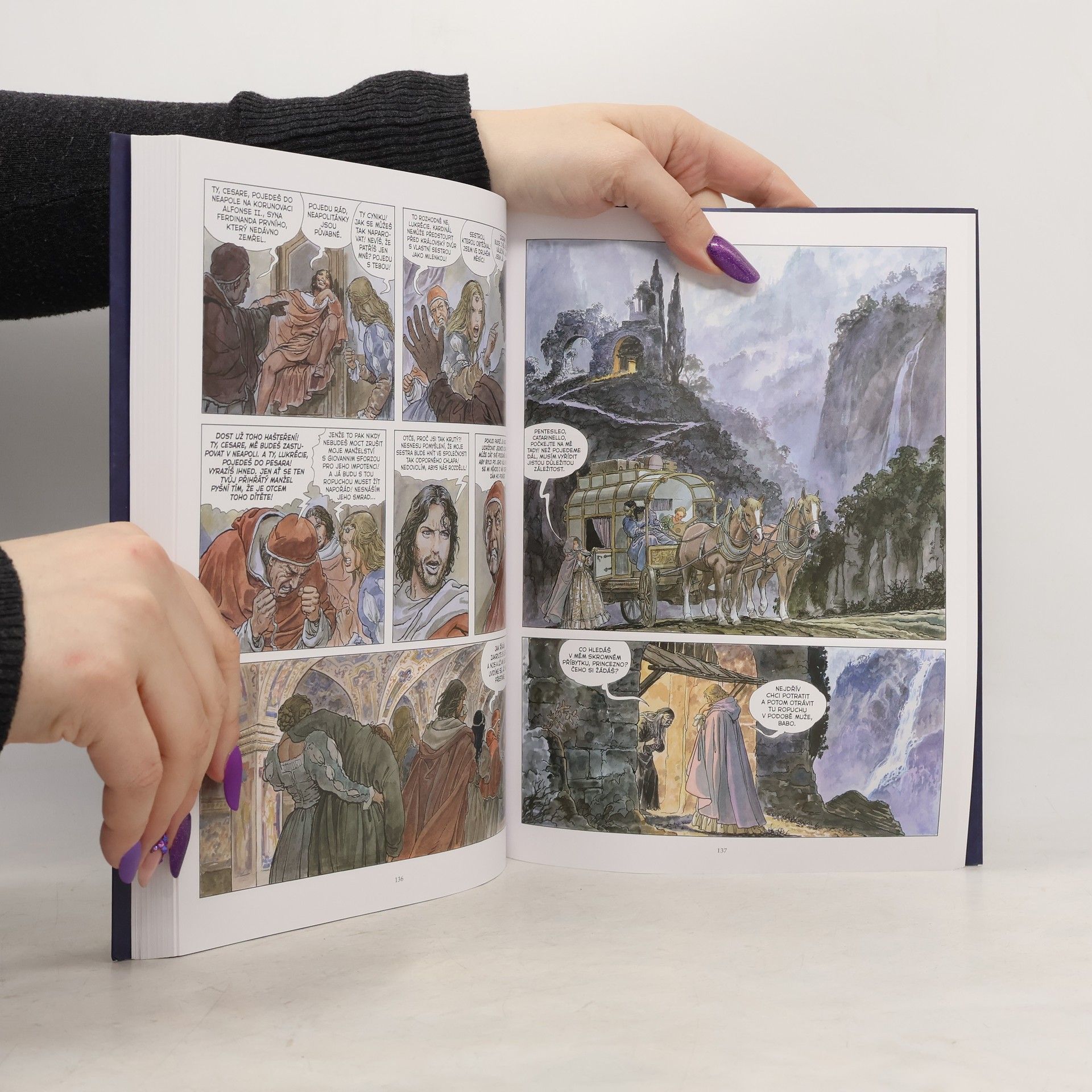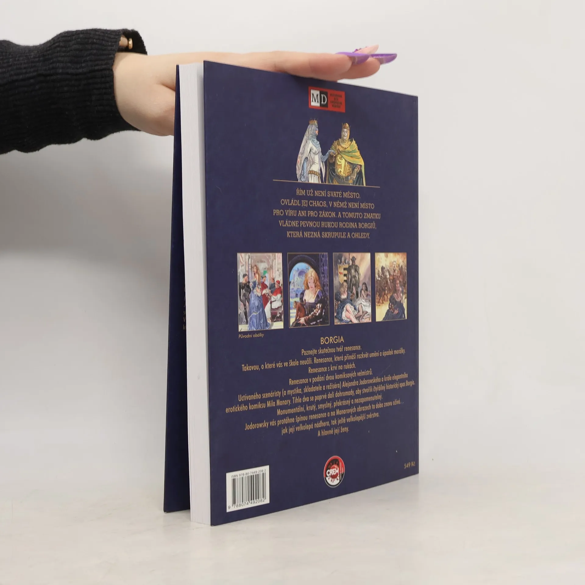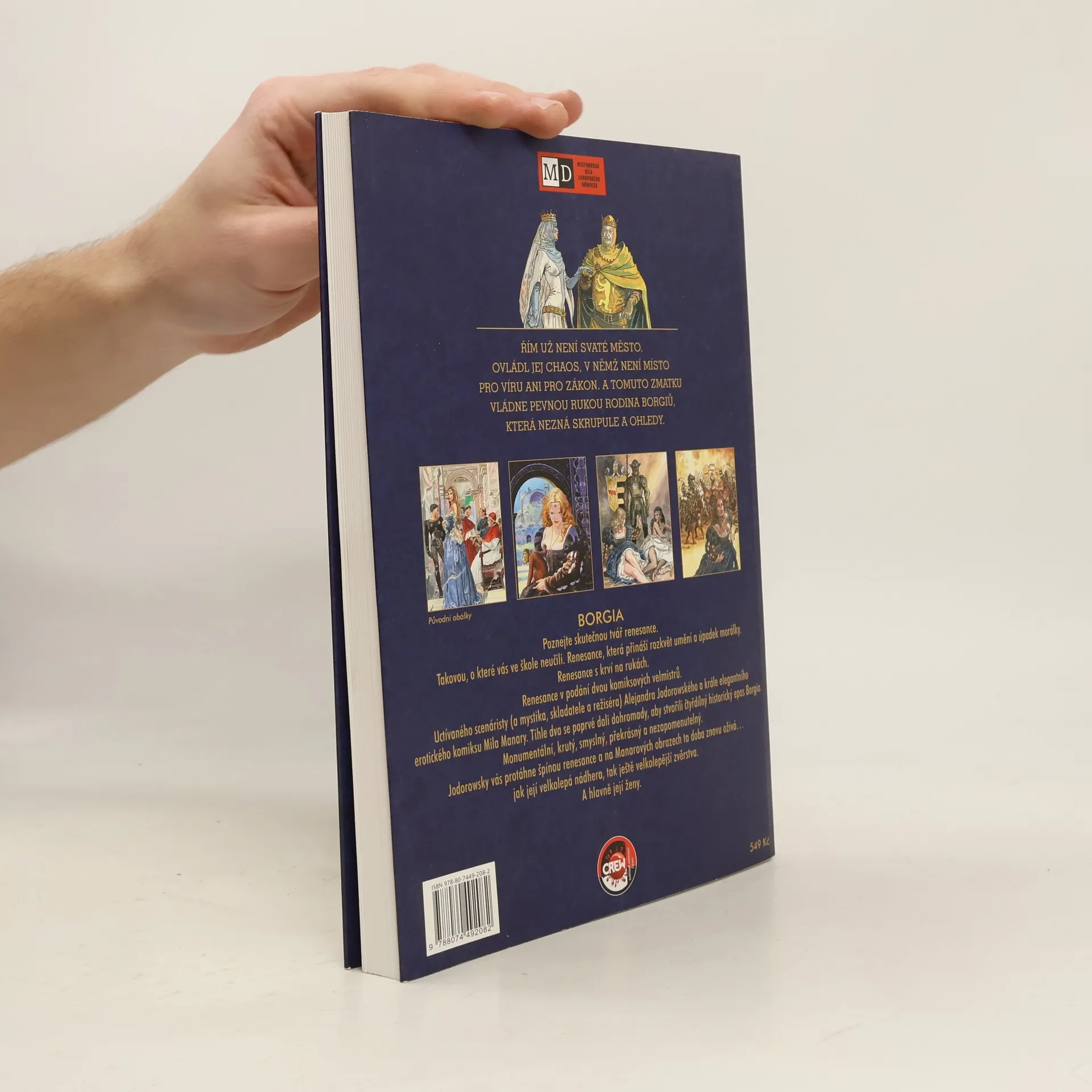 Řím už není svaté místo. Ovládl jej chaos, v němž není místo pro víru ani pro zákon. A tomuto zmatku vládne pevnou rukou rodina Borgiů, která nezná skrupule a ohledy. Poznejte skutečnou tvář renesance. Takovou, o které vás ve škole neučili. Renesance, která přináší rozkvět umění a úpadek morálky. Renesance s krví na rukách. Renesance v podání dvou komiksových velmistrů. Uctívaného scenáristy (a mystika, skladatele a režiséra) Alexandra Jodorowského a krále elegantního erotického komiksu Mila Manary. Tihle dva se poprvé dali dohromady, aby stvořili čtyřdílný historický epos Borgia. Monumentální, krutý, smyslný, překrásný a nezapomenutelný. Jodorowsky vás protáhne špínou renesance a na Manarových obrazech ta doba znovu užívá... jak její velkolepá nádhera, tak ještě velkolepější zvěrstva. A hlavně její ženy.