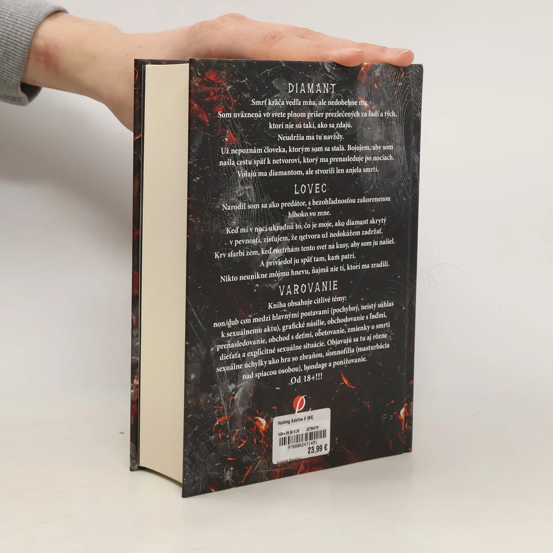 Varovanie: druhý diel duetu HUNTING ADELINE od H.D.Carlton je oveľa temnejší ako prvý a vtiahne vás viac do sveta obchodu s ľuďmi, ktorý je plný týrania, mučenia, ponižovania a zabíjania. OD 18 ROKOV!!!! Diamant Smrť kráča vedľa mňa, ale nedobehne ma. Som uväznená vo svete plnom príšer prezlečených za ľudí a tých, ktorí nie sú takí, ako sa zdajú. Neudržia ma tu navždy. Už nepoznám človeka, ktorým som sa stala. Bojujem, aby som našla cestu späť k netvorovi, ktorá ma prenasleduje po nociach. Volajú ma diamantom, ale stvorili len anjela smrti. Lovec Narodil som sa ako predátor, s bezohľadnosťou zakorenenú hlboko vo mne. Keď mi v noci ukradnú to, čo je moje, ako diamant skrytý v pevnosti, zisťujem, že netvora už nedokážem zadržať. Krv sfarbí zem, keď roztrhám tento svet na kusy, aby som ju našiel. A priviedol ju späť tam, kam patrí. Nikto neunikne môjmu hnevu, najmä nie tí, ktorí ma zradili. Varovanie: kniha obsahuje citlivé témy: non/dub con medzi hlavnými postavami (pochybný, neistý súhlas k sexuálnemu aktu), grafické násilie, obchodovanie s ľuďmi, prenasledovanie, obchod s deťmi, obetovanie, zmienky o smrti dieťaťa a explicitné sexuálne situácie. Objavujú sa tu aj rôzne sexuálne úchylky ako hra so zbraňou, somnofília (masturbácia nad spiacou osobou), bondage a ponižovanie.
